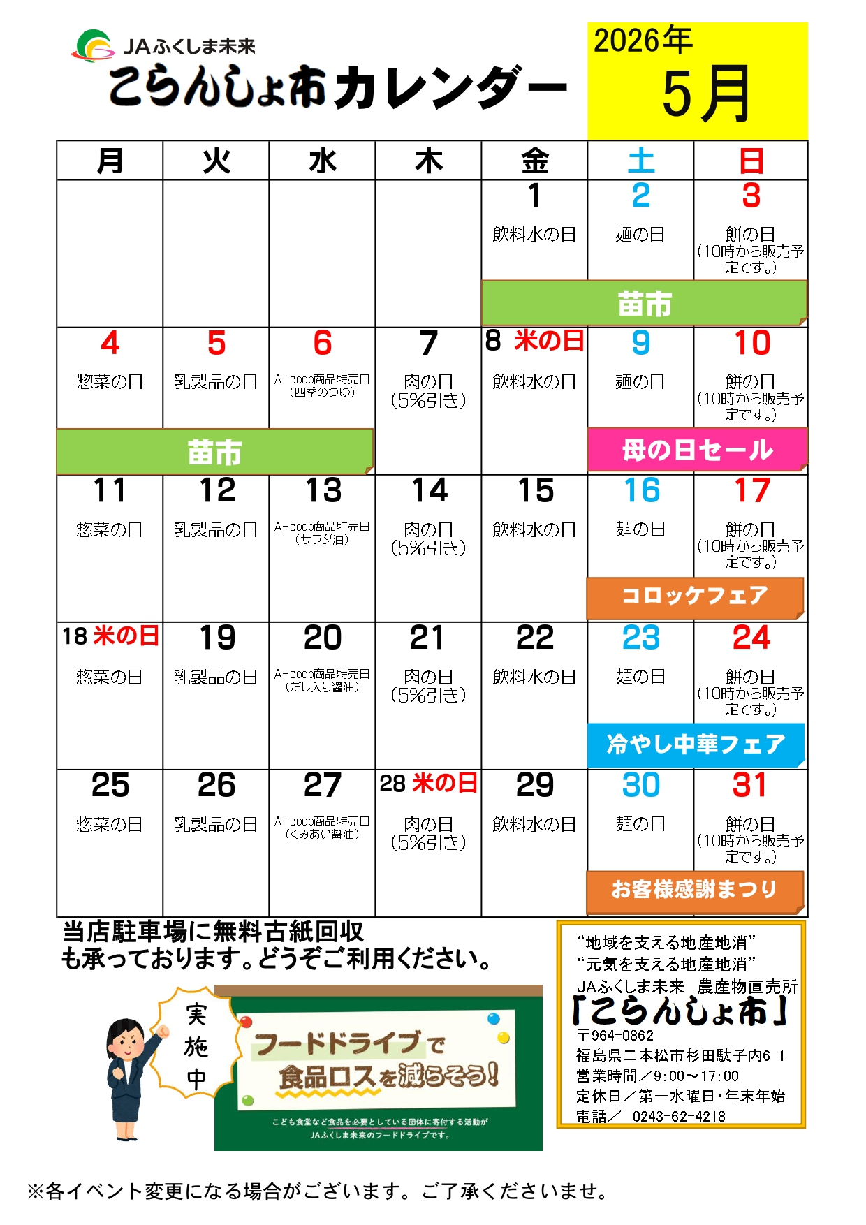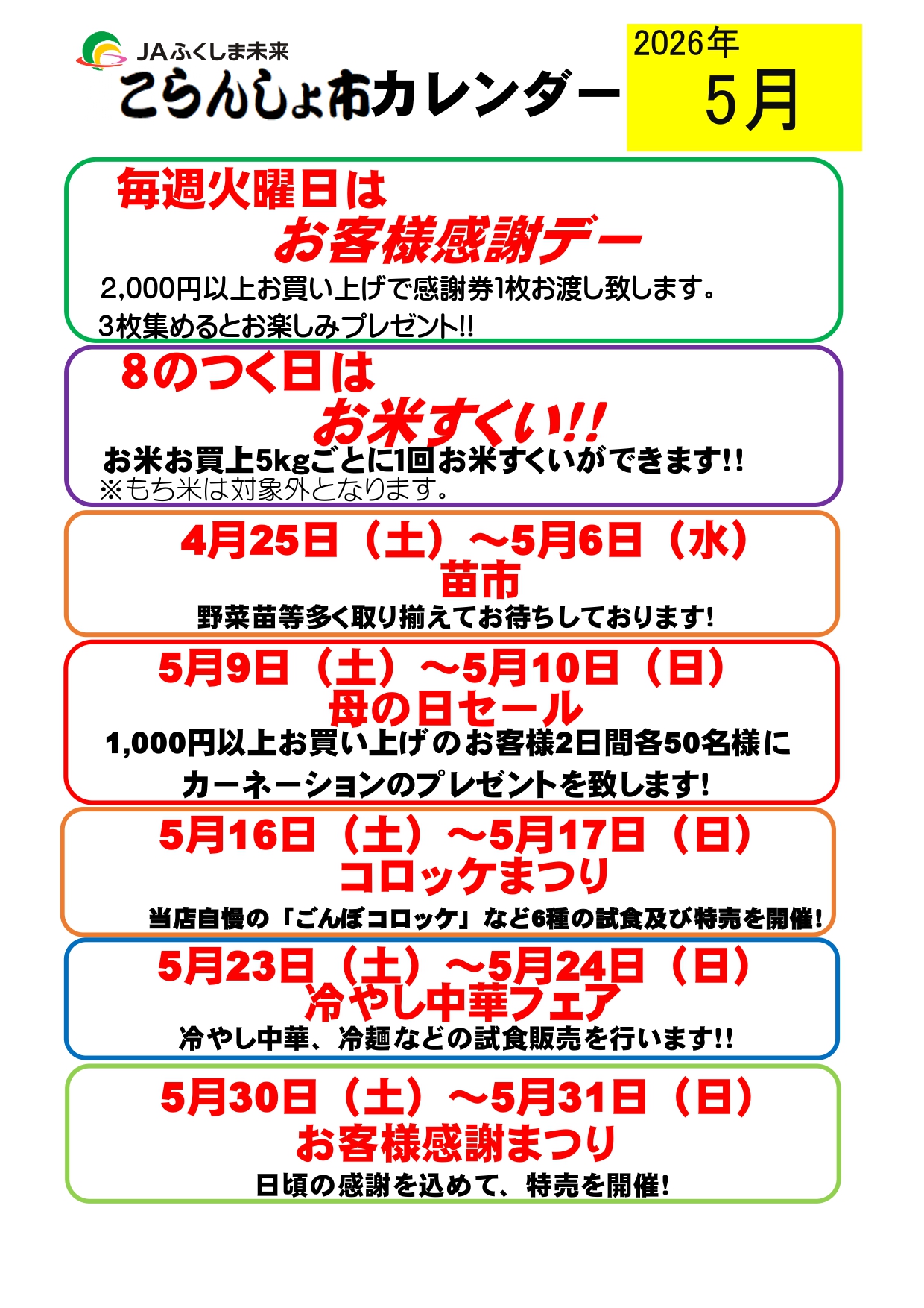 農産物直売所「こらんしょ市二本松店」5月イベントカレンダー