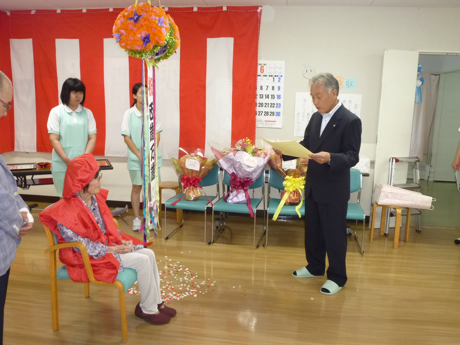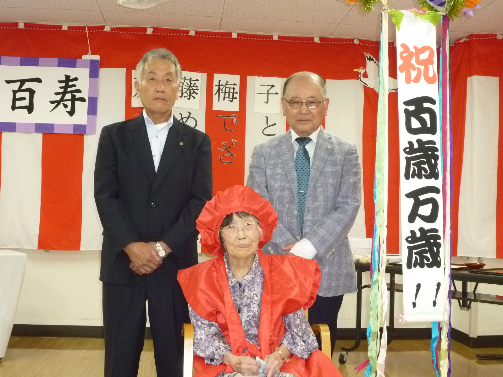 相馬市の建藤梅子さんが6月27日に100歳の誕生日を迎えたため、介護老人保健施設ベテランズサークルで長寿の祝いを行いました。当JAの山田秀晴理事が、感謝状と記念品を贈呈しました。