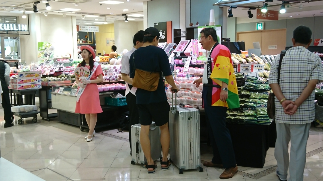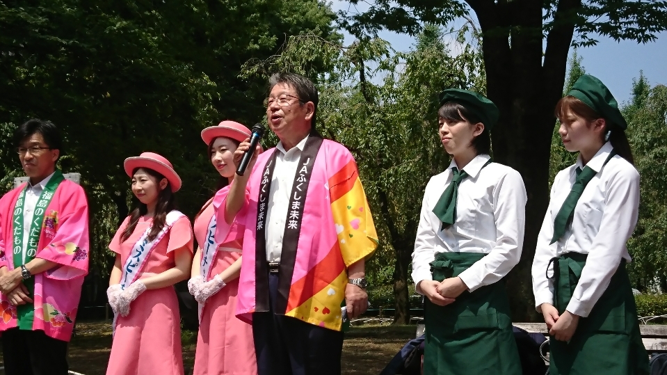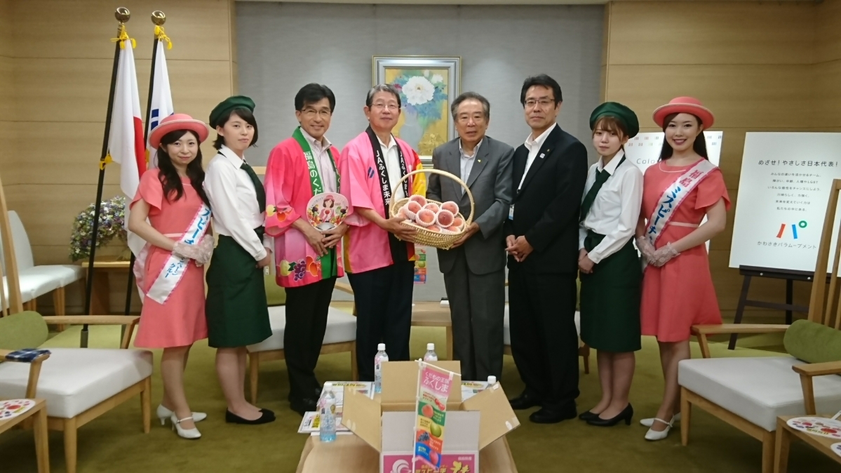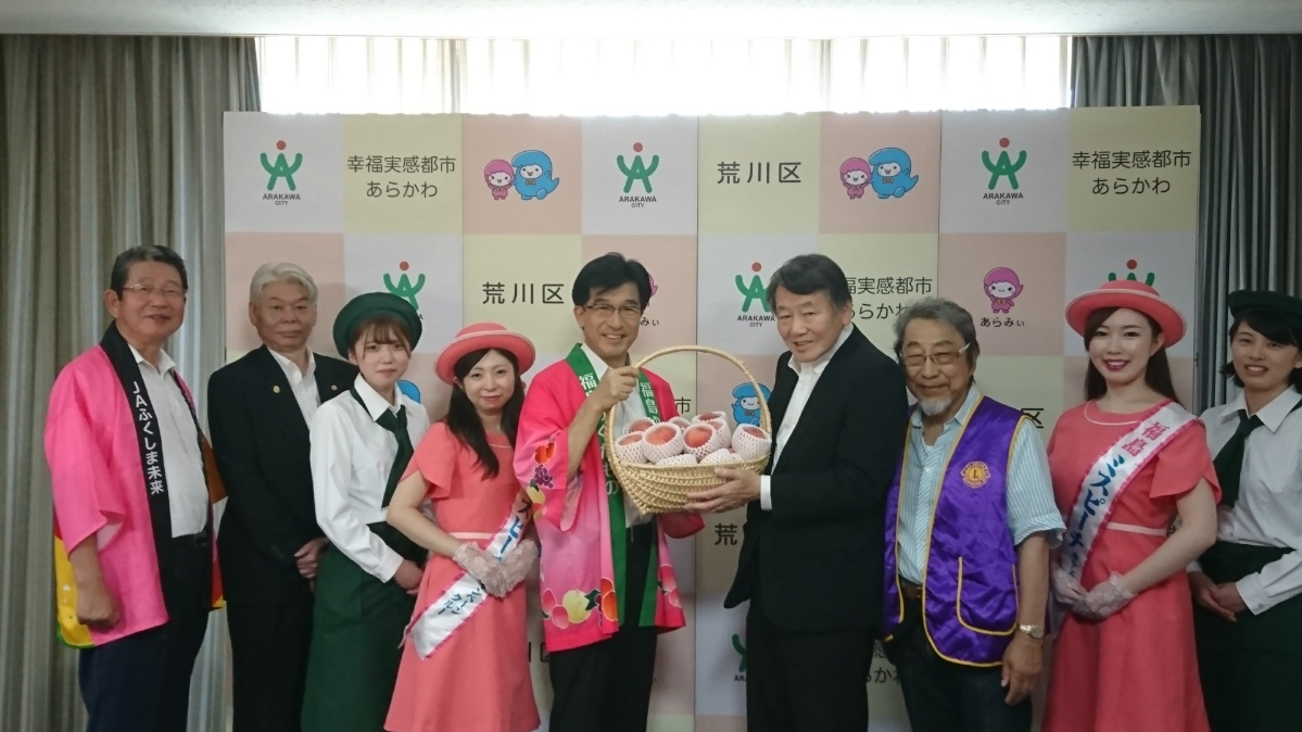福島くだもの消費拡大委員会は22日から24日まで京浜地区で桃のトップセールスを行いました。福島市の木幡浩市長や当JAの菅野孝志組合長などが川崎市や新宿区などを訪れ、桃の収穫最盛期の訪れをアピールしました。