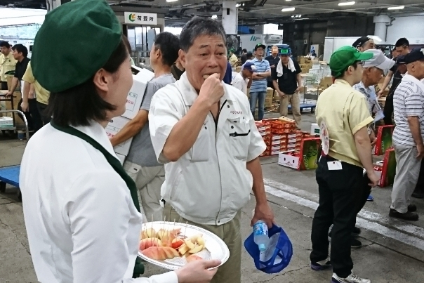 24日の早朝には新宿ベジフル株式会社を訪れ、市場内でセリ台スピーチや試食を行いました。その後、荒川区役所で東京荒川西ライオンズクラブと荒川区による桃販売会への参加や西川太一郎区長への表敬訪問を行いました。