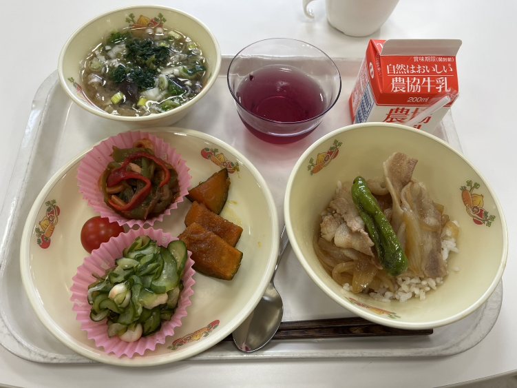 特別メニューは国産豚肉を使用した「ぶた丼」、なす、空心菜、油揚げを使った「季節野菜の味噌汁」、「かぼちゃの煮物」、「ピーマンの炒め物」、「きゅうりの酢の物」、「ぶどうゼリー」など、フードドライブで寄付された旬の野菜をふんだんに使用した献立です。