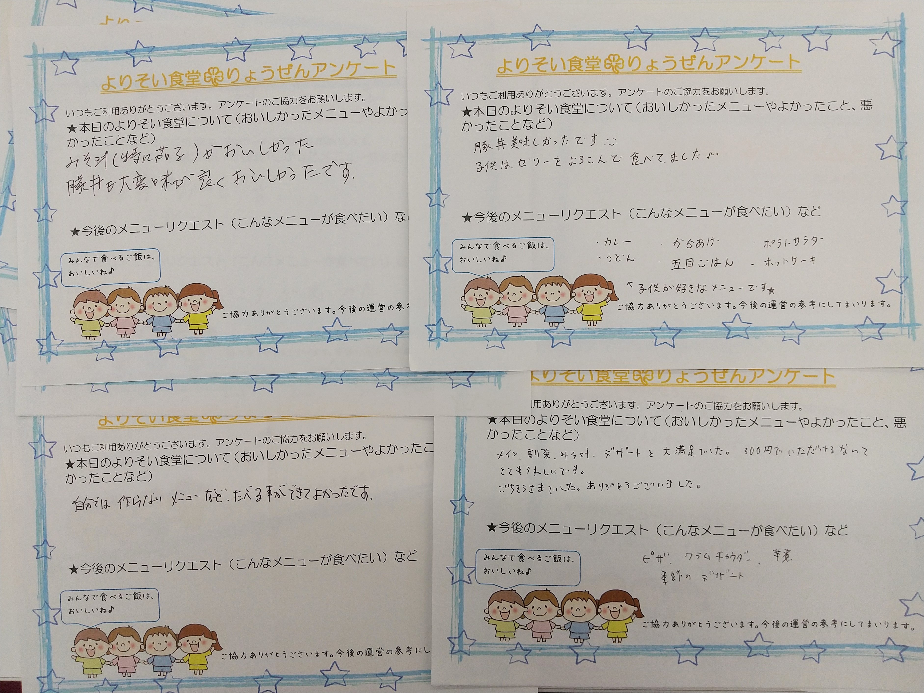 会場ではアンケートも実施され、リクエストのあったメニューは今後取り入れていきます。食堂は、毎月第2土曜日午前11時30分~大人300円 こども(中学生以下)無料。食事は50食限定で提供。次回は、10月11日の開催です。