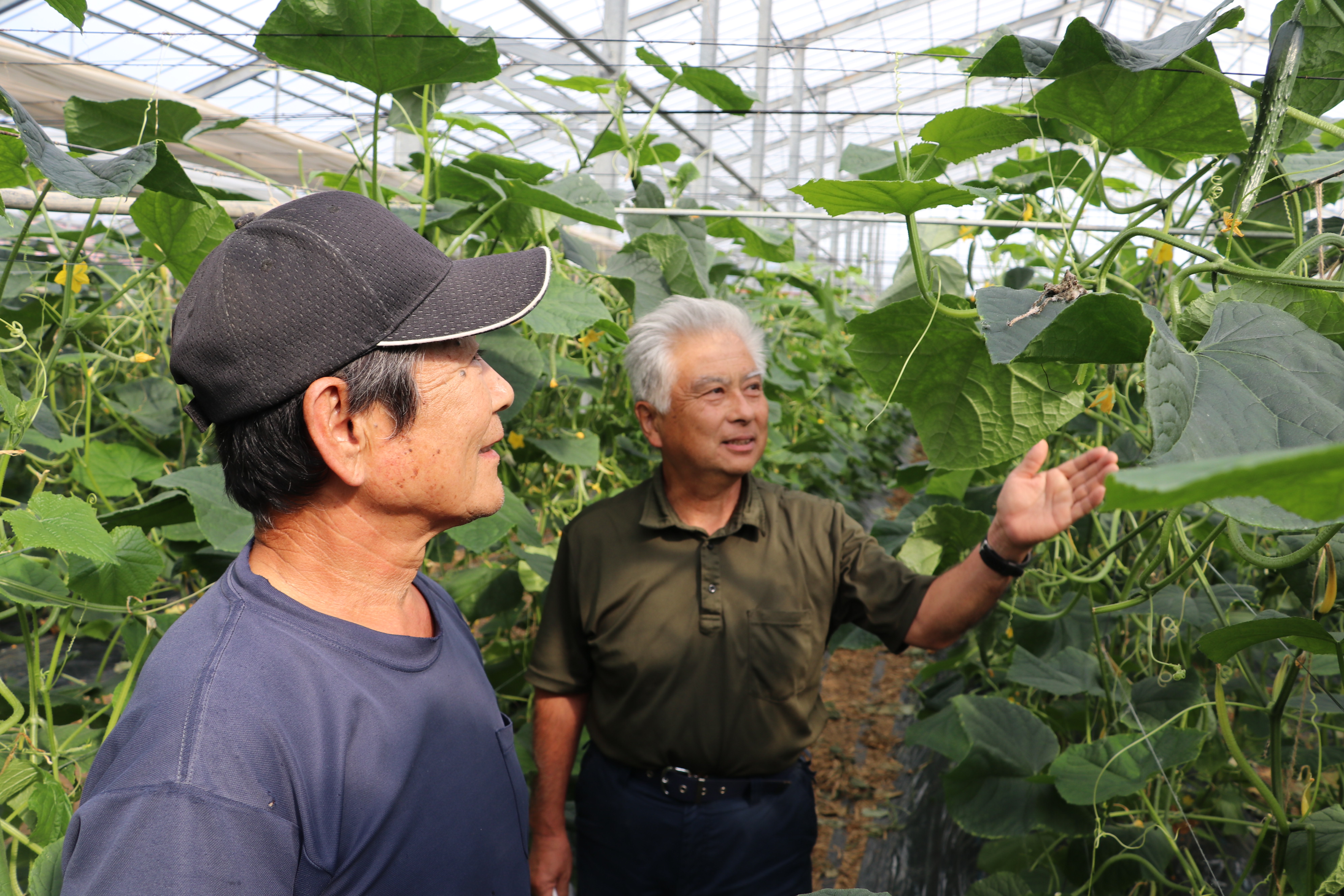 抑制キュウリは8月中旬から12月初旬が収穫期間です。同部会では、定期的に指導会を開催し高品質なキュウリ栽培に力を入れています。
