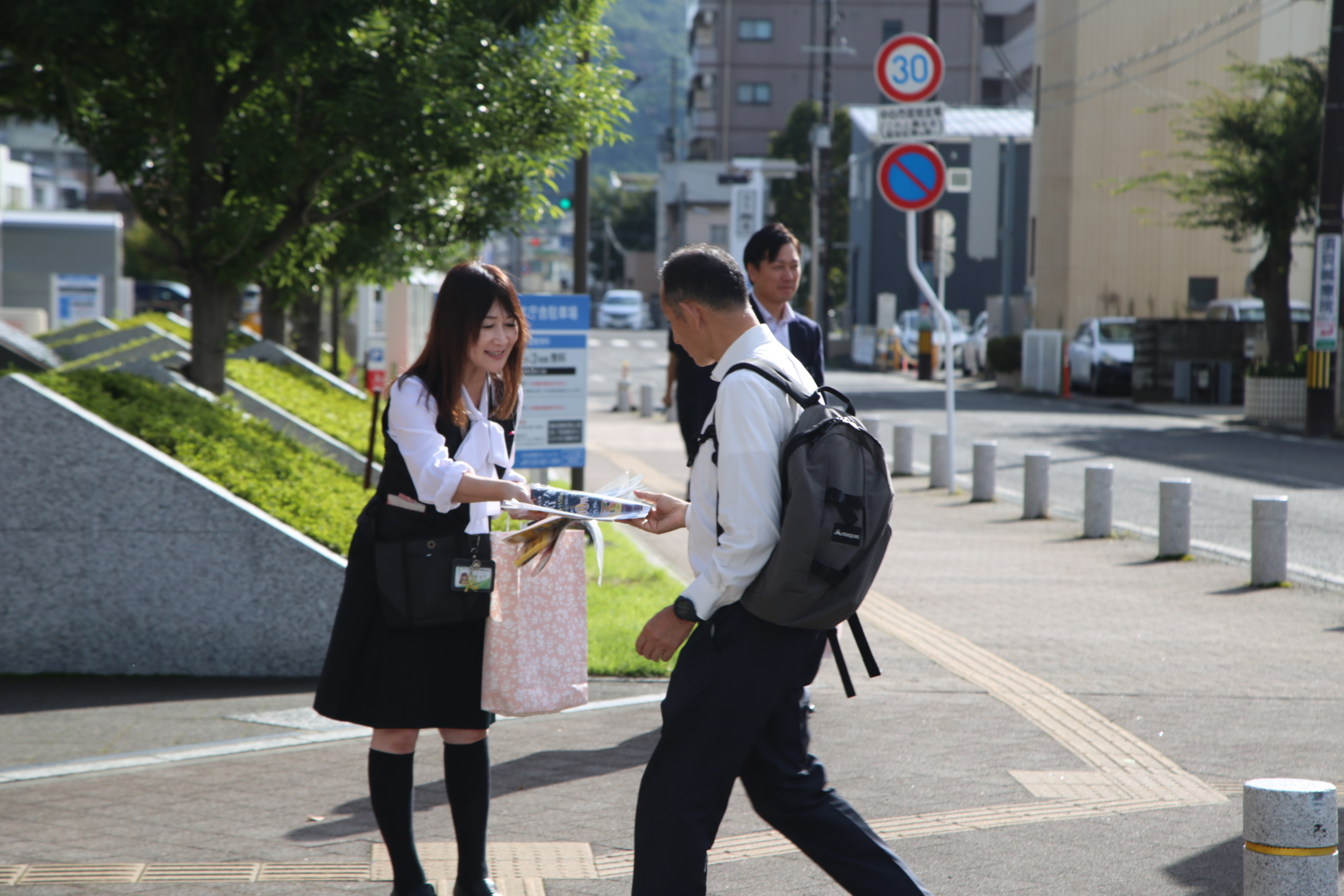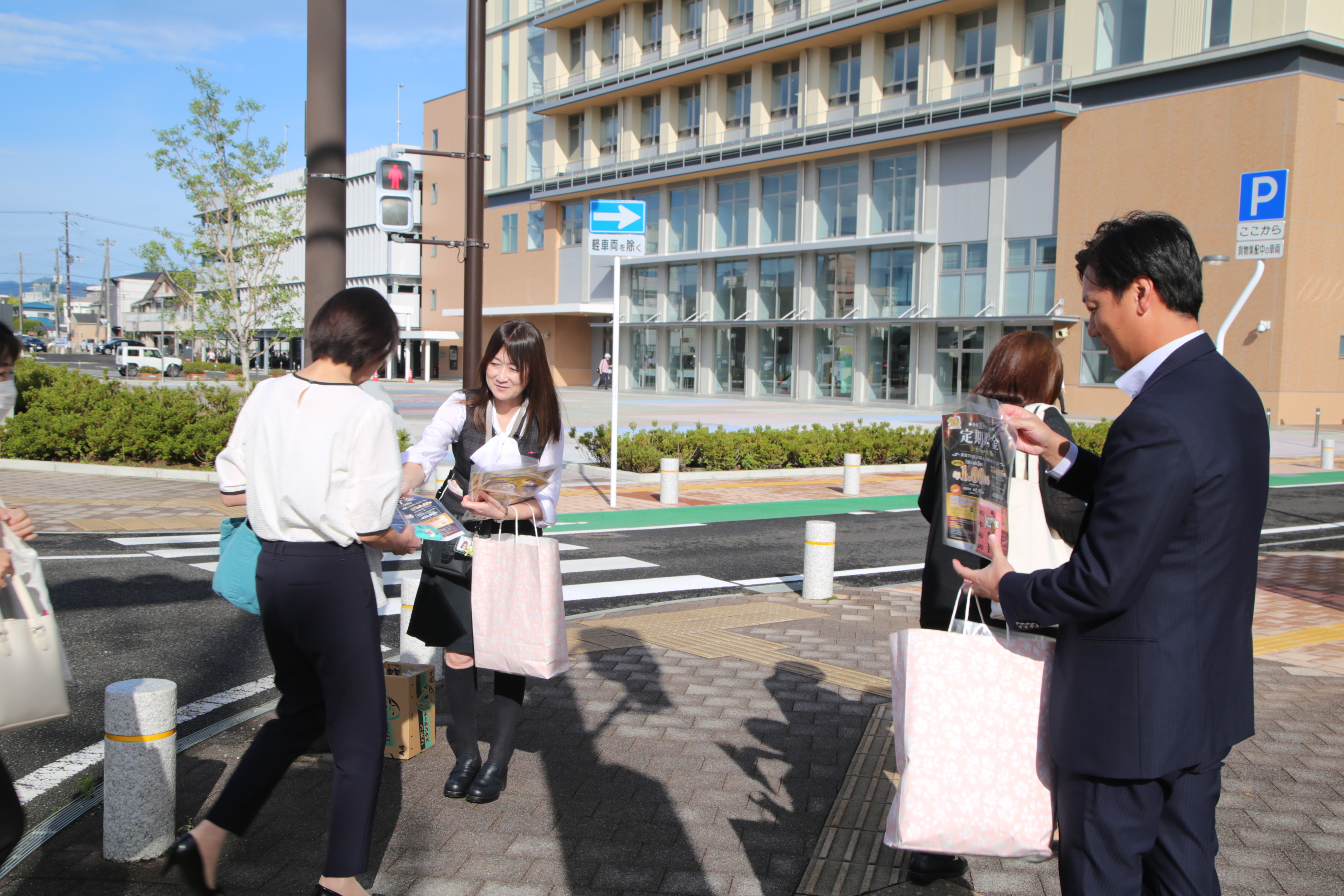 当JAは2日、合併10周年を記念した「懸賞付定期貯金」のPR活動として、福島市役所前で街頭キャンペーンを実施しました。金融部の職員など6人が、朝の通勤時間帯に市民へ記念定期貯金やJA共済の案内チラシ、ポケットティッシュを約400部配布し、利用を呼び掛けました。