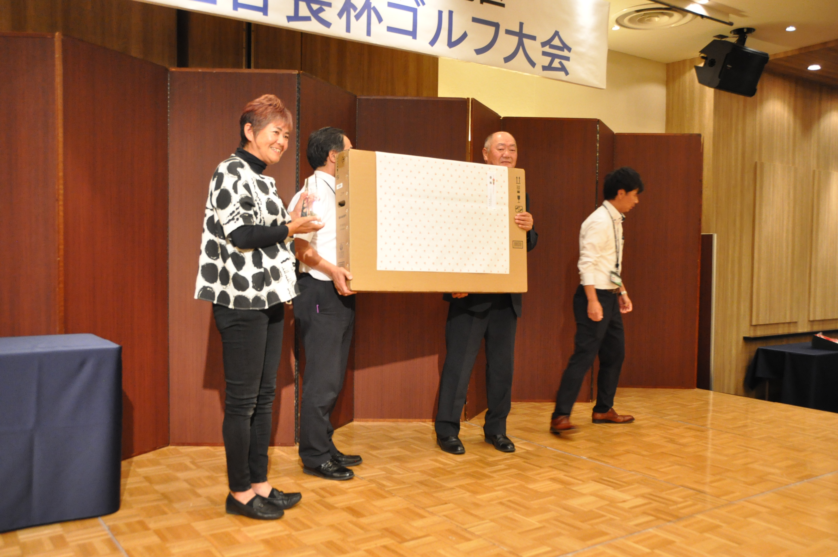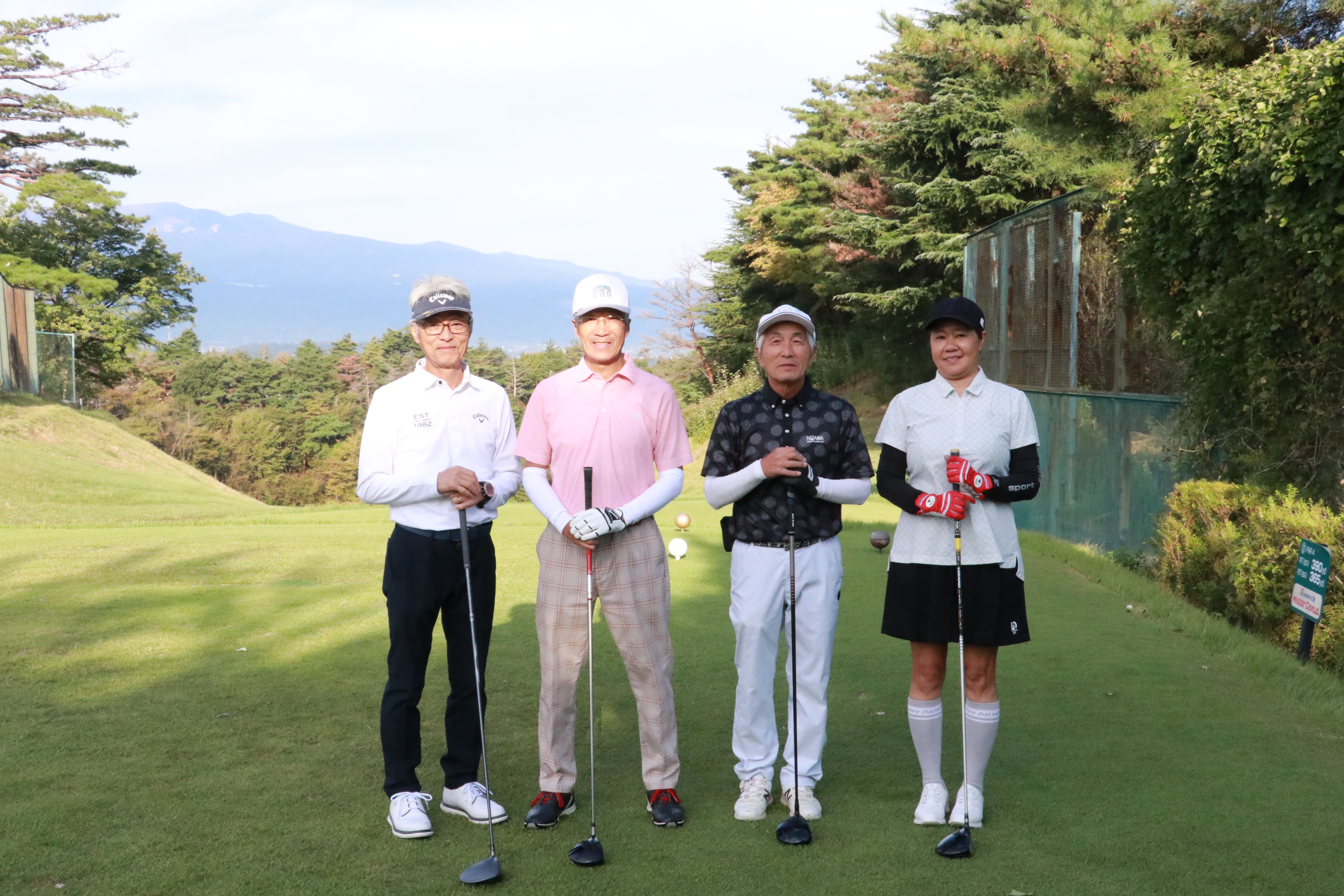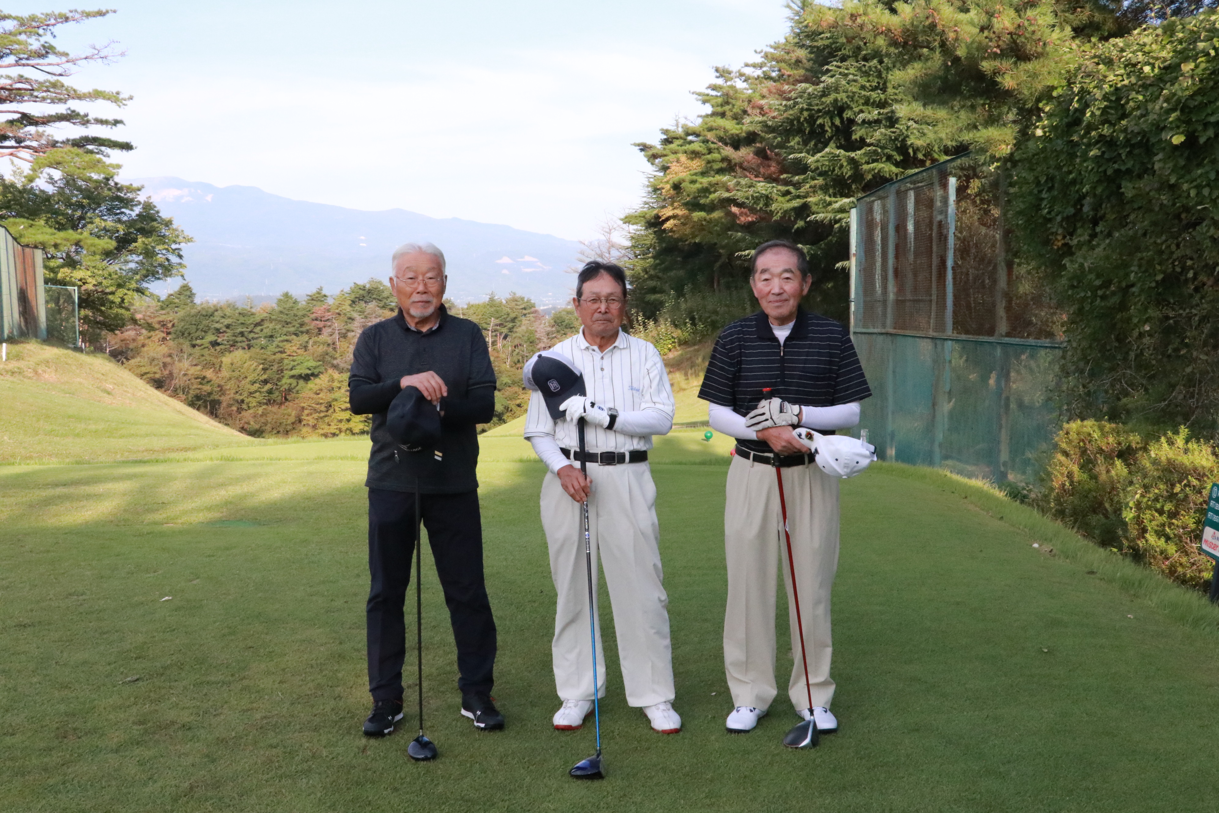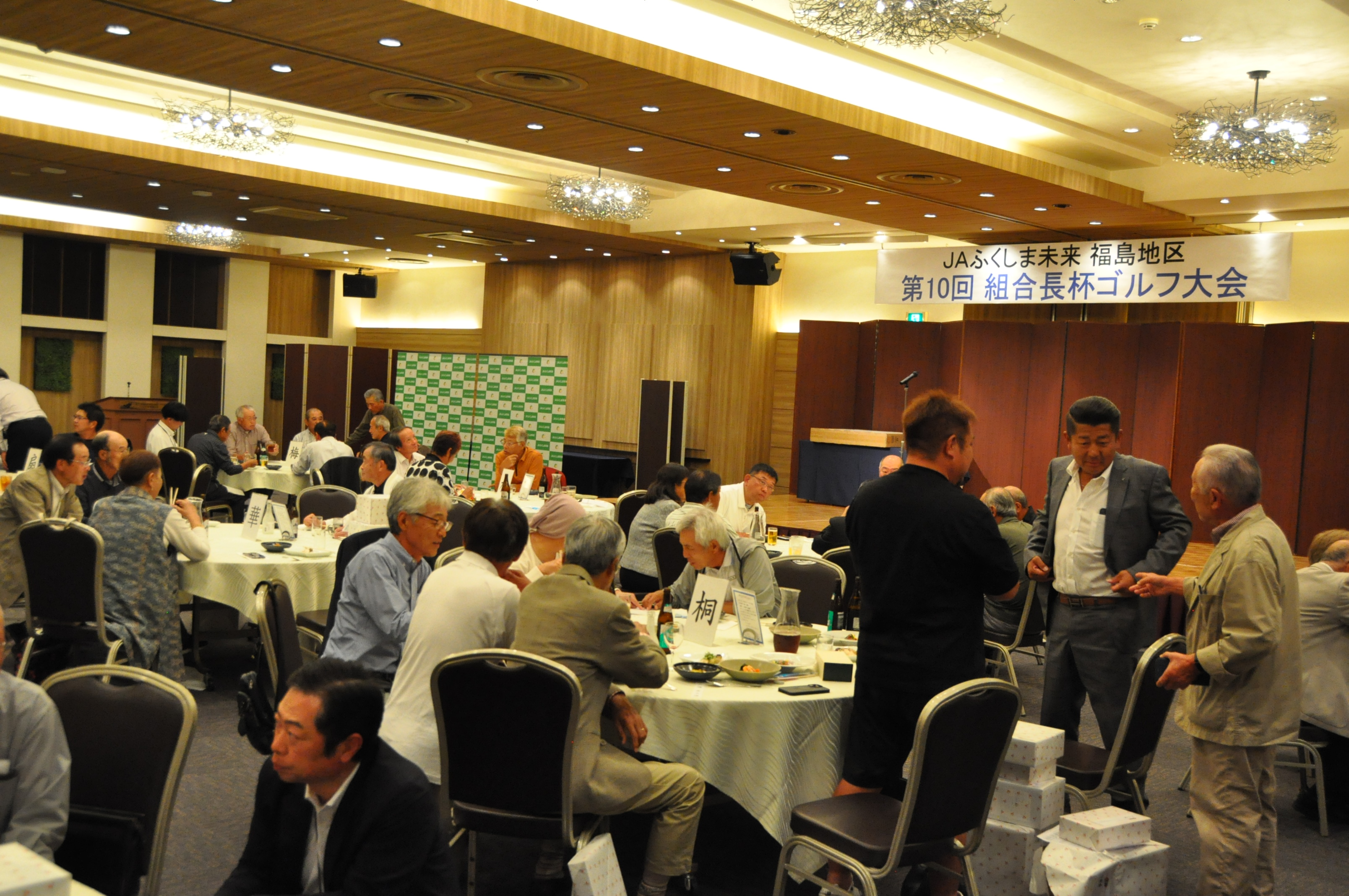 コンペは、アウト・インのそれぞれのコースよりスタートし18ホールでプレーを楽しみました。プレー終了後「ウェディングエルティ」にて表彰式を開きました。ドラコン・ニアピンなどのアトラクション、最高齢の参加者(高橋 祐一さん)には最高齢賞が贈られました。