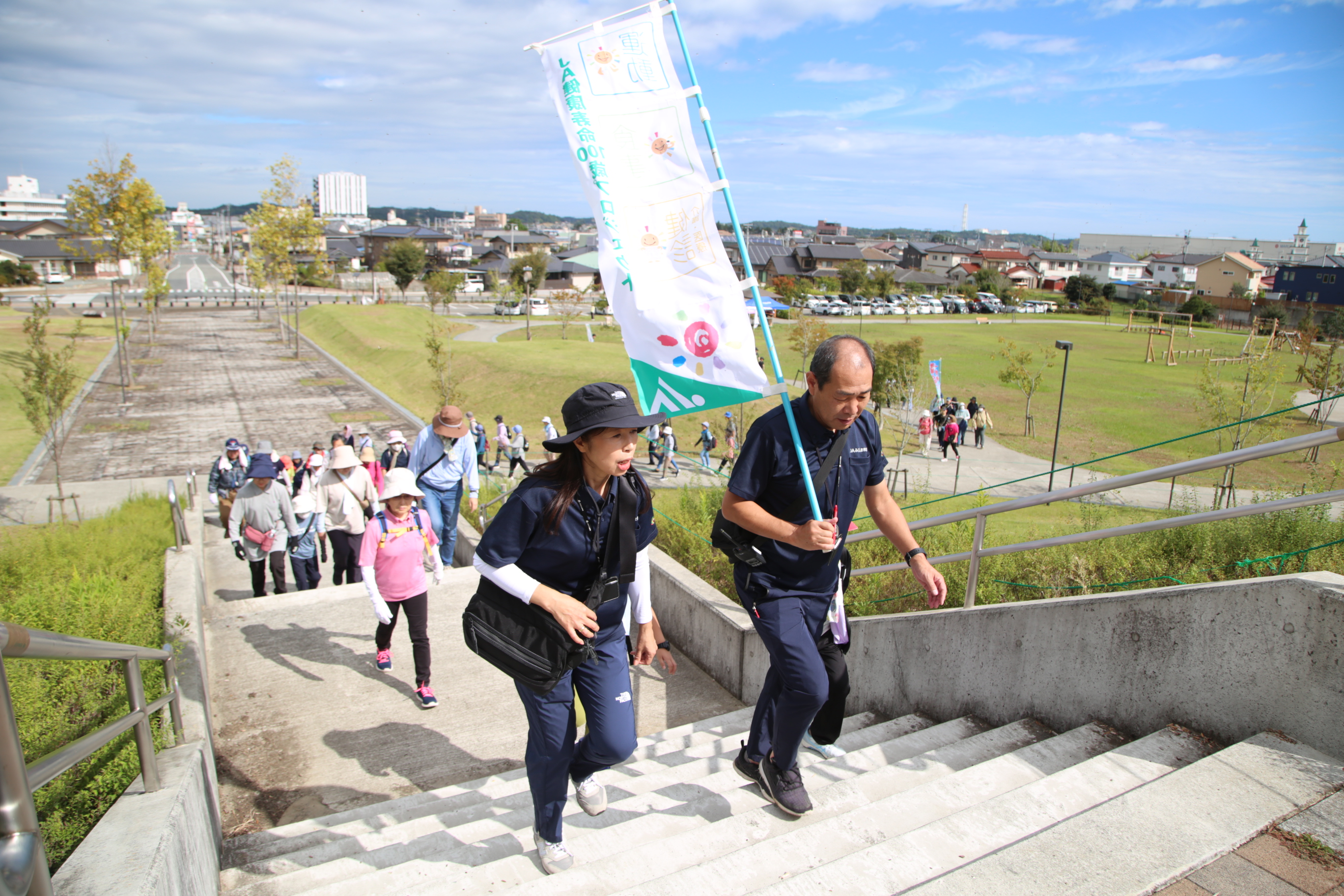 当JAそうま地区本部は5日、南相馬市原町区の東ヶ丘公園で「第2回いきいきウォーキング」を開催しました。地域住民ら110人が参加し、仲間とともに約5キロのコースを楽しく歩きました。