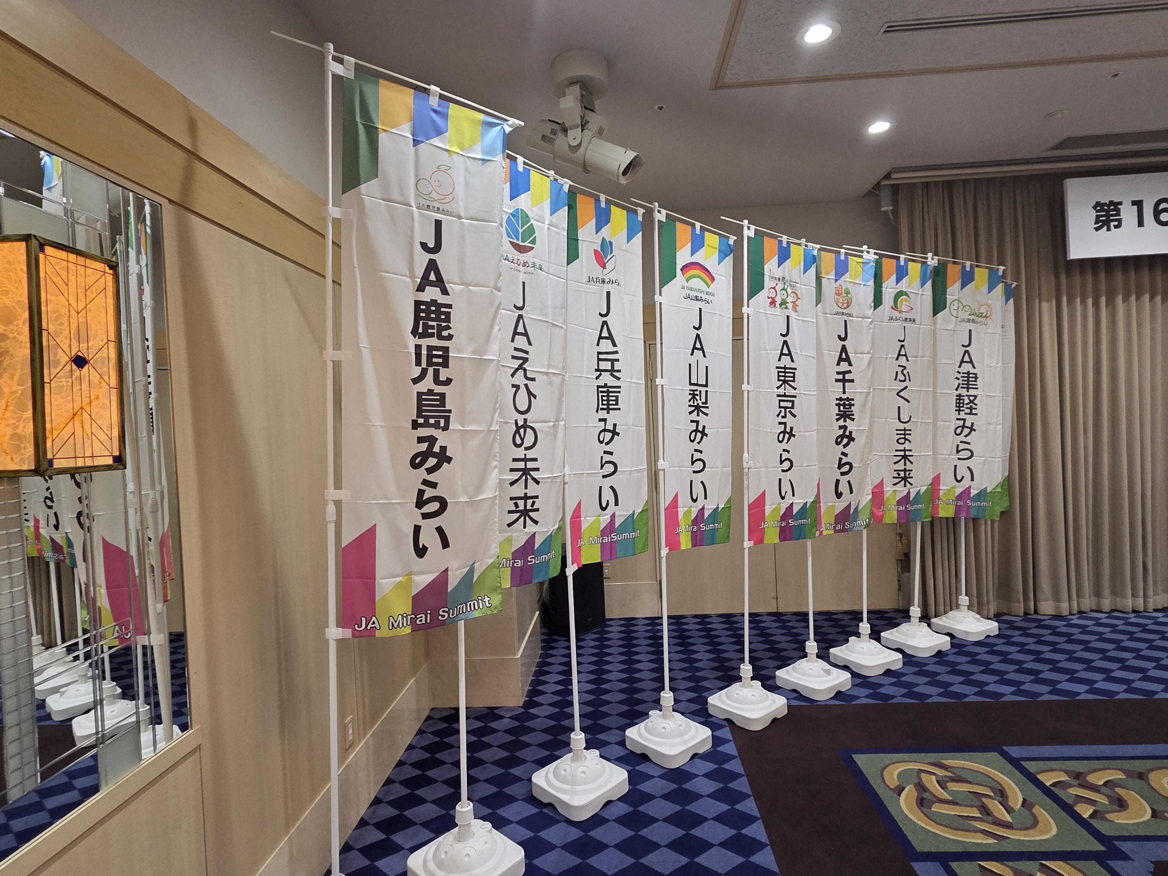 参加したJAは、きたみらい(北海道)、津軽みらい(青森県)、ふくしま未来、千葉みらい、東京みらい、山梨みらい、兵庫みらい、えひめ未来、鹿児島みらい。当JAからは、三津間一八組合長、加藤光一常務、稲本修一企画部長が参加しました。 サミットを主催したJAえひめ未来の岡部組合長は「このサミットを契機に地域農業・地域社会が大きく発展することを願う」とあいさつしました。