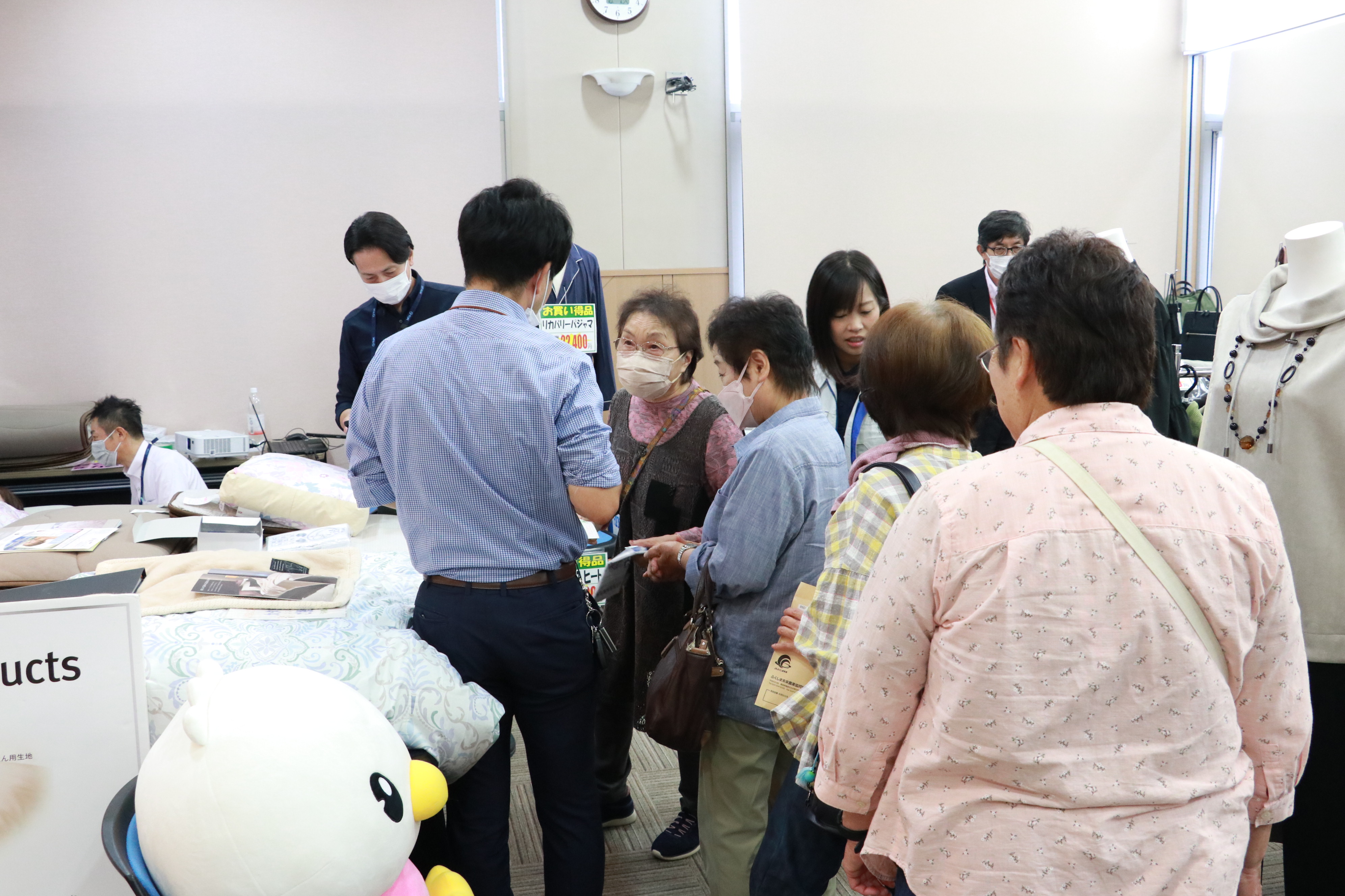 当JA福島地区本部は7日、当JA北信支店で「生活用品展示会」を開催しています。婦人服や紳士服をはじめとし、バック、衣服、寝具類などを販売しています。