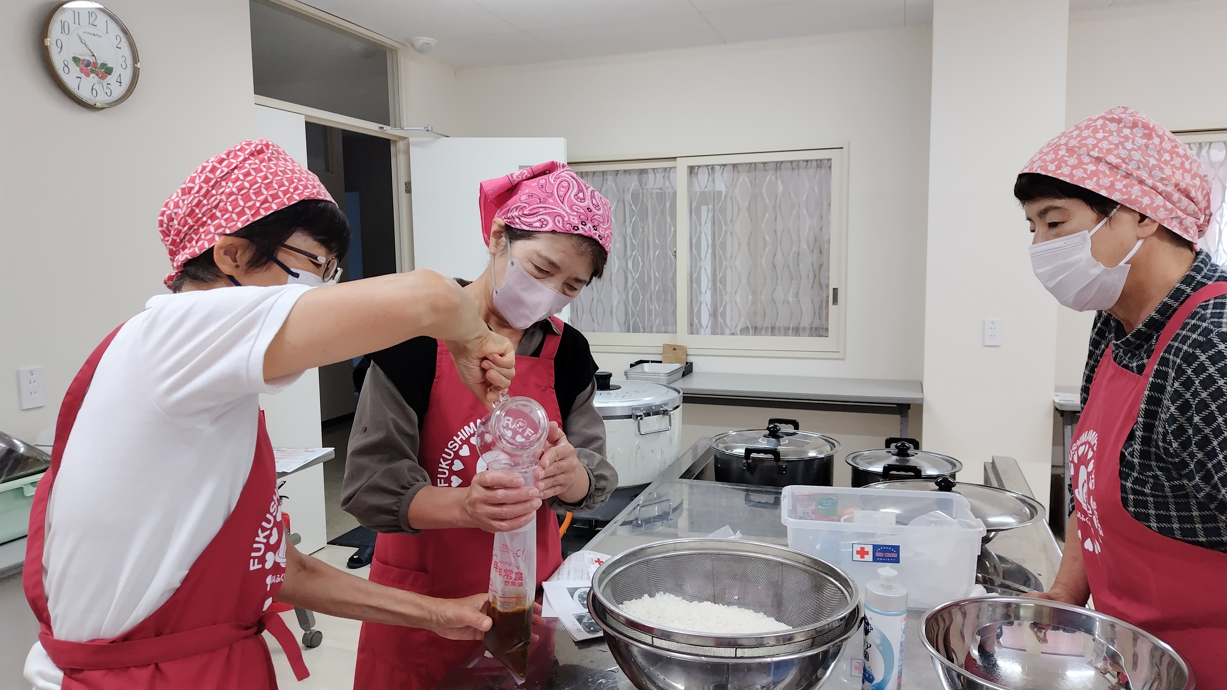 講師は日本赤十字社福島県支部事業推進課の野崎謙司係長が務め、災害時に簡単に作れるハイゼックス袋を使ったご飯の炊き方やコーヒー寒天、アイラップ袋を使ったさば缶とトマトの簡単カレーを調理しました。