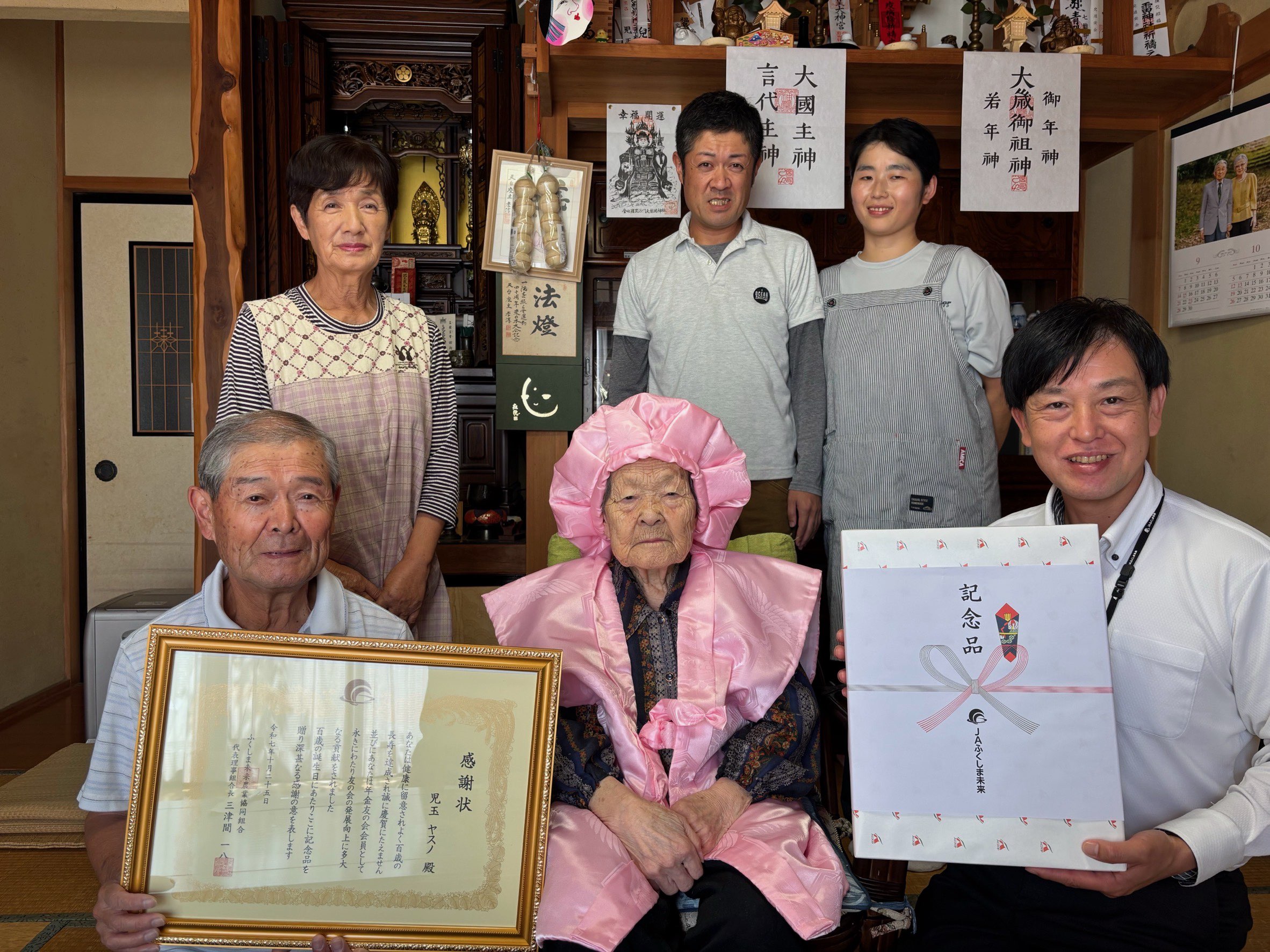 当JA福島南支店管内の児玉ヤスノさんが10月に100歳の誕生日を迎えたため、8日、自宅で長寿祝いを行いました。