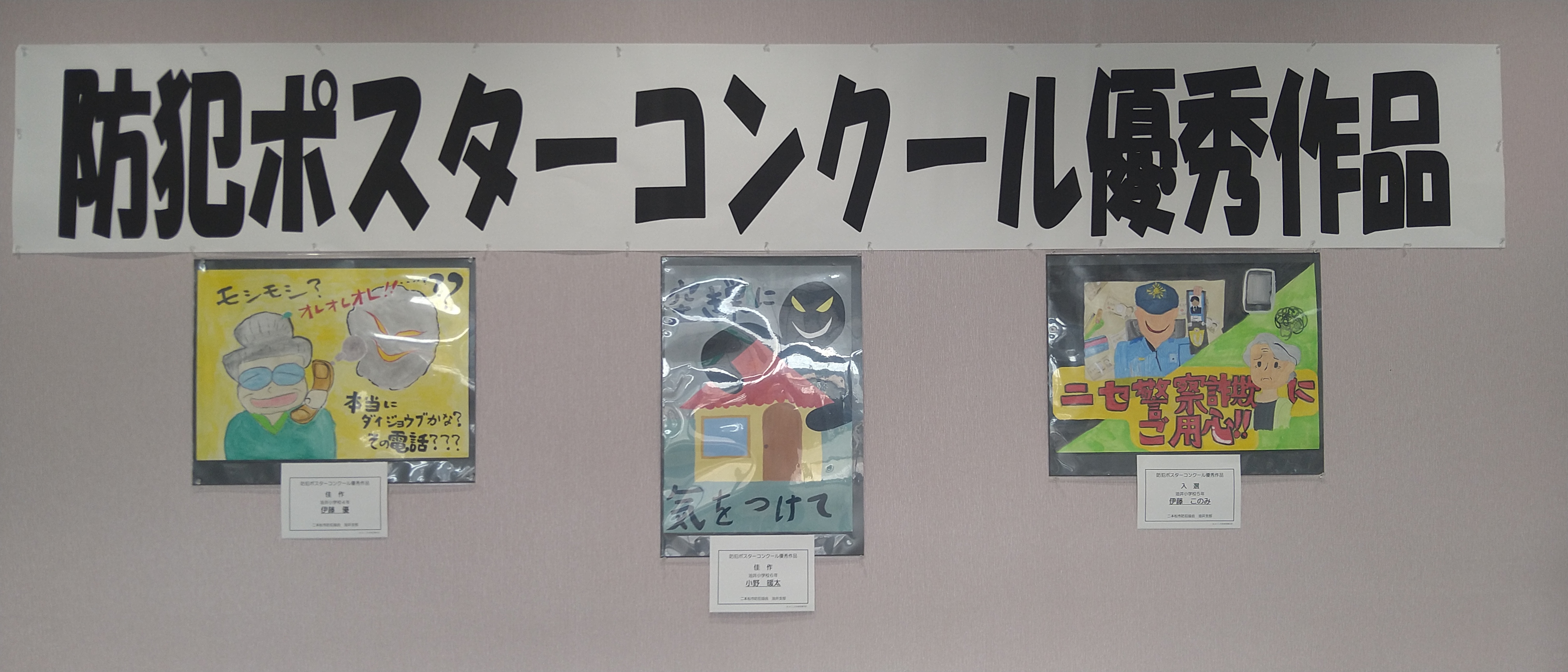 当JA安達支店は、二本松市防犯協会油井支部が主催した「みんなでつくろう安心の街」をテーマにした「防犯ポスター」を10日、支店玄関に掲示しました。「防犯ポスター」は、防犯意識の高揚を目的に二本松市油井小学校へ募集しました。優秀作品3点を掲示しました。