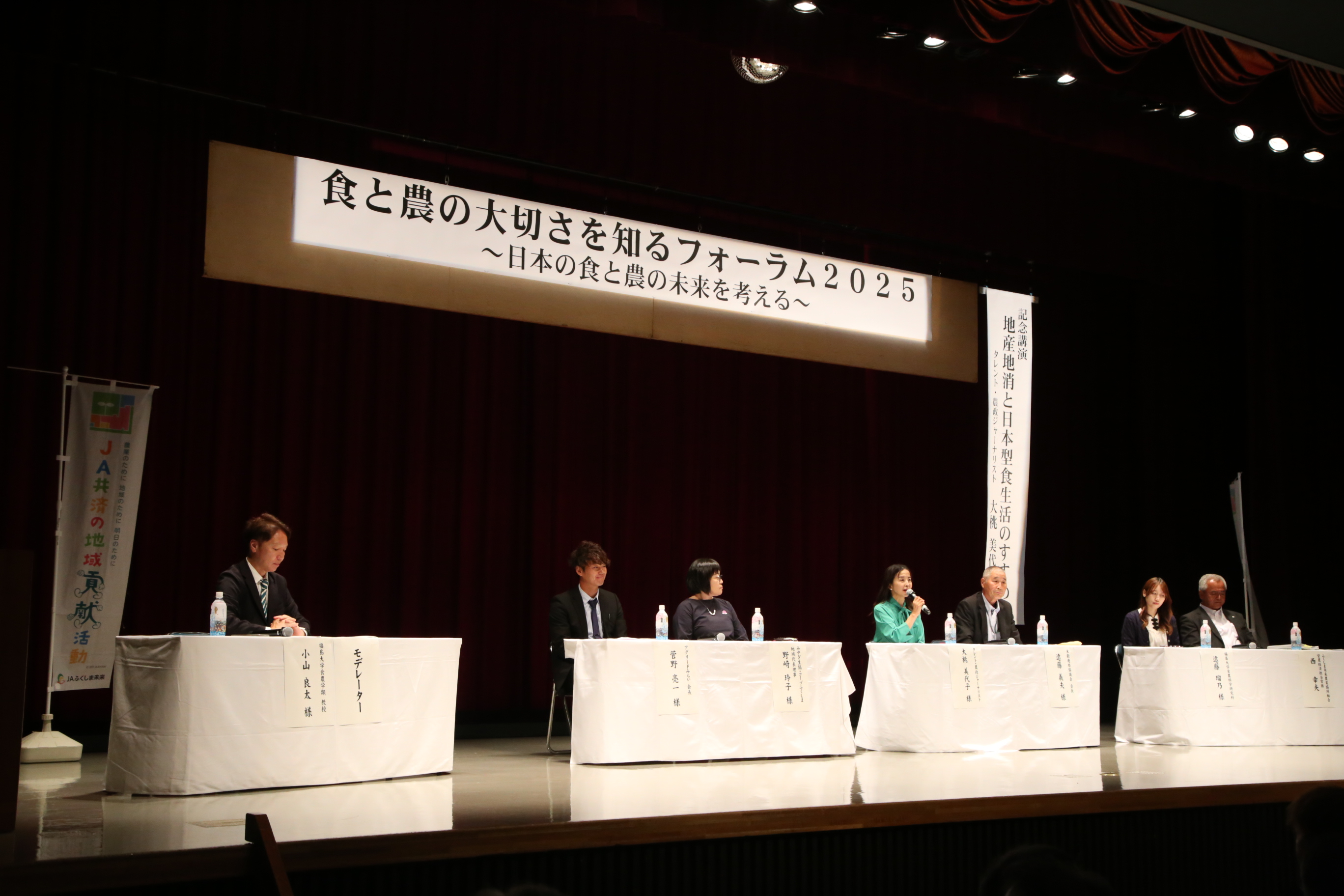 フォーラムでは、記念講演やパネルディスカッションを行い、「日本の食と農の未来を考える」をテーマに、福島大学食農学類の小山良太教授がモデレーターを務めました。パネリストには米穀連絡協議会の遠藤義夫会長のほか、新規就農者組織「アグリードみらい」の菅野亮一会長、みやぎ生協・コープふくしまの野崎玲子地域代表理事、福島大学食農学類研究科の遠藤瑠乃さん、同JAの西幸夫常務理事が登壇。米の適正価格を巡る議論や、若手農業者の課題、消費者と生産者の連携強化など、多角的な視点から活発な意見交換が行われました。