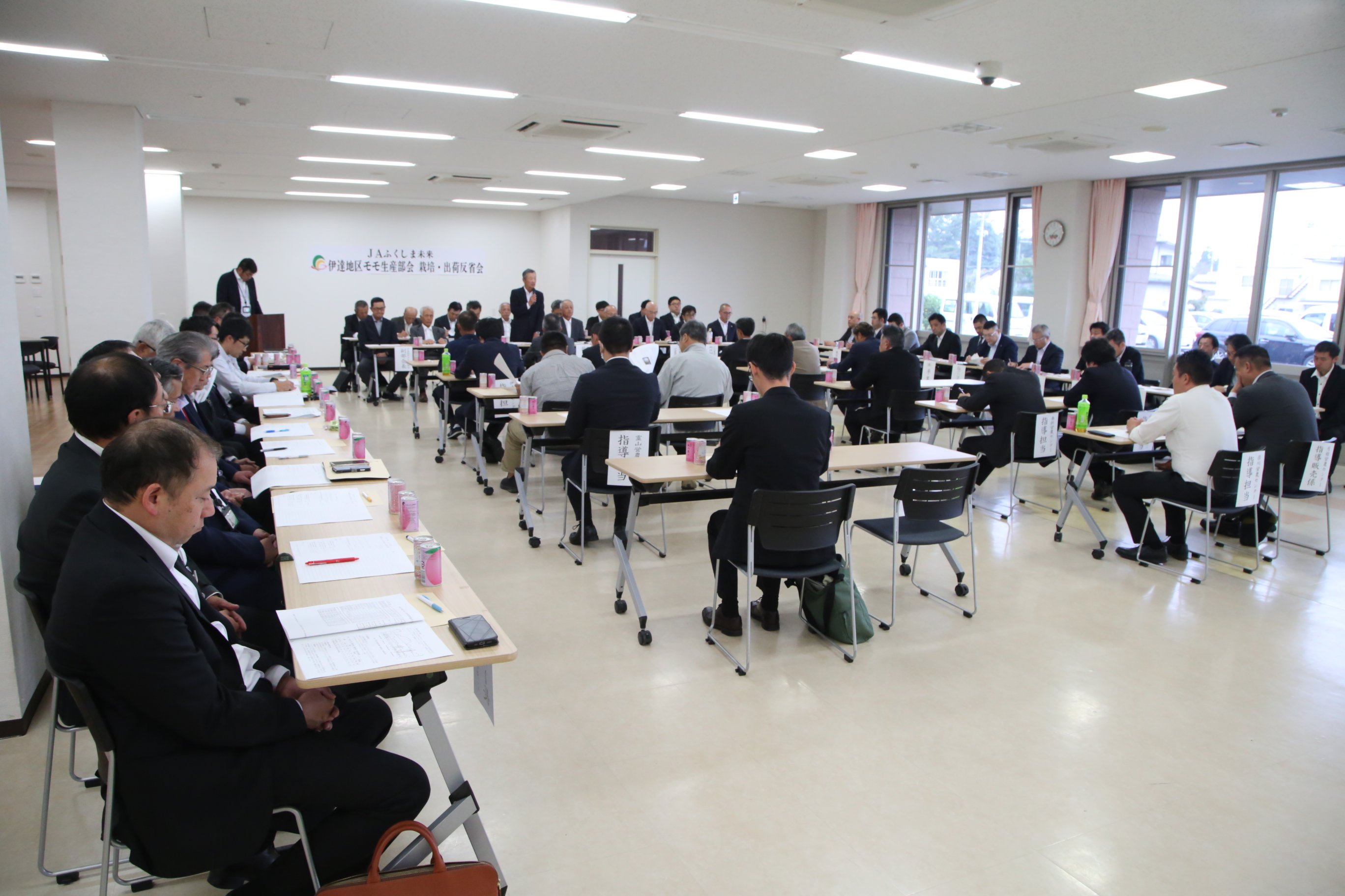 当JA伊達地区モモ生産部会は14日、伊達市のみらいホールやながわで2025年度産桃の栽培・出荷反省会を開きました。福島県関係者や市場、JA全農福島、生産者、同JA職員など約60人が出席し、今年度の生育状況や今後の課題について意見を交わしました。