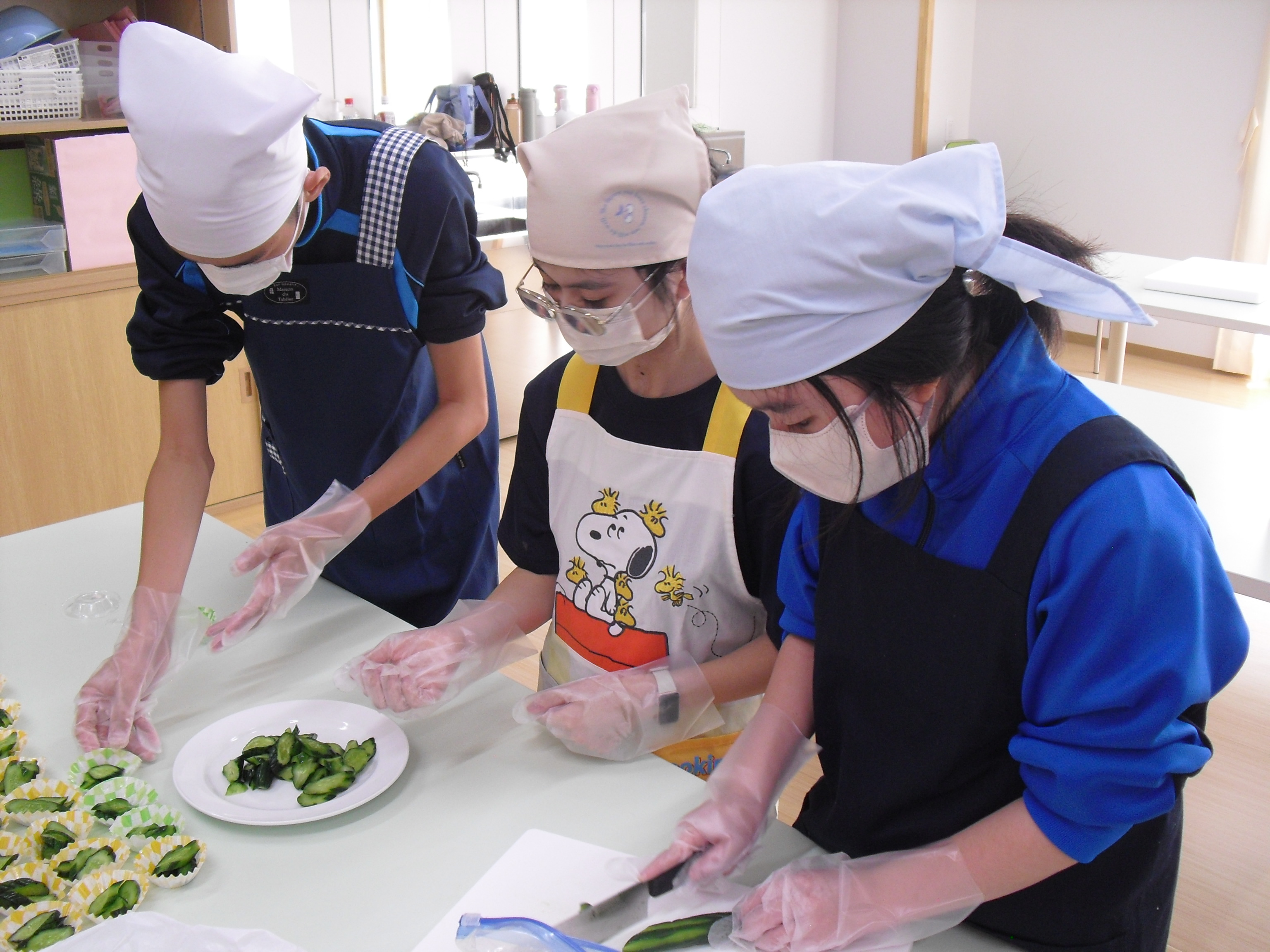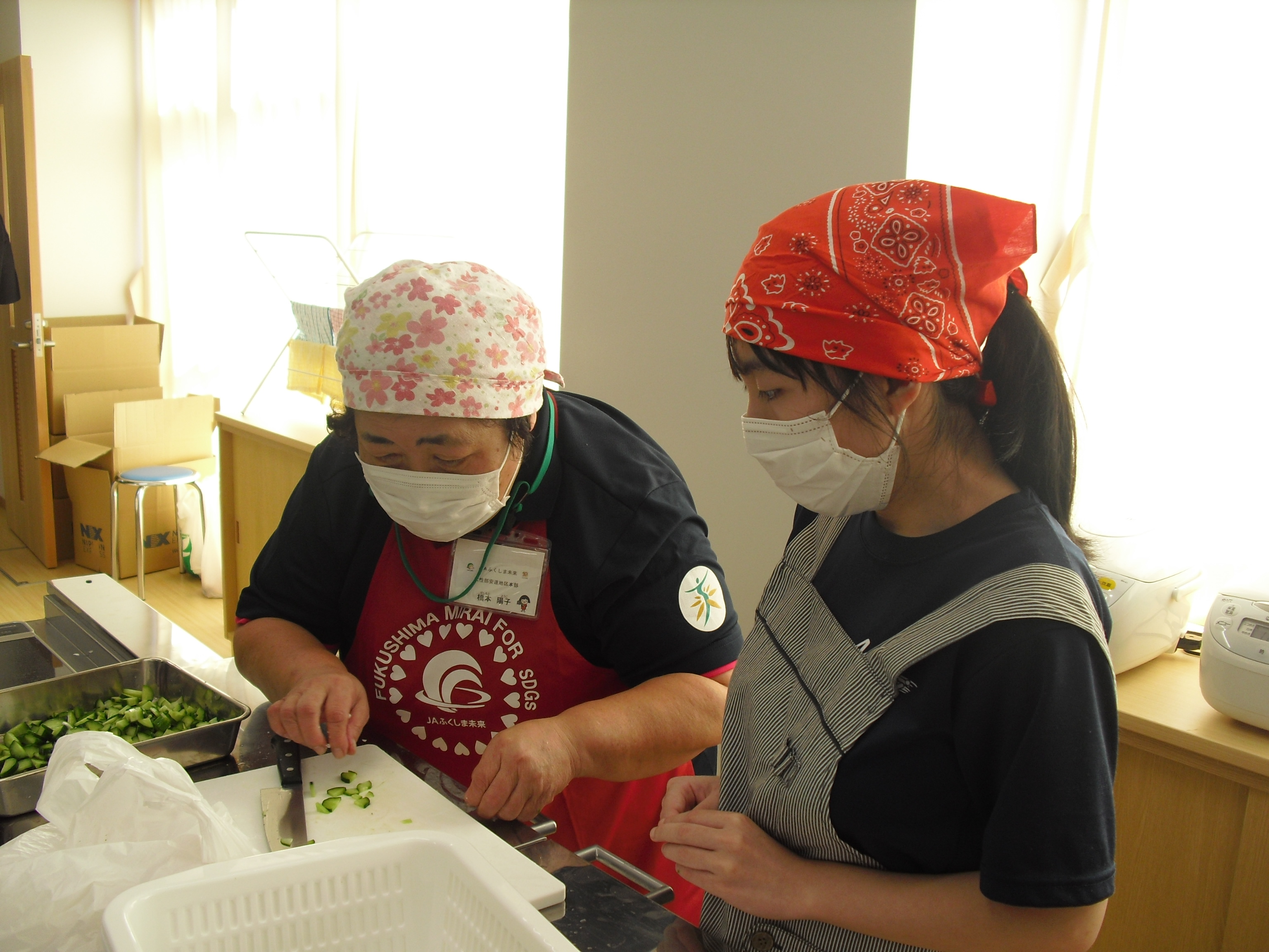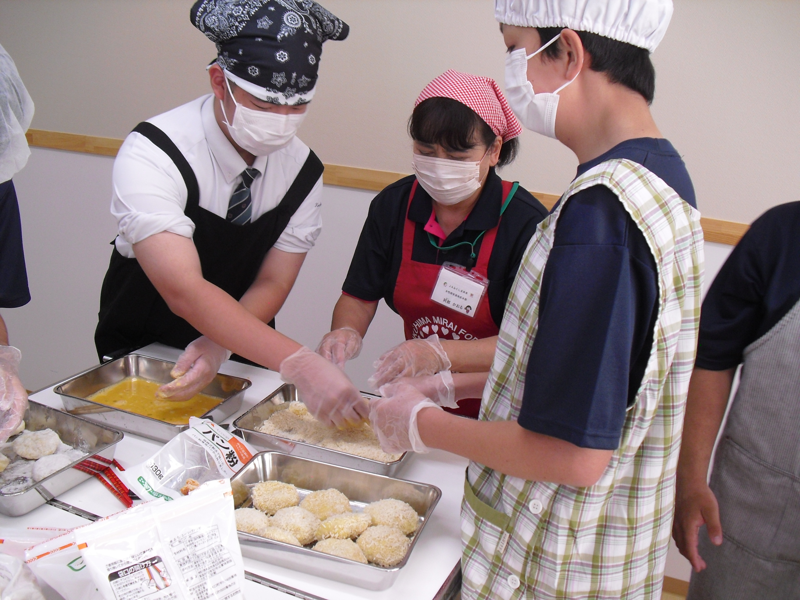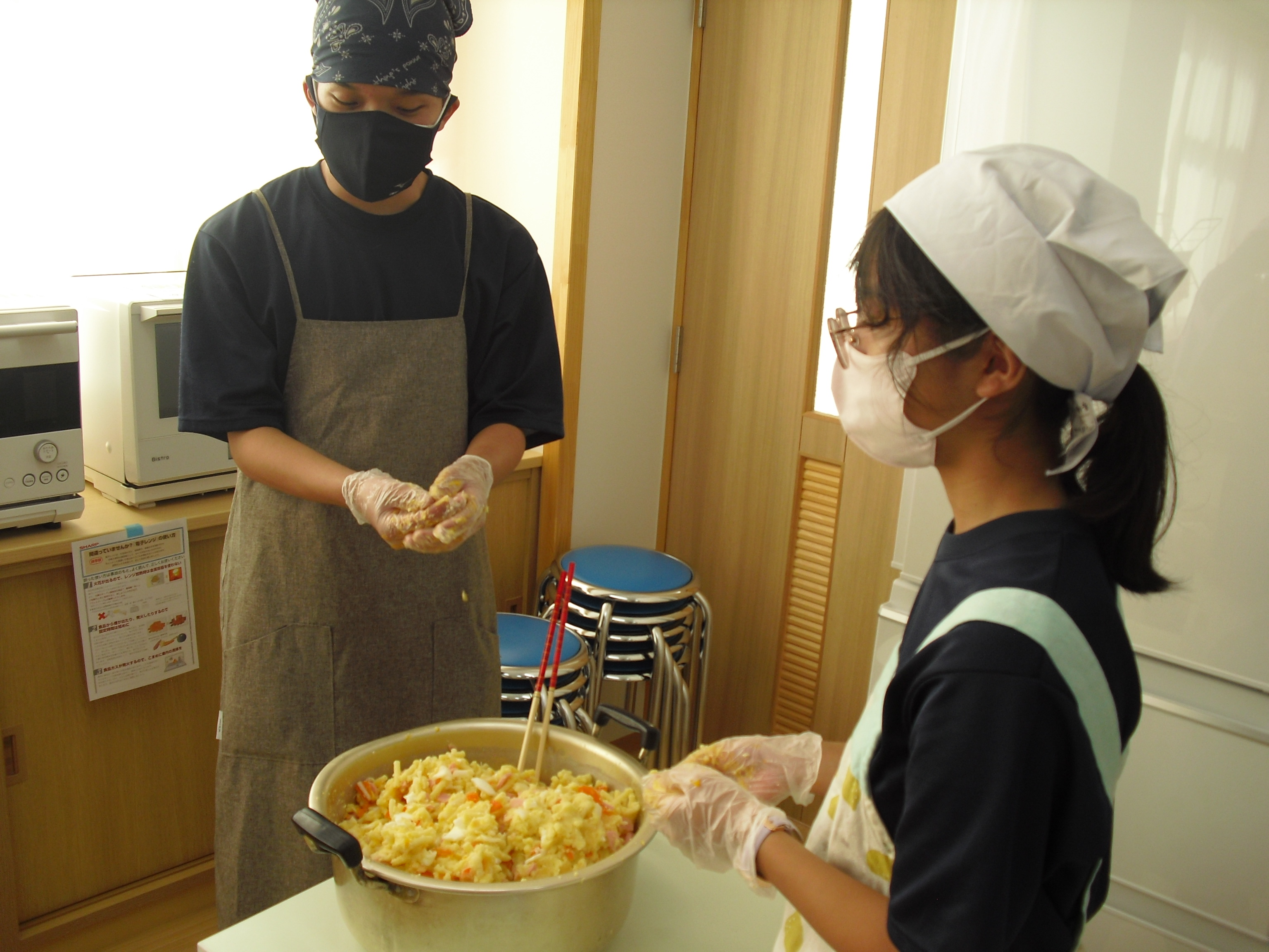 おにぎりには、今年収穫されたばかりの大玉村産コシヒカリを使用。女性部役員がオリジナルのポテトサラダの作り方を伝授する場面もあり、生徒たちは野菜を切ったり、具材を混ぜたり、油で揚げたりと、役員の指導のもと一生懸命に調理に取り組みました。