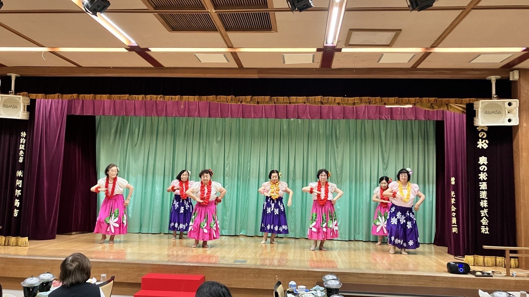 当JA女性部伊達地区保原総合支部は23日、日帰り研修旅行で二本松市の「岳温泉ながめの館光雲閣」を訪れました。部員17人が参加。同支部「保原フラクラブ」のフラダンスショーも行われました。「見上げてごらん夜の星を」や「島のブルース」などが披露され、アンコールでは「瀬戸の花嫁」で大いに盛り上がりました。