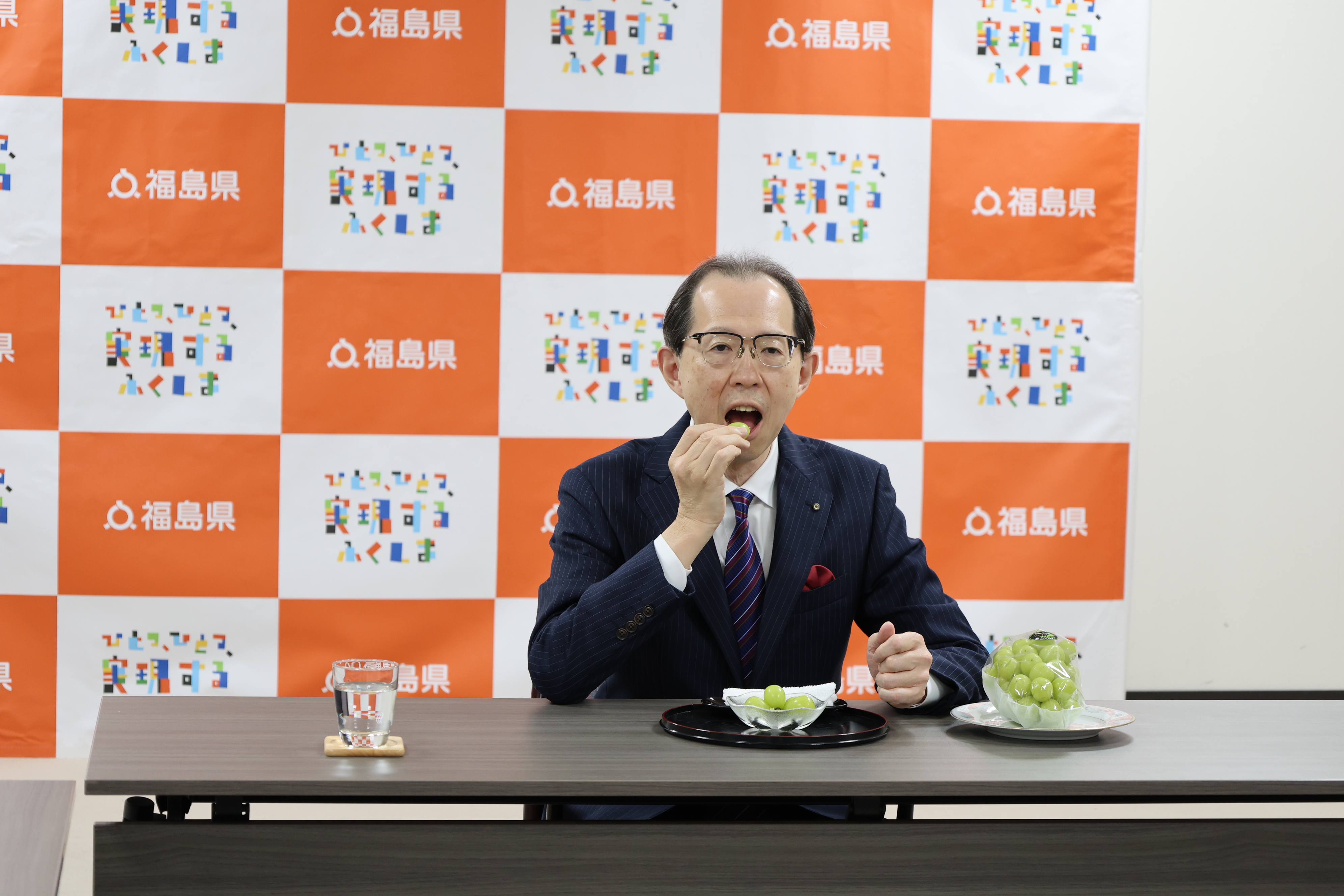 三津間組合長は「夏の暑さもあり、非常に甘く仕上がった」とPR。試食した内堀知事は「とても甘くてジューシー。フルーツは芸術品でもある。大粒で美しいところも含めて福島のシャインマスカットをPRしていきたい」と話しました。