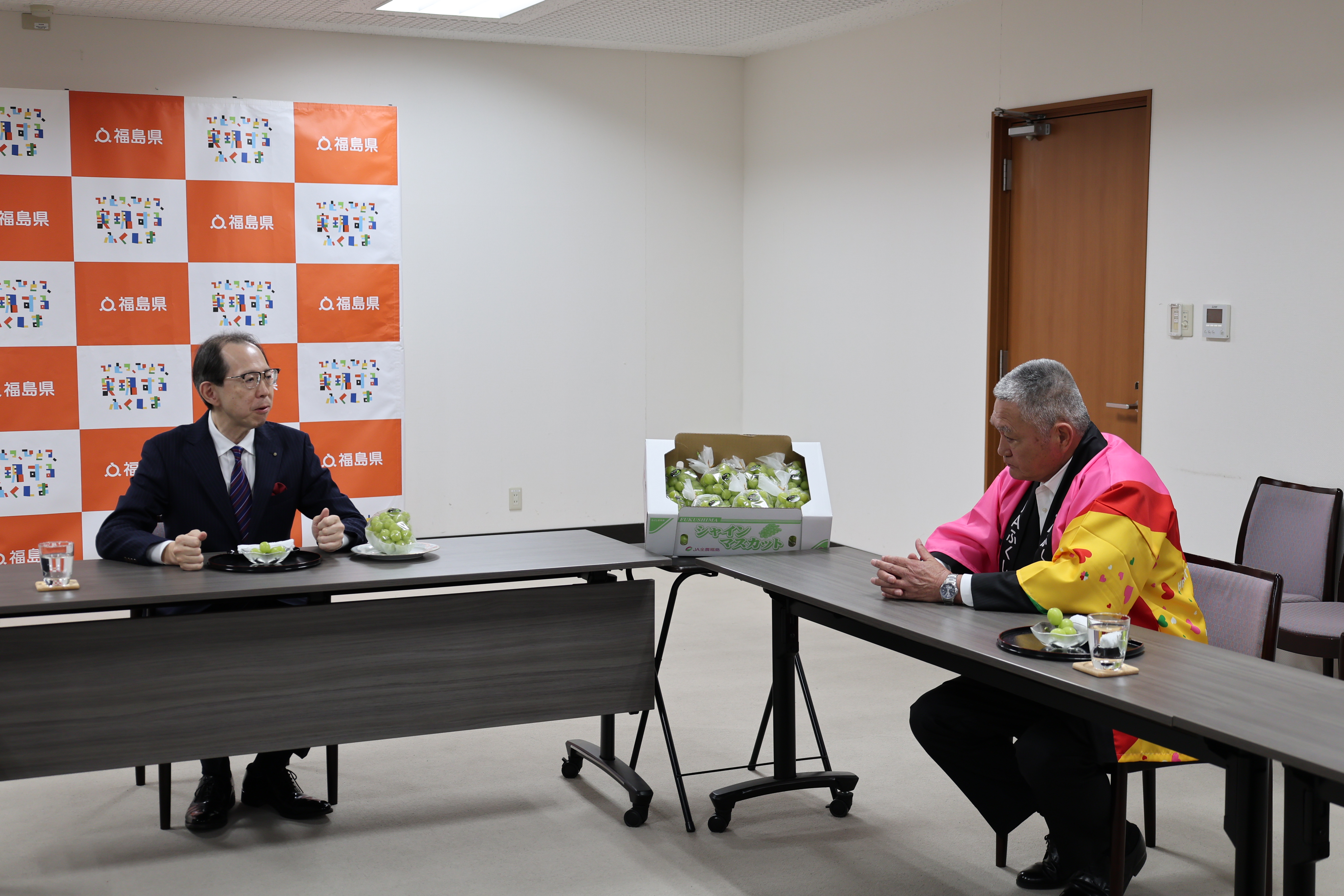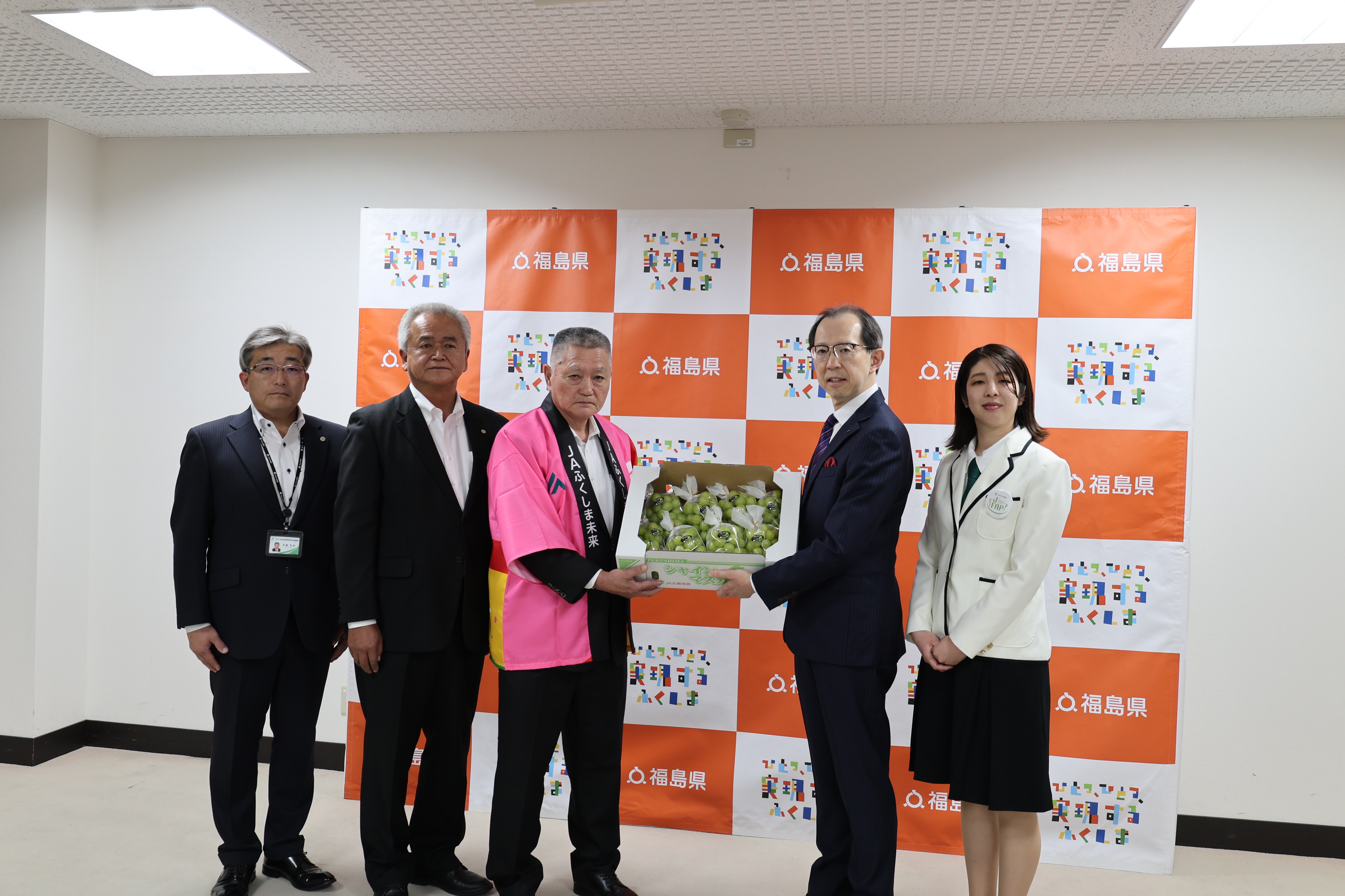 当JAは23日、福島県庁を訪問し、内堀雅雄知事に旬を迎えているブドウ「シャインマスカット」1箱(5㌔8房)を贈り、出来栄えを報告しました。