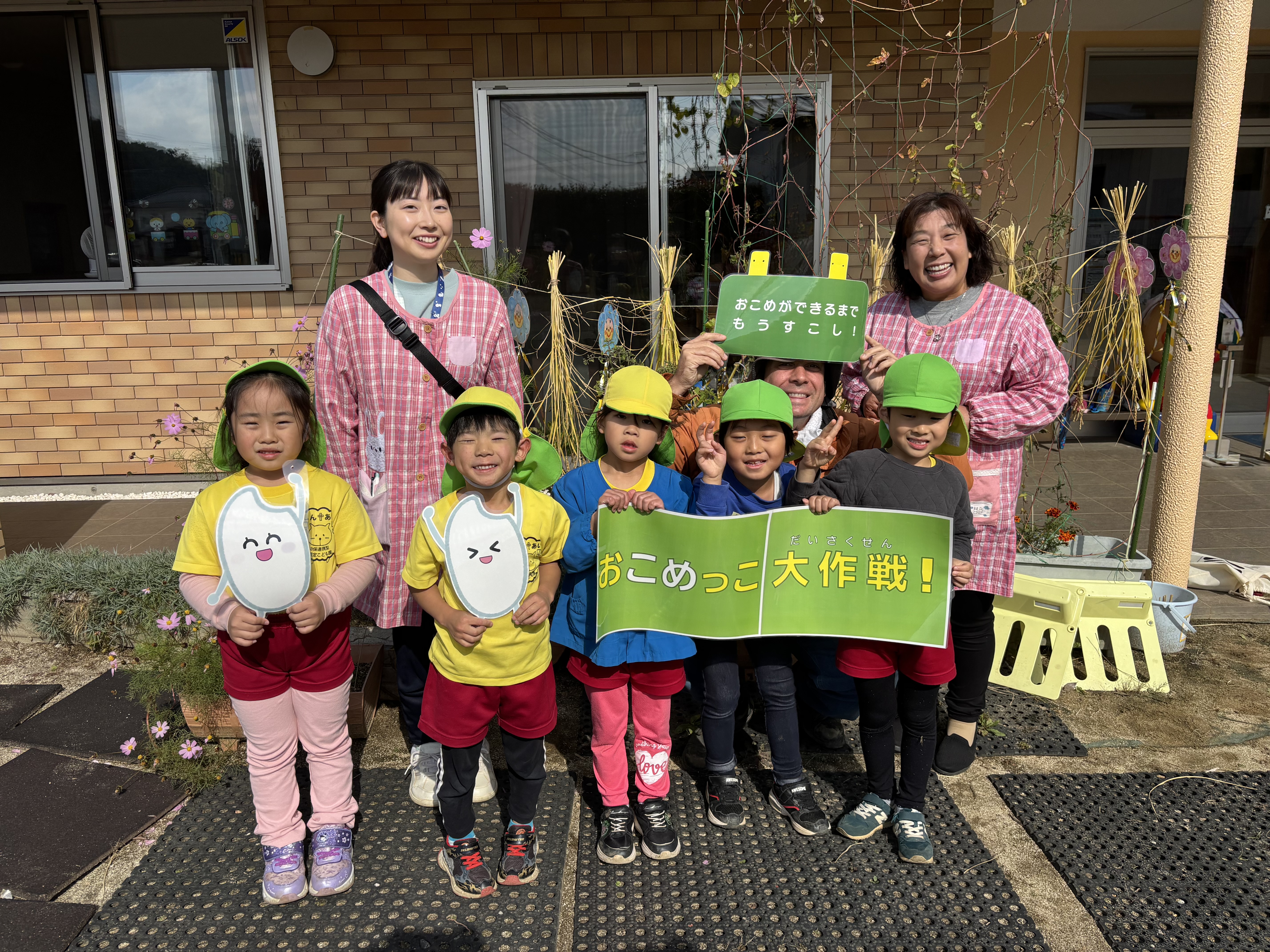 5月に芽出しした種もみから全員立派な穂ができました。JA職員が稲刈りの方法を教え、児童らははさみを使って稲を刈り取り、麻ひもで結びこども園の玄関前に干しました。