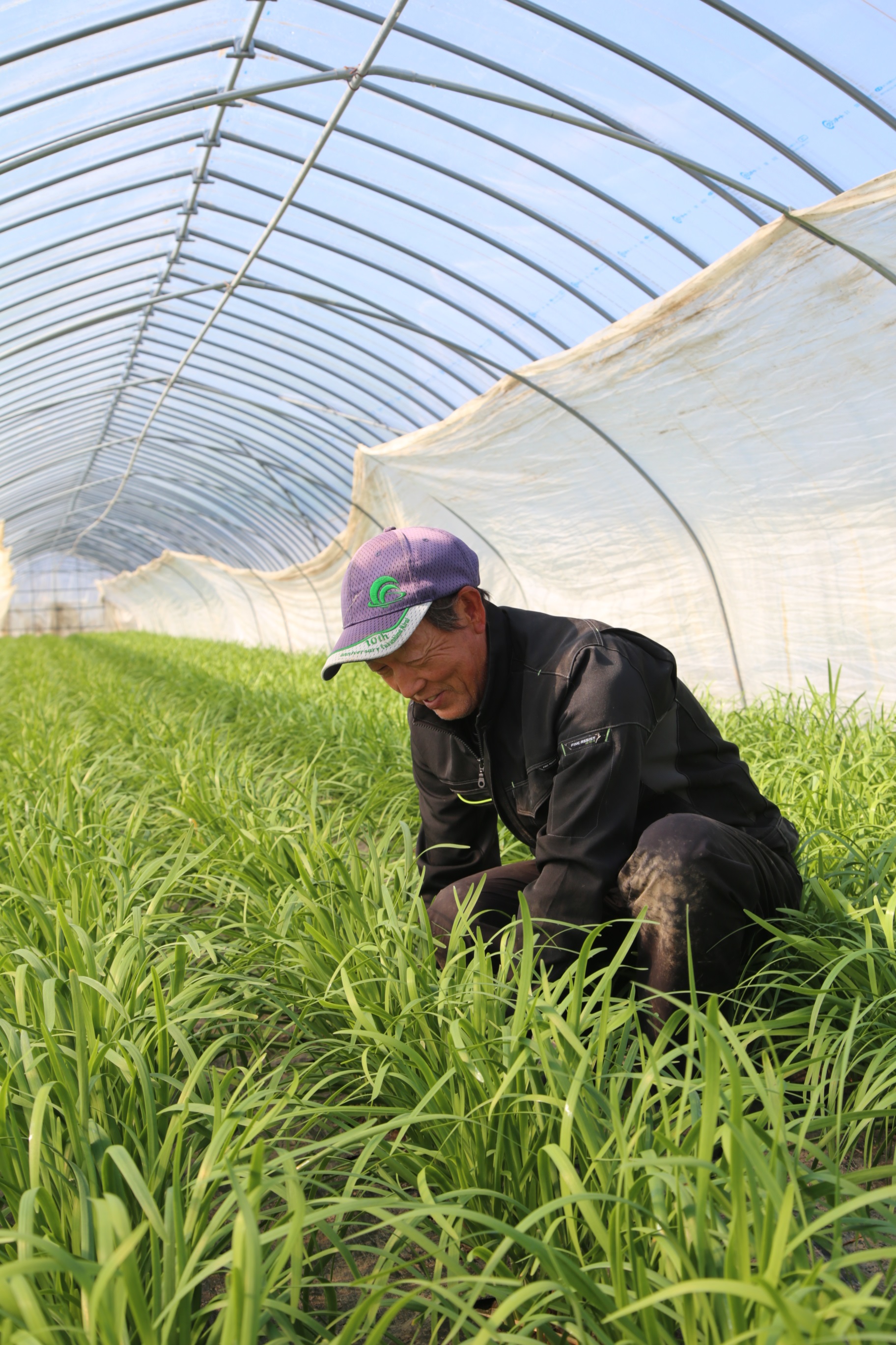 新地町でニラ3㌶を栽培している新地ニラ部会の加藤博部会長は、この日も圃場でニラの収穫作業に励みました。加藤部会長は年間を通して35㌧のニラを出荷しており、その中でも7割が秋冬ニラ。光るような鮮やかな色味としっかりとした太さが加藤部会長の自慢です。今月開催された同地区のJAまつりでは、農産物共進会で県知事賞を受賞しました。