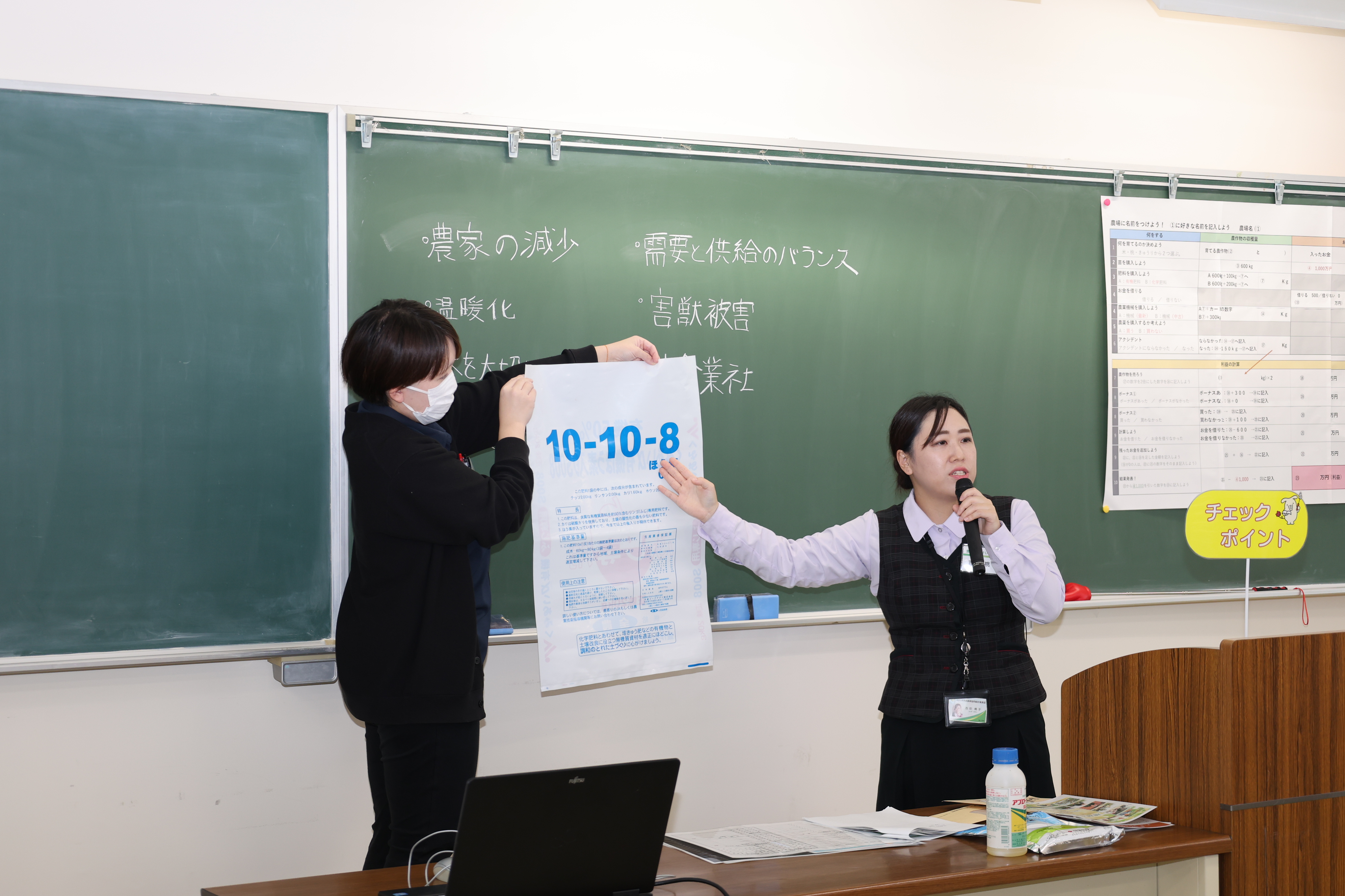 同地区地域支援課の職員が「食農せんせい」として講師を務めました。グループ討議では、米の高騰が起こった理由について協議。生徒からは異常気象や担い手不足などさまざまな意見が出されました。
