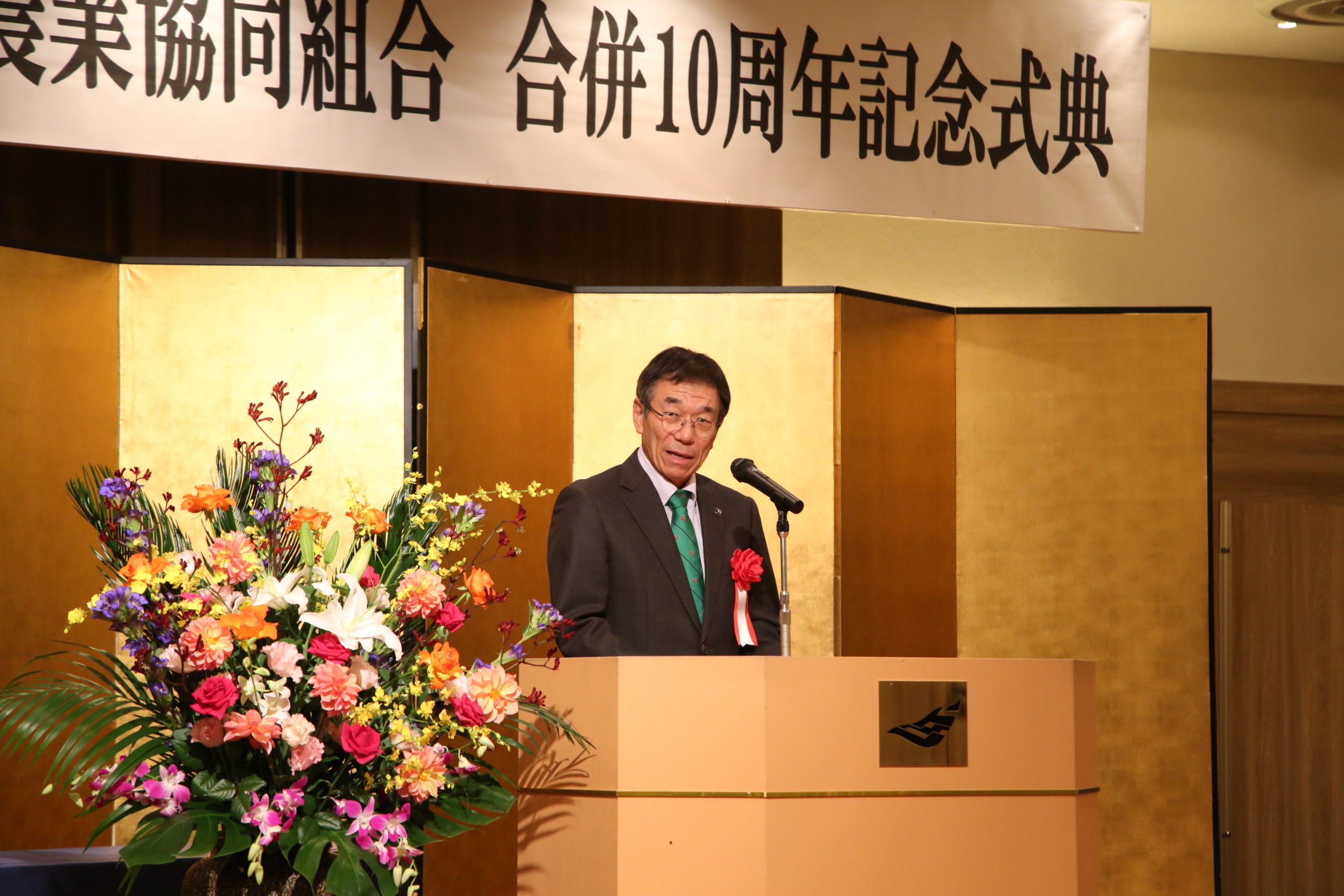 当JAは今年合併10周年を迎えたことを記念し、4日福島市のウェディングエルティで記念式典を開きました。JA役職員や功労者ら約180人が参加しました。