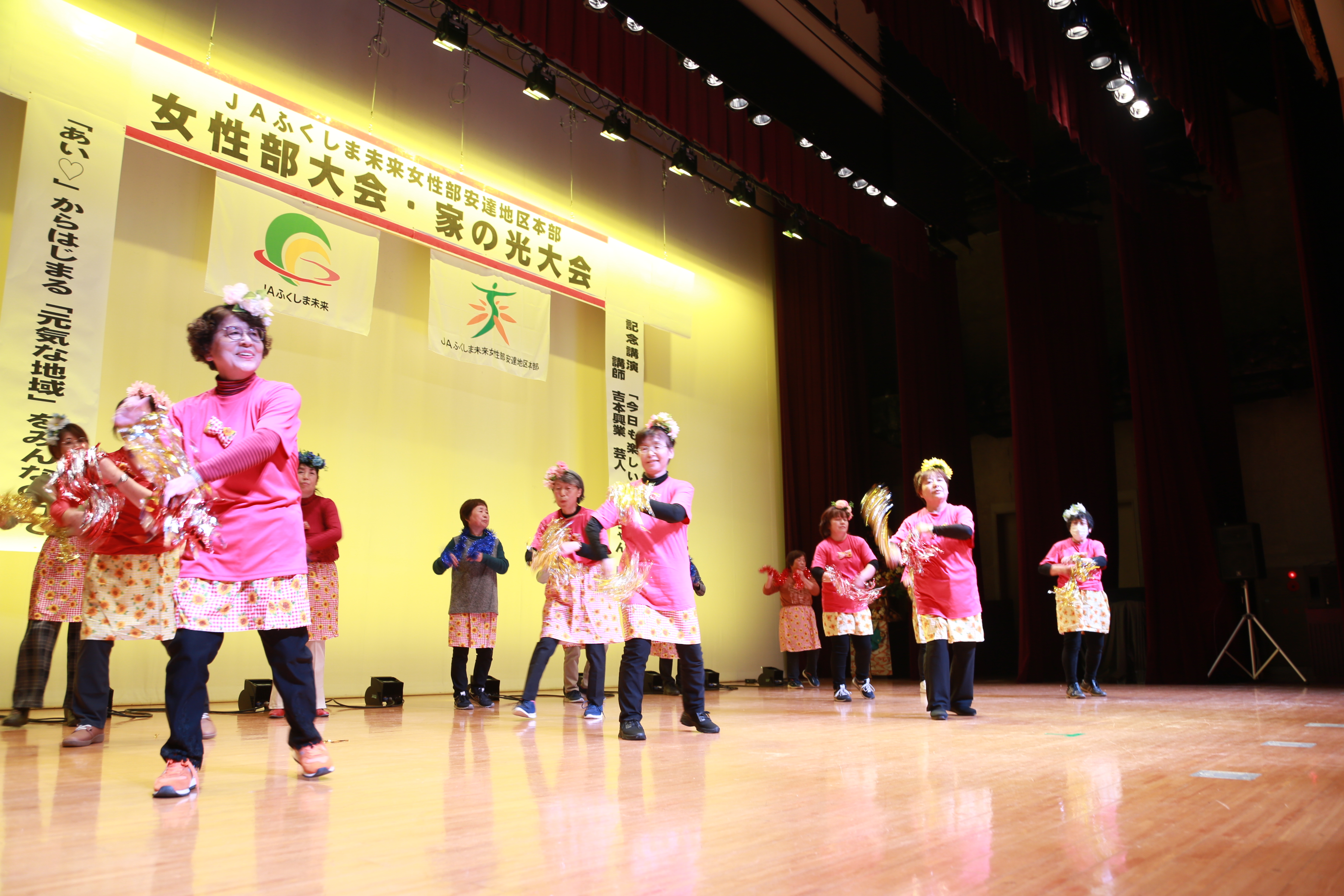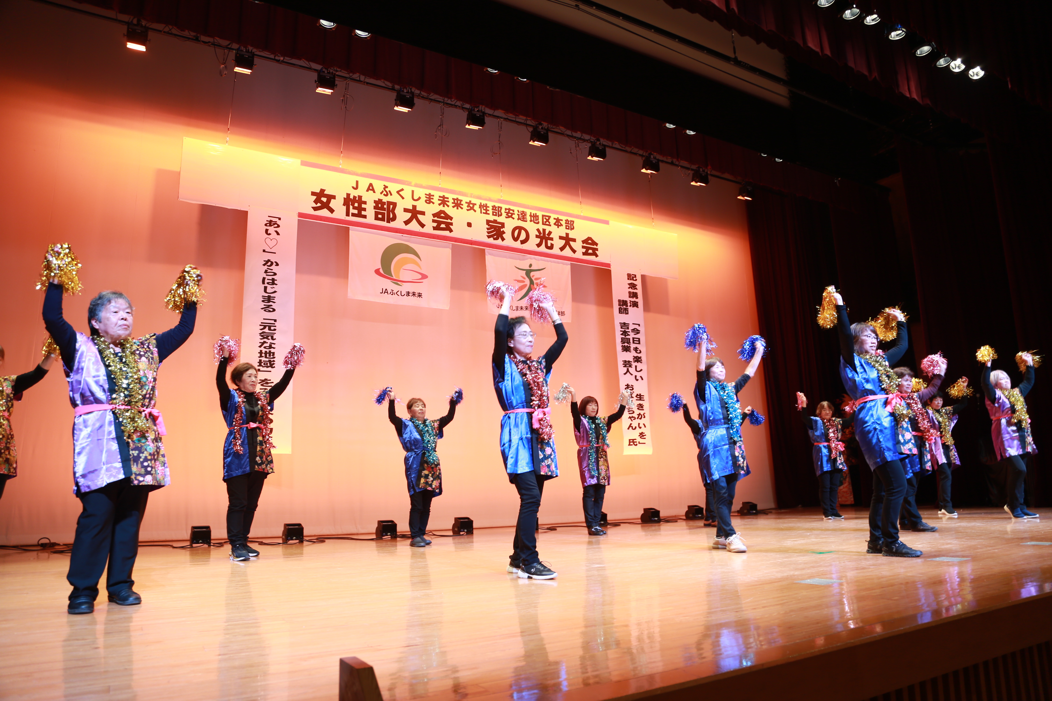 部員による家の光記事活動発表では、3総合支部の代表者が女性部に加入したきっかけや日頃の活動について発表しました。生活文化活動発表では、7つの総合支部がダンスやスポーツ民踊を披露し会場を盛り上げました。またMCには吉本興業株式会社の福島県住みます芸人のペンギンナッツ中村陽介さんが務めました。