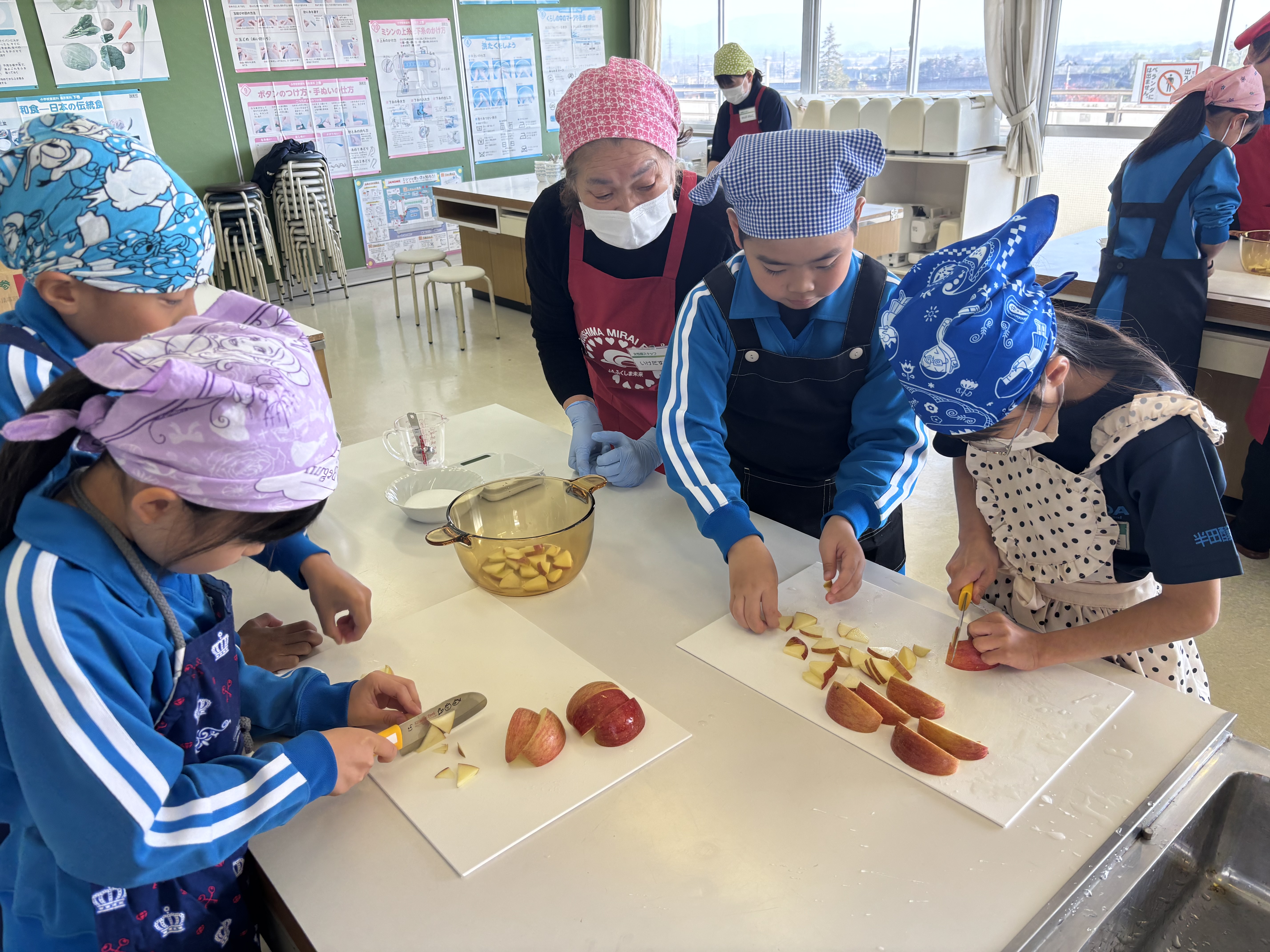 授業では児童がりんごを切り、スタッフが鍋で煮詰め、りんごジャムを作りりんごを煮詰めている間に、りんごの品種やりんごの仲間について学習しました。