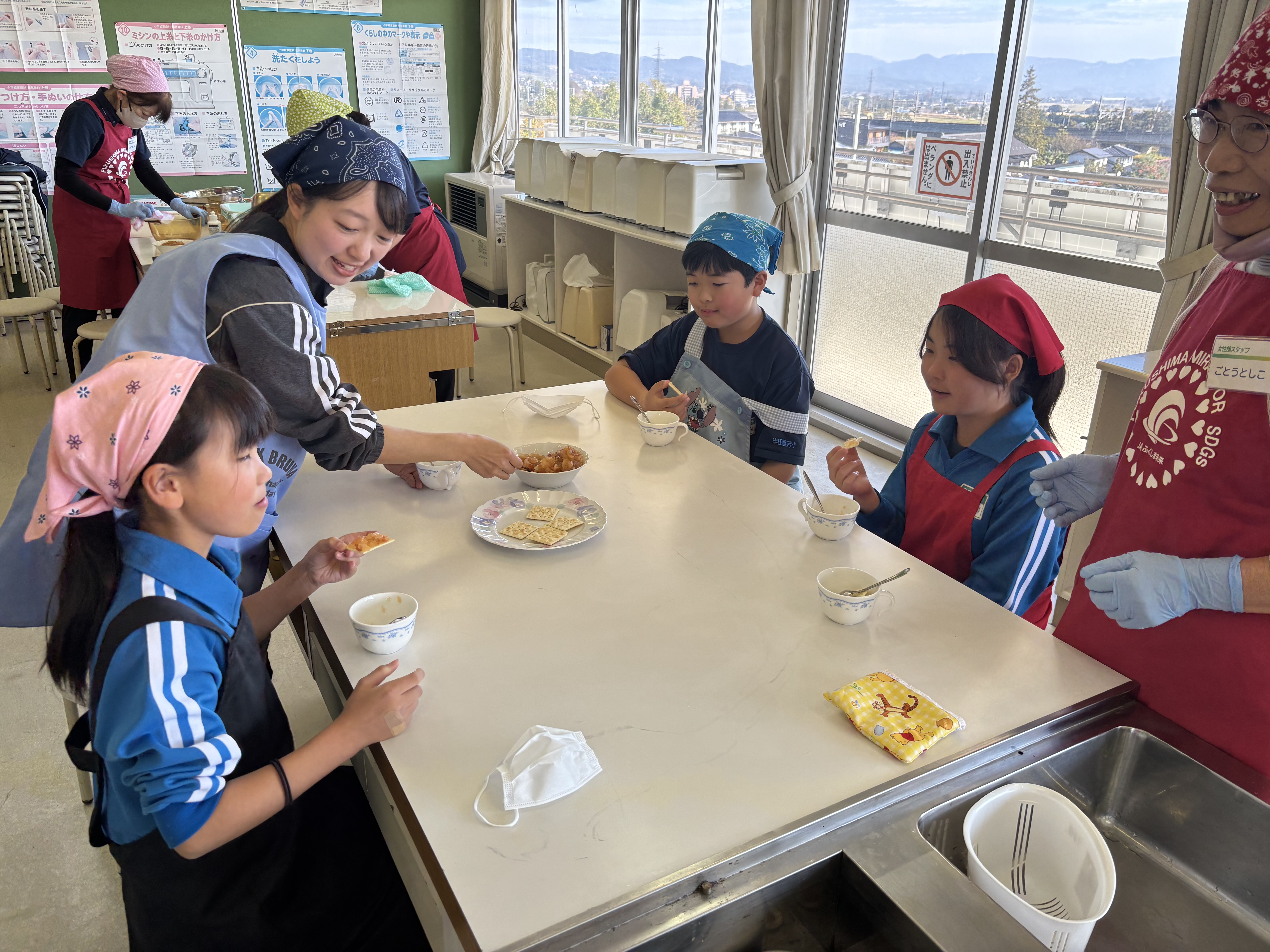 作ったりんごジャムは、クラッカーにつけて試食。児童は「初めてジャムを作ったけど楽しかった。すごくおいしかったので家でも作りたい!」と笑顔で話しました。
