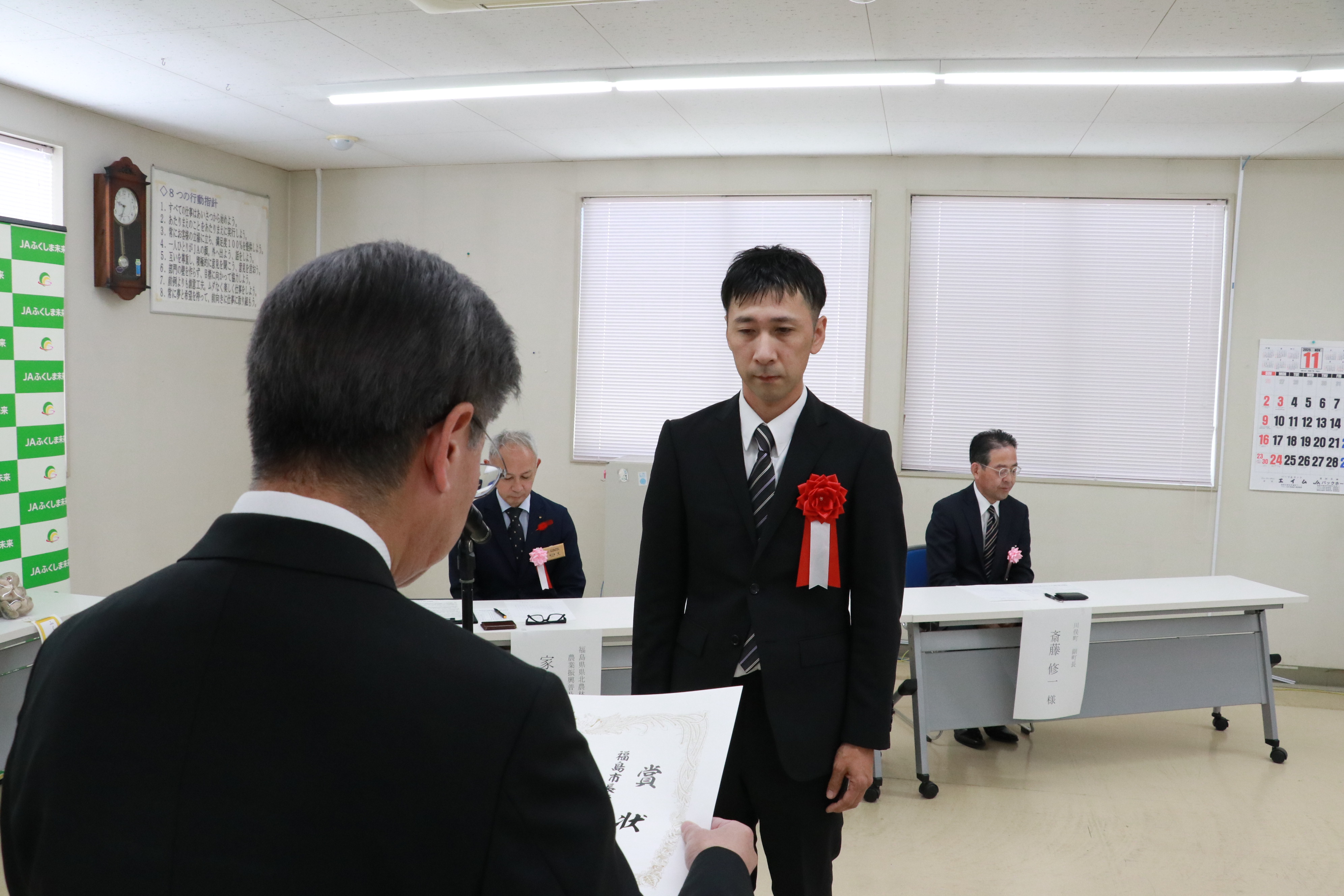 表彰式では、県知事賞果実の部高澤雄生さん(サンふじ)、福島市長賞そさいの部大槻晃宏さん(キュウリ)、花卉の部島貫徳和さん(ダリア)、川俣町長賞そさいの部高橋孝子さん(ミニトマト)らが輝きました。