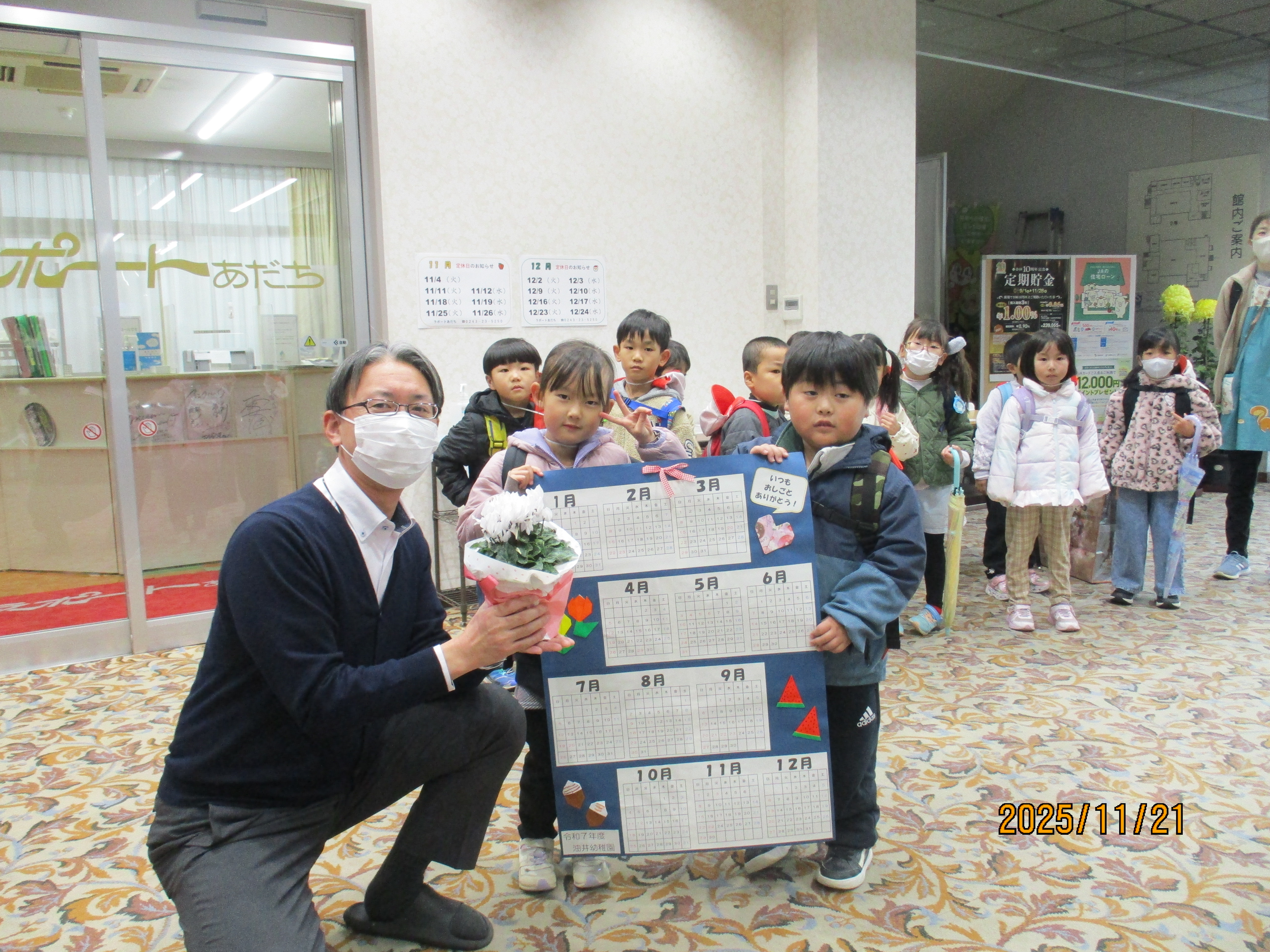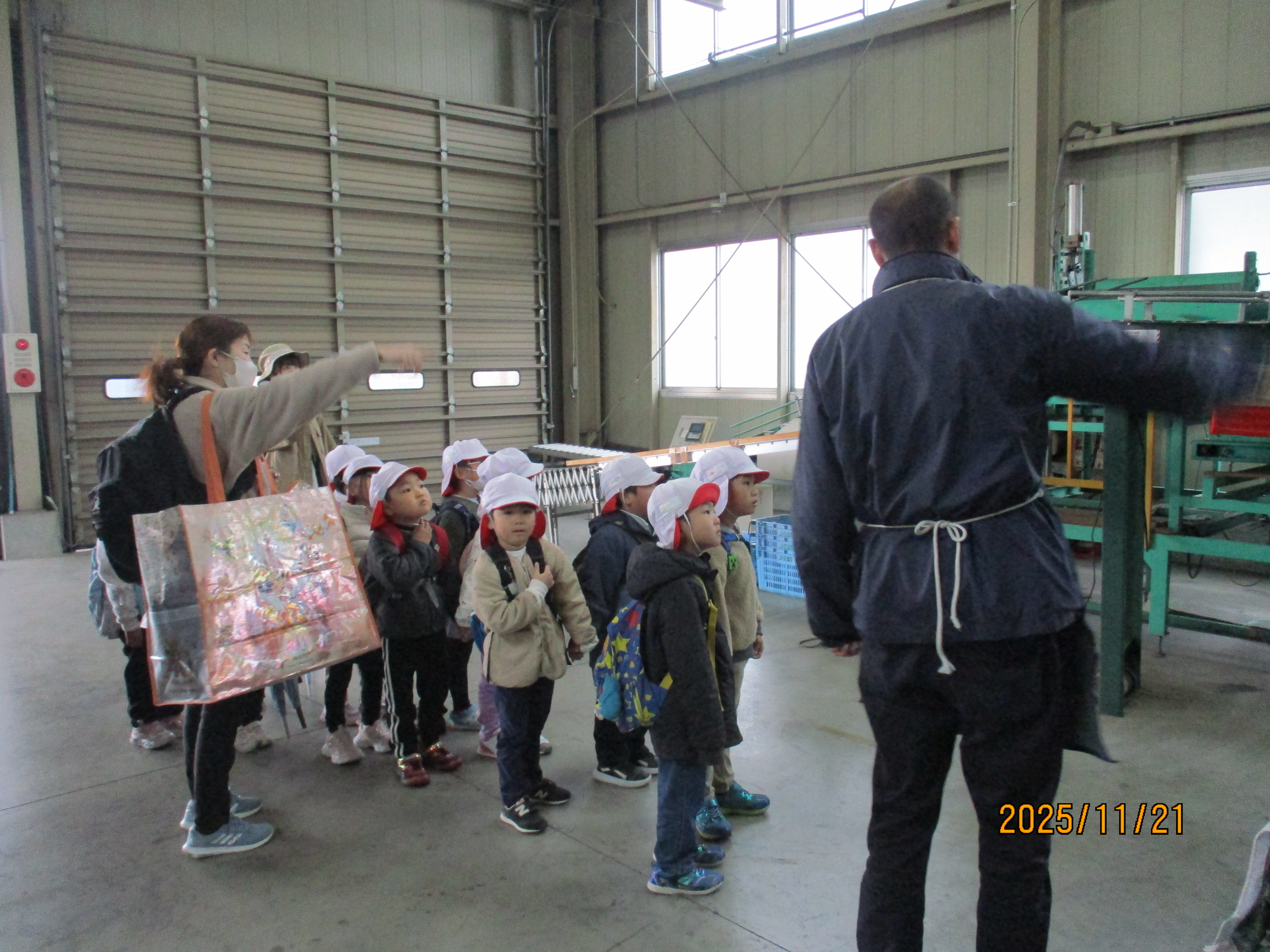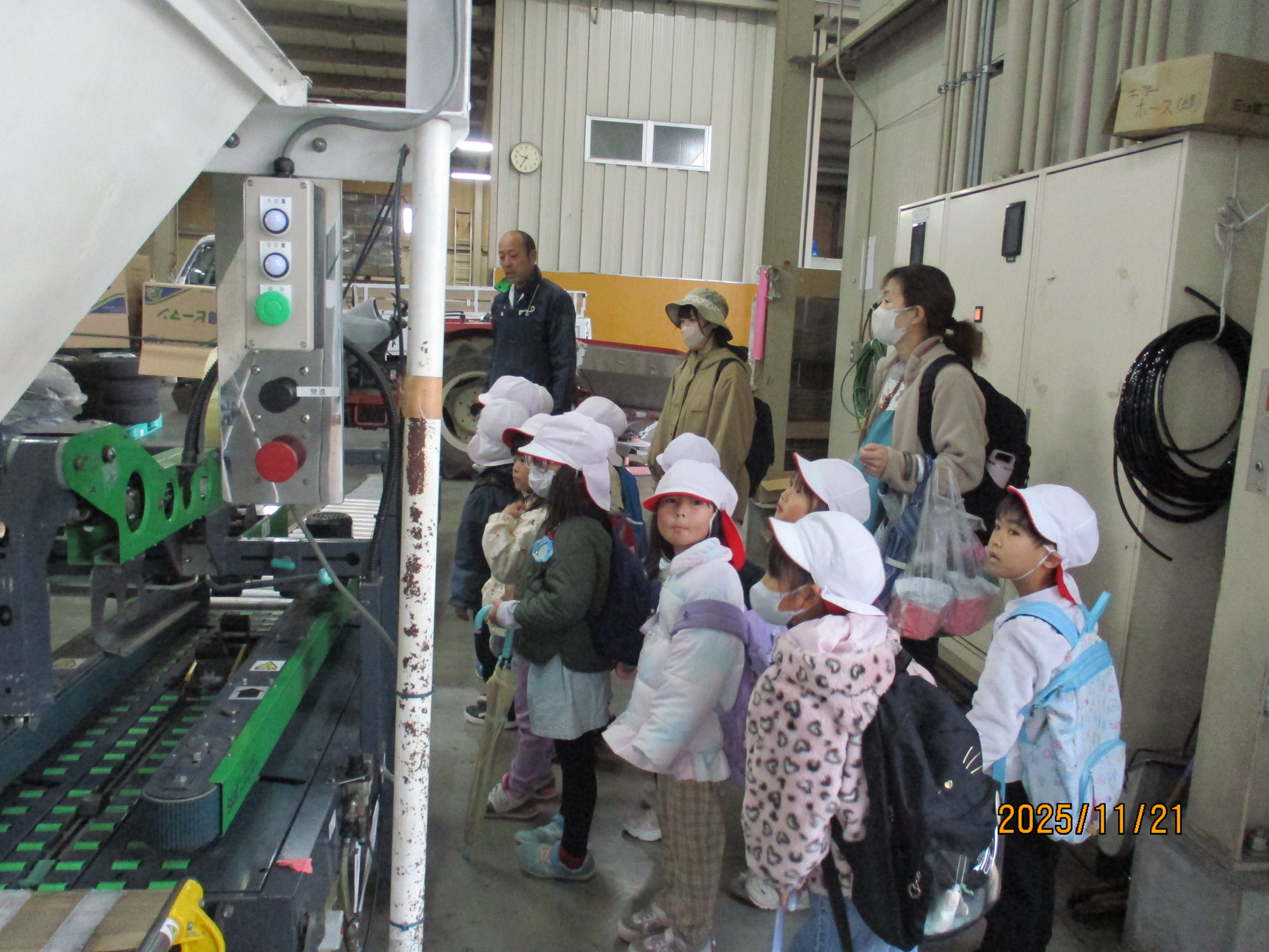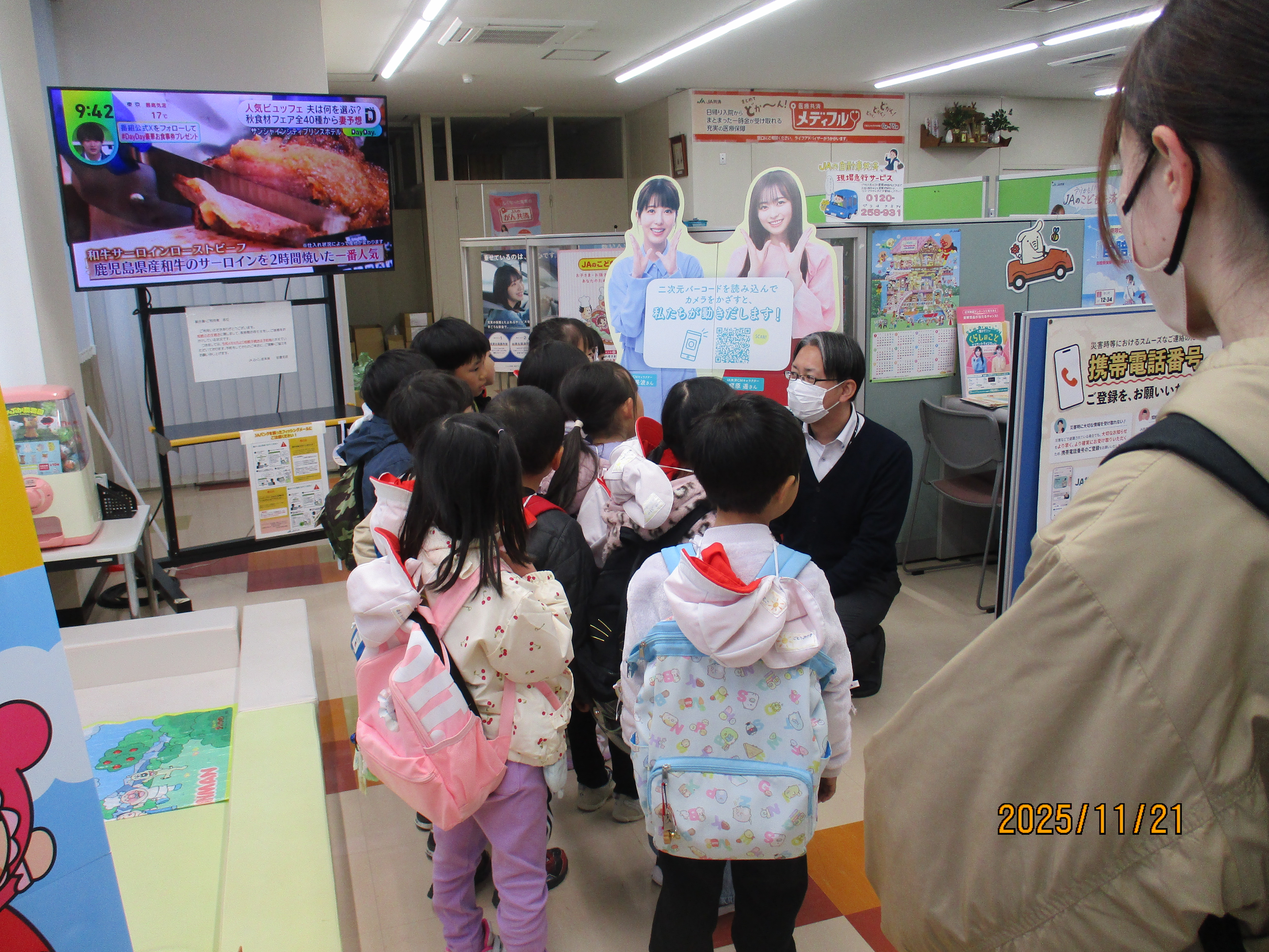 当JA安達地区管内の油井幼稚園年長組12名が11月21日、安達支店に職場見学に来ました。最初にピーマン選果場を見学。齋藤センター長からピーマンの集荷の話を聞きました。大きな機械に驚いたようです。支店窓口でJAの事業について説明してもらいました。