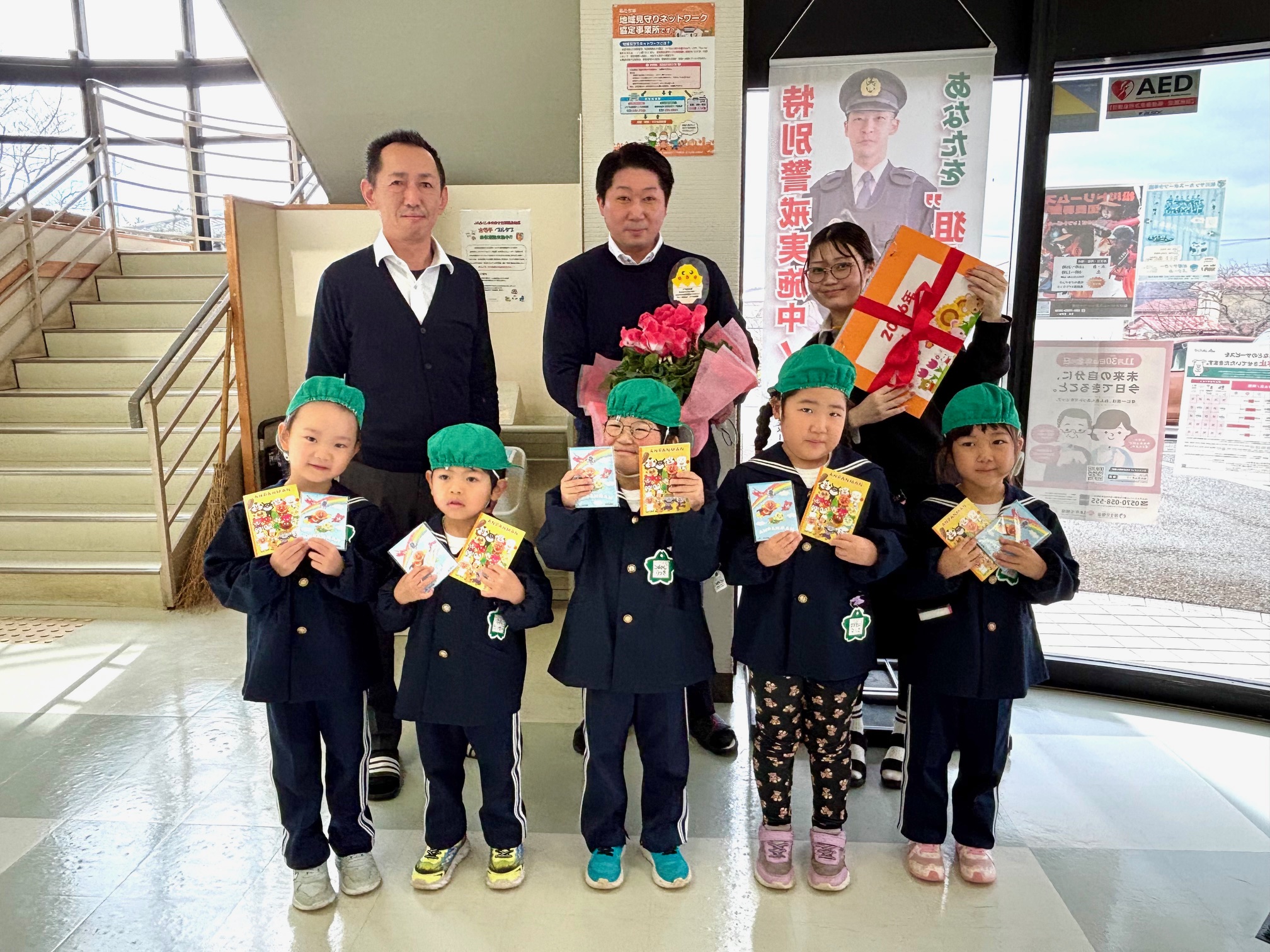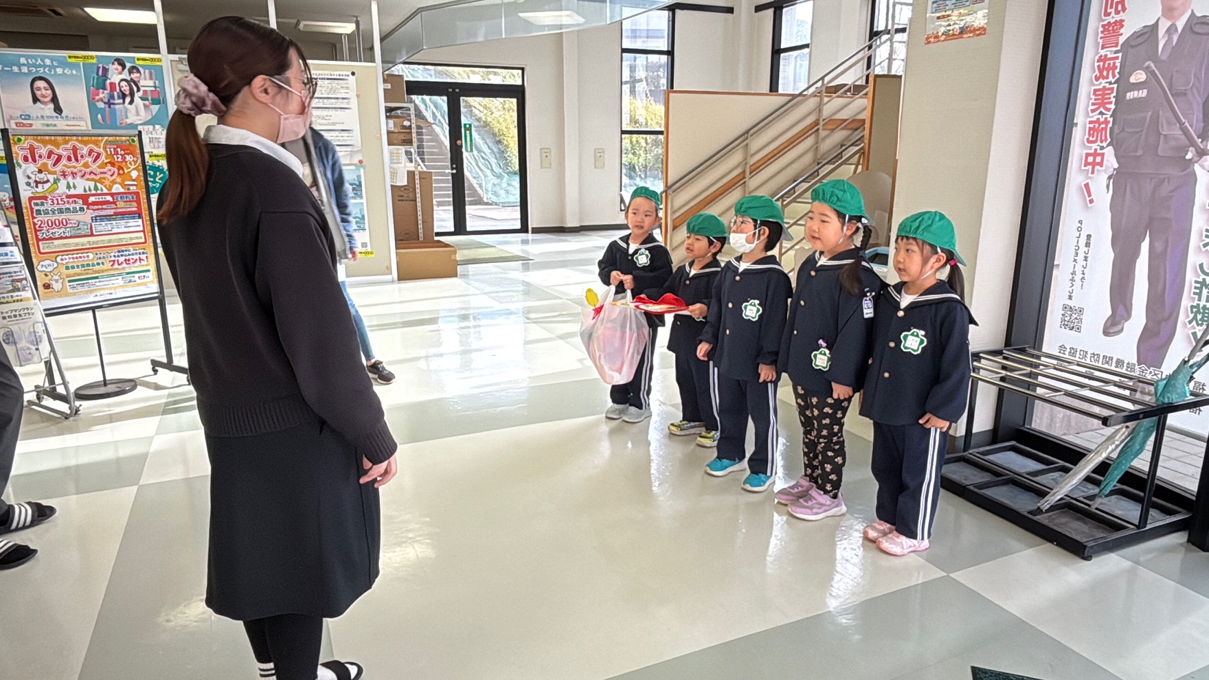 訪れた園児は「いつもお仕事ありがとうございます。これからもお仕事頑張ってください」と話し手作りのカレンダーとお花のプレゼントを支店職員に手渡しました。