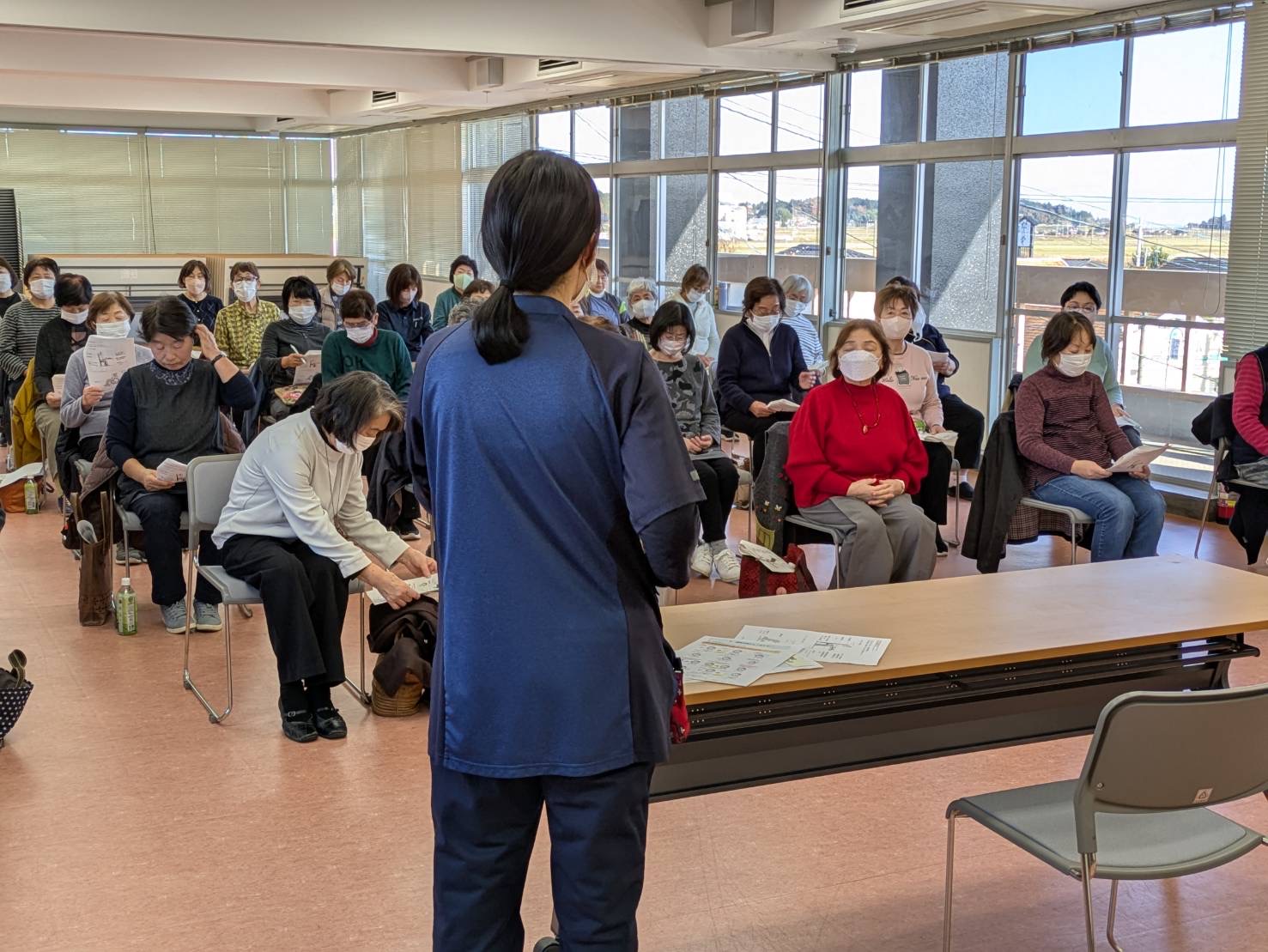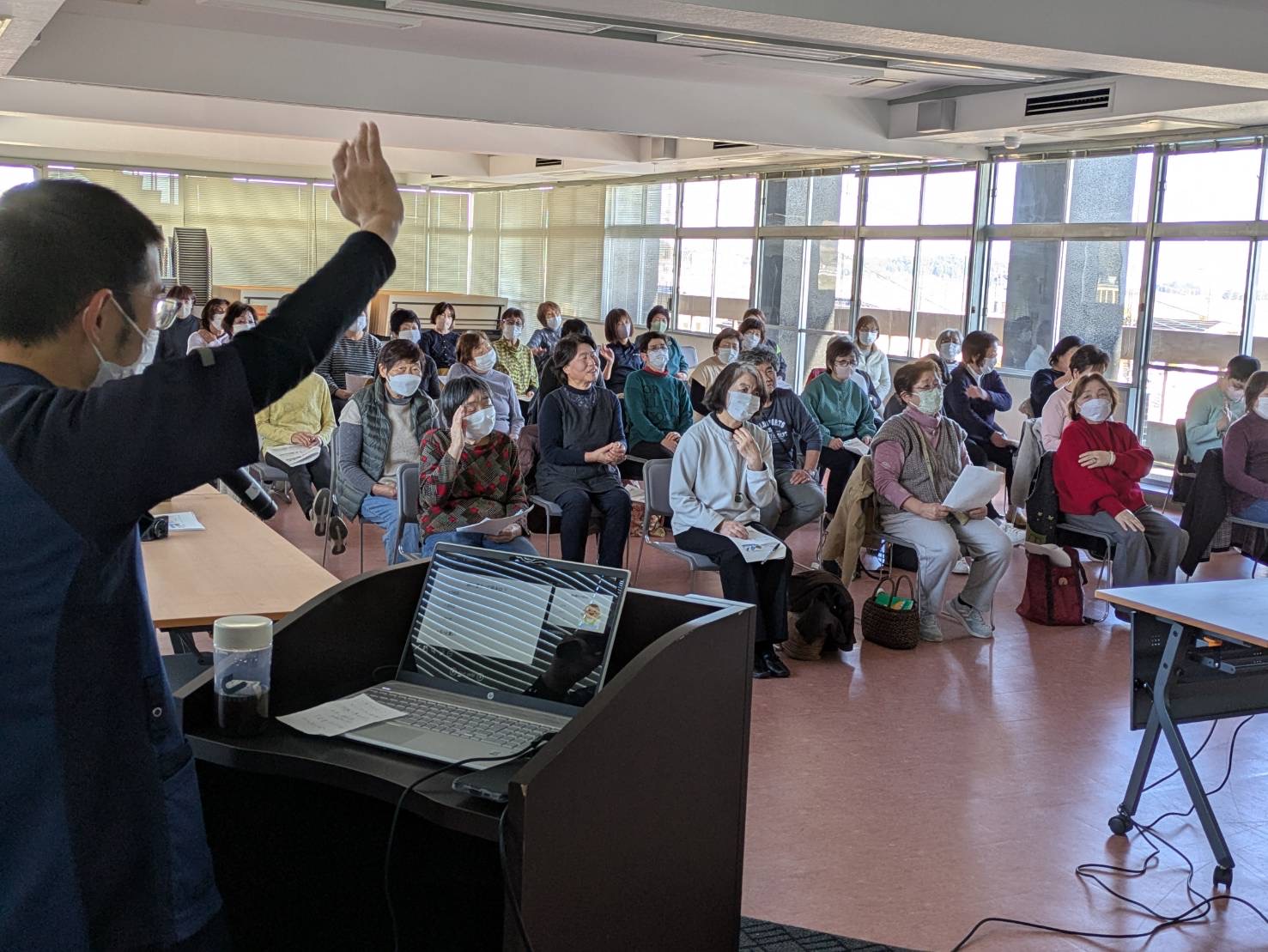 教室では、誤嚥しやすい食べ物と誤嚥予防トレーニングと題して管理栄養士の大塚香菜江さんが説明。肩こり・腰痛予防と題して理学療法士の古市泰士さんが講演しました。参加者は「日常生活の見直す良いきっかけだった」と笑顔で話しました。