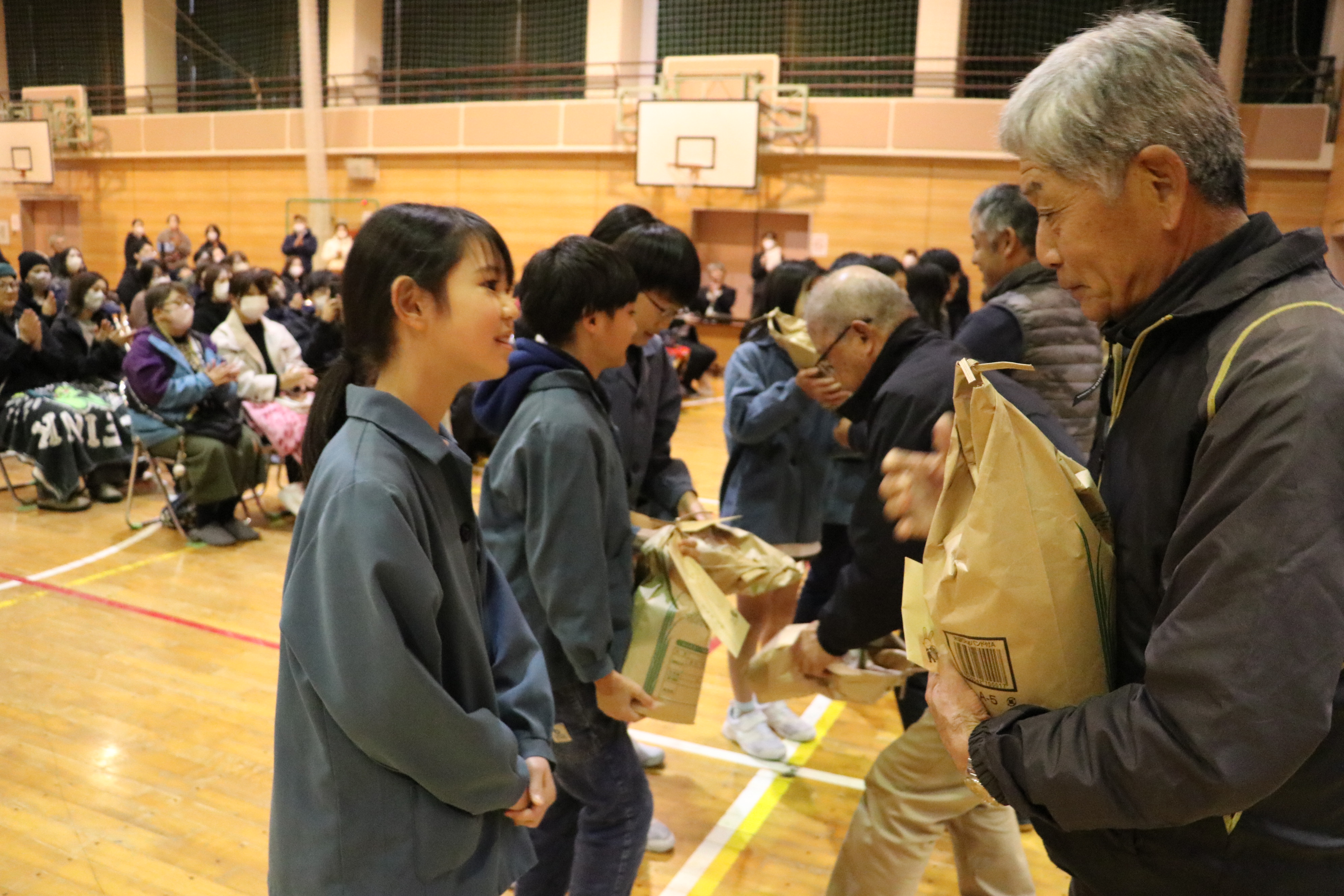 福島市立庭坂小学校の児童は28日、地域の農家が先生役を務めて米作りを学ぶ「ふるさと学習」で米について学び収穫した米を協力農家に贈呈して感謝を伝えました。
