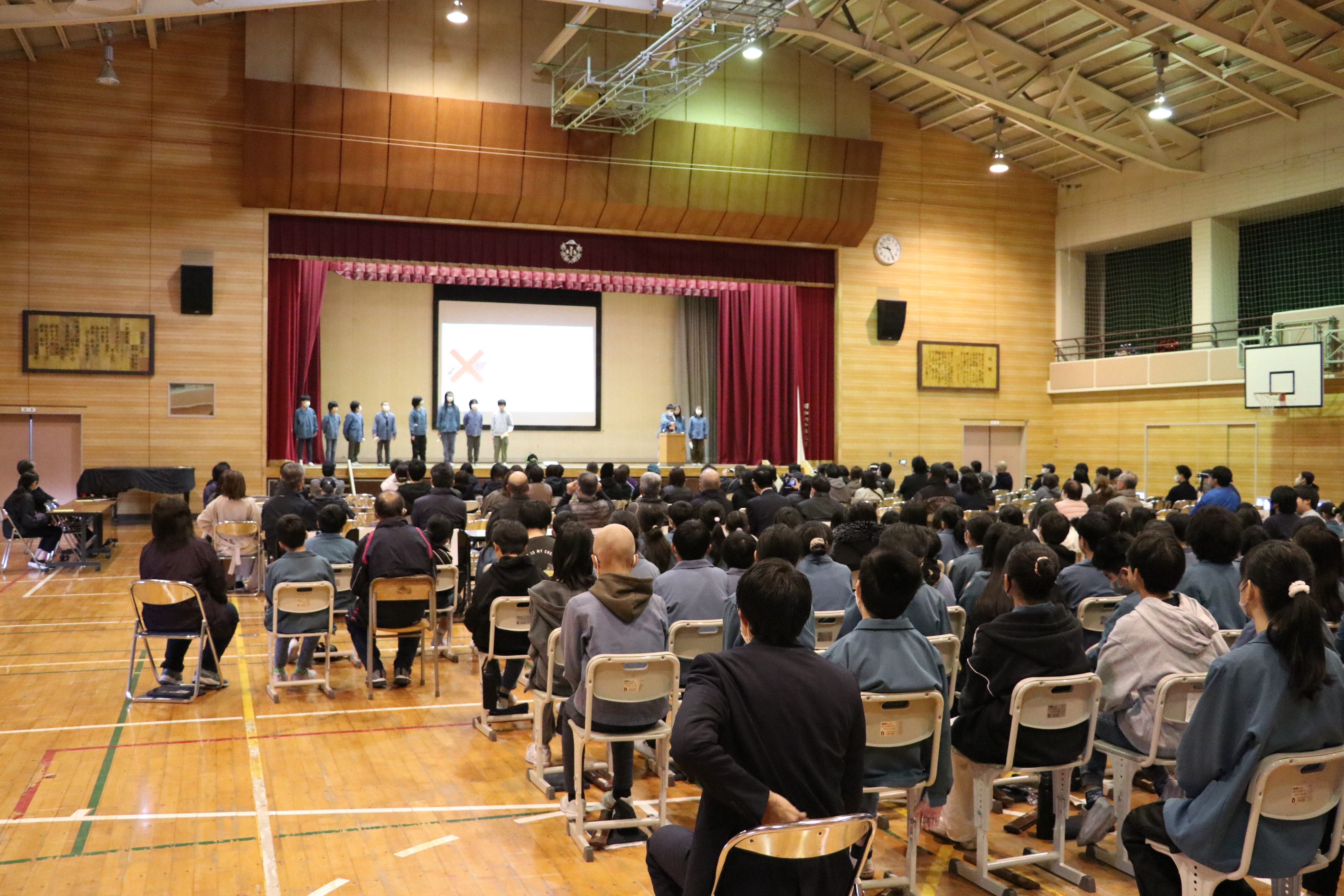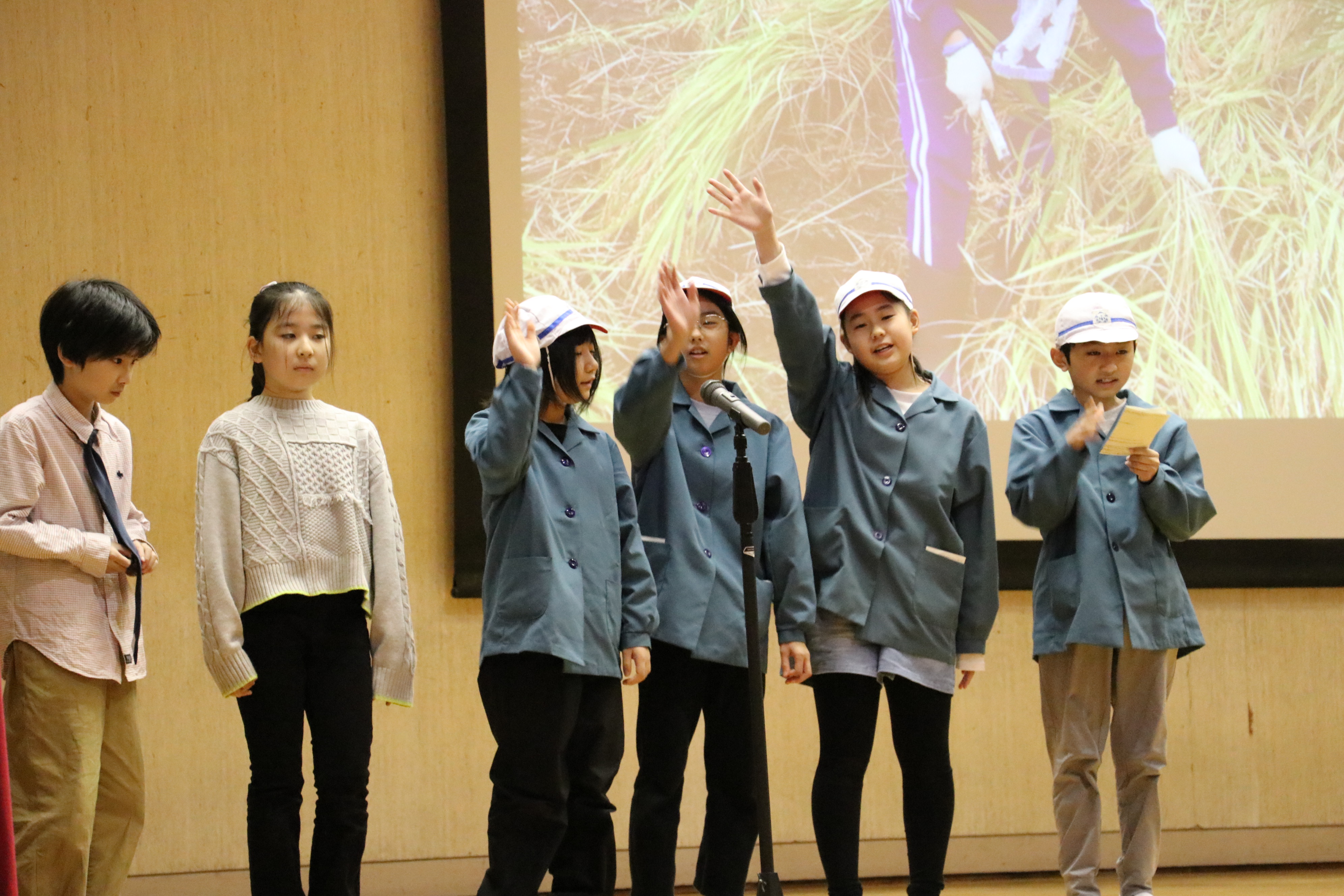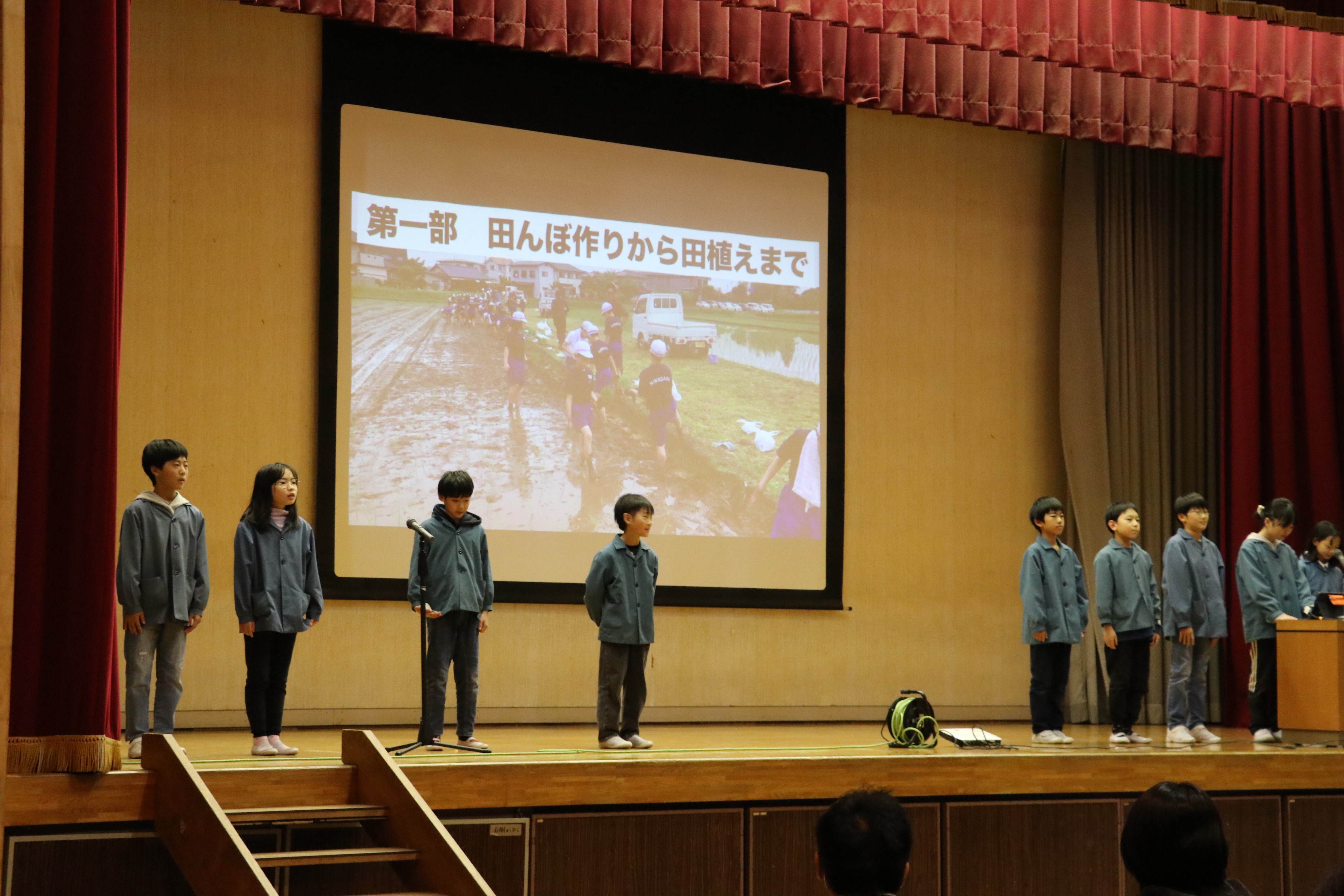 同校の米作りは6年目を迎え田植えから脱穀までを体験。活動内容を学習発表会で協力農家や地域住民、保護者約300人に発表しました。児童らは「おいしいお米を作るための農家の苦労を学ぶ事ができた。今後も米作りの伝統を守るために協力してほしい」と呼びかけました。
