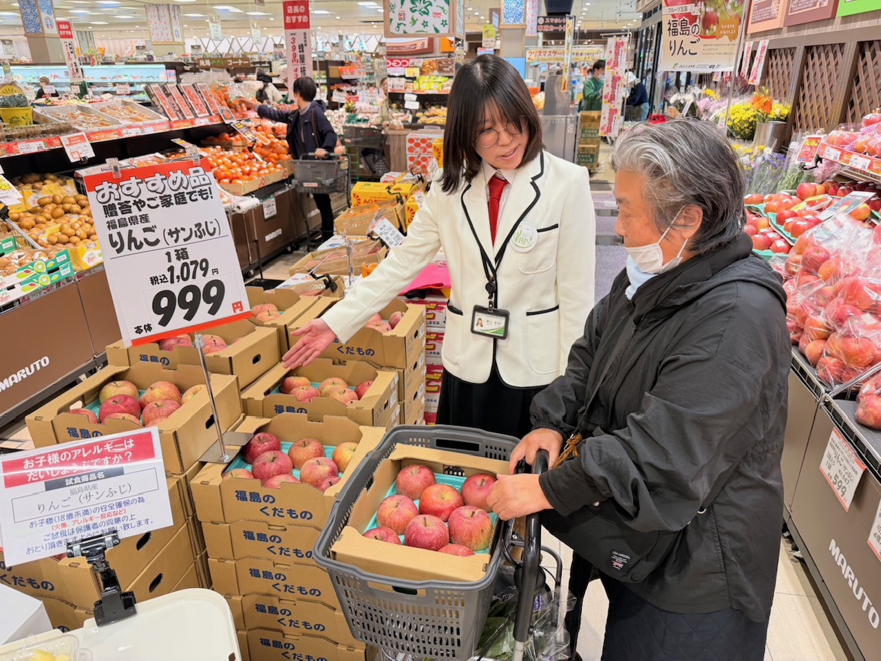 JA福島地区の末永喜広役員代表、リンゴの営農指導を担当する佐藤健児職員、農畜産物PR隊「J―FAP」の関口涼花さんが参加。いわき市中央卸売市場やマルト平尼子店、マルト高坂店を訪れ、福島市産のリンゴのおいしさを宣伝しました。福島市産のサンふじを毎年楽しみに購入する人や、実際に試食しておいしさを実感して購入を決める人など、多くの客でにぎわいました。