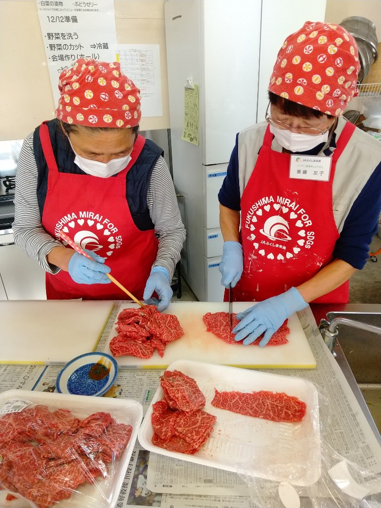 贈呈式は、12日に「よりそい食堂☘りょうぜん」で、19日に「よりそい食堂☘やながわ」で行われ、部会代表者から各食堂の代表者へ地元伊達地区で生まれ育った福島牛のモモ肉が手渡されました。贈呈された福島牛は13日、ビーフシチュー、焼き鮭、さつまいもの天ぷら、冬至カボチャ、大根の柚子味噌かけ、白菜の漬物、ぶどうゼリーを提供し来場者に 来年の干支「午年」にちなみ、折り紙で折った「馬」をプレゼントしました。