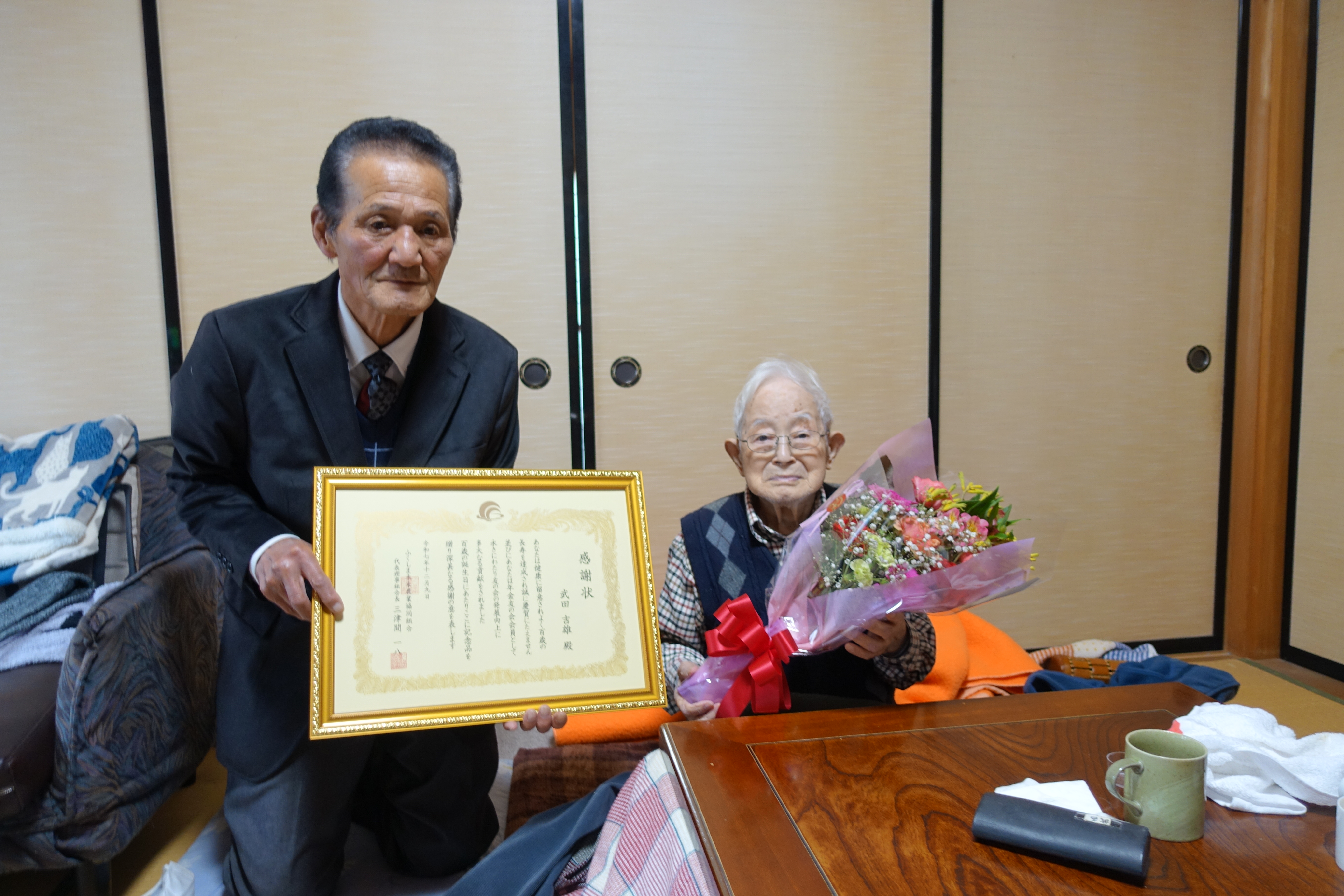 年金友の会大玉支部の中塚敏夫会長が、賞状と花束と記念品を贈呈しました。吉雄さんはとても元気で過ごしているとのことで、お祝いの訪問を大変喜んでいました。