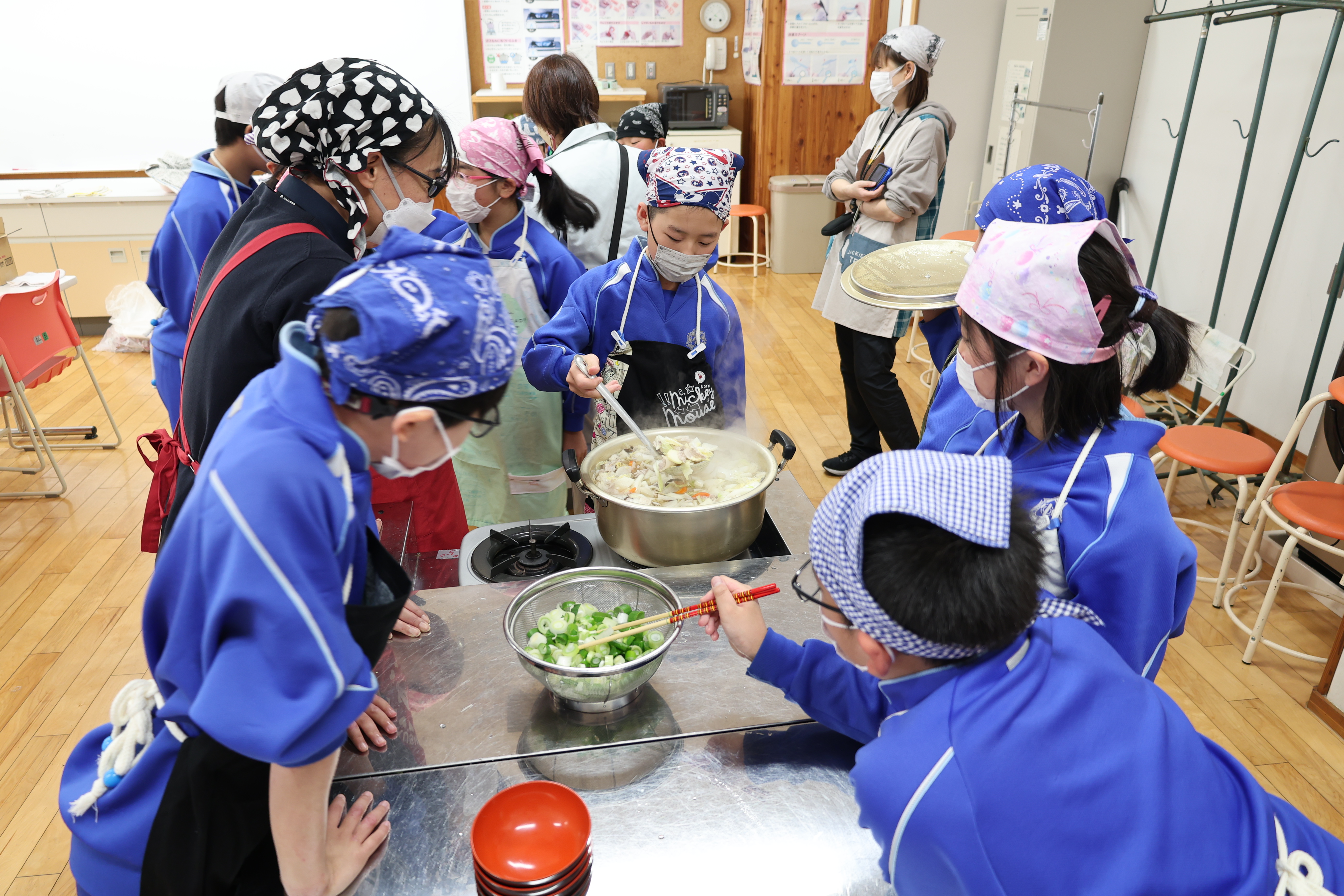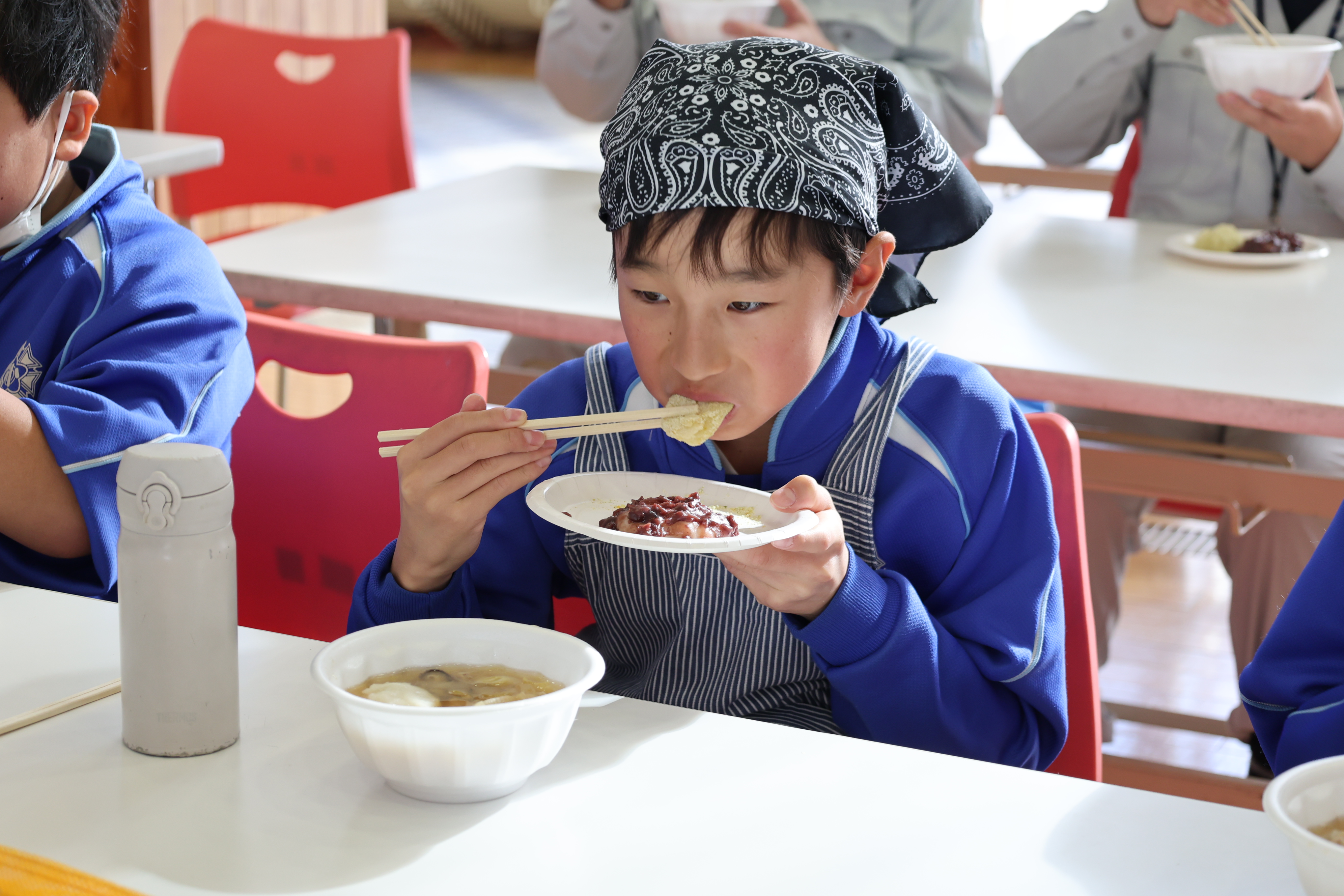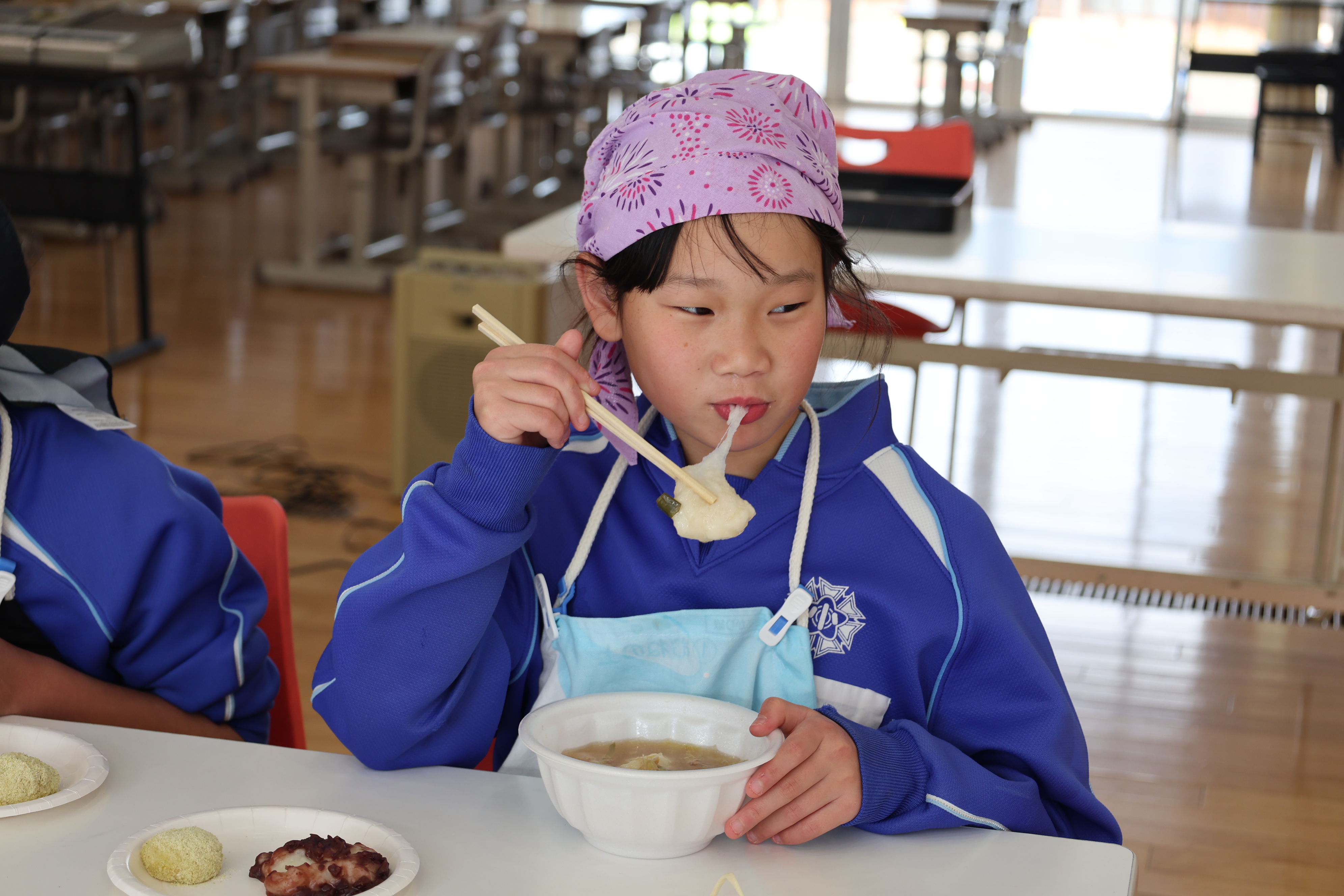出来上がった餅と一緒に、地元産の野菜を持ち寄って作った豚汁も用意。JA東和資材店の阿部道夫店長による米に関する講話も行われ、児童は食と農の大切さを実感しながら味わいました。