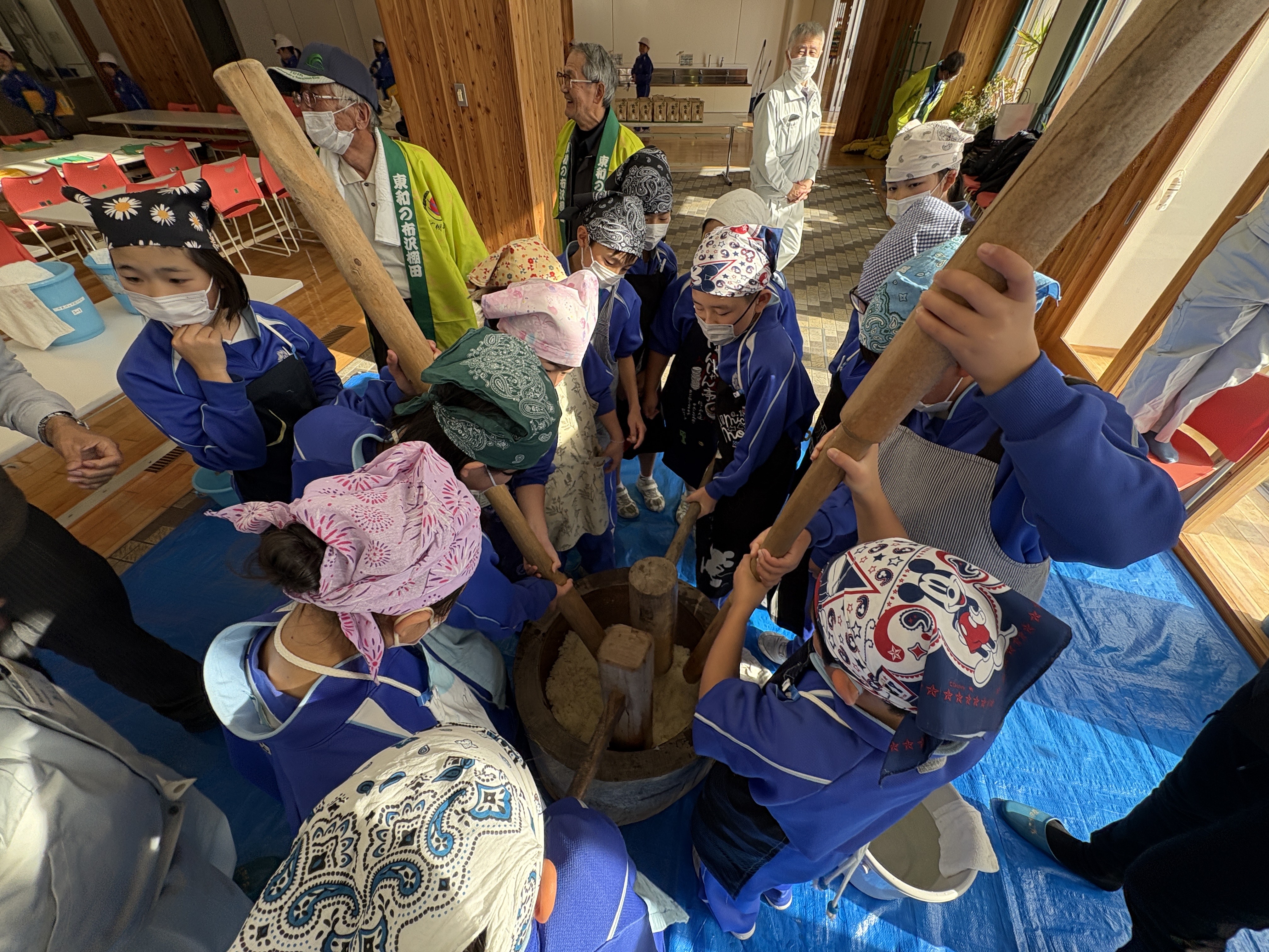 収穫祭では、自分たちで育てたもち米を蒸して餅つきに挑戦。児童のサポートをしてきた田んぼの学校や布沢の環境を守る会のメンバー、県北農林事務所やJA職員らと一緒に「よいしょ」の掛け声に合わせて大きな杵で餅をつきました。