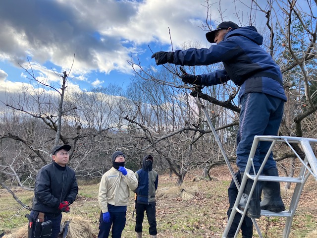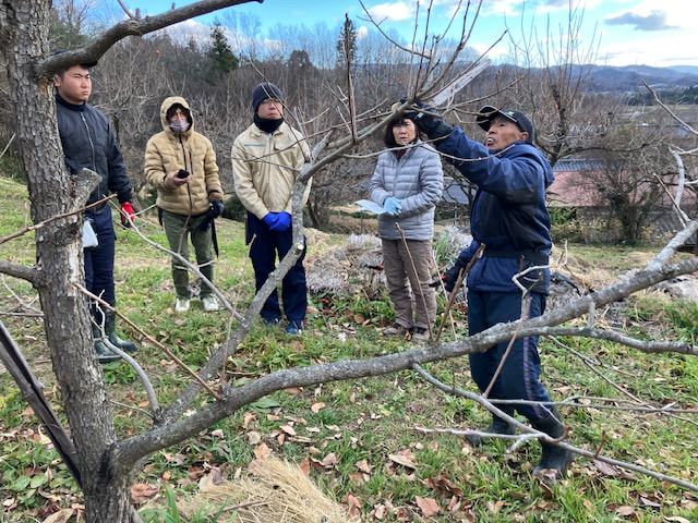 当JA伊達地区本部は18日、新規就農者や農業後継者を対象とした農業塾「あんぽ柿コース」を開きました。実習は同JAが委嘱する「農の達人」の宍戸里司さんの圃場(ほじょう)で行われました。