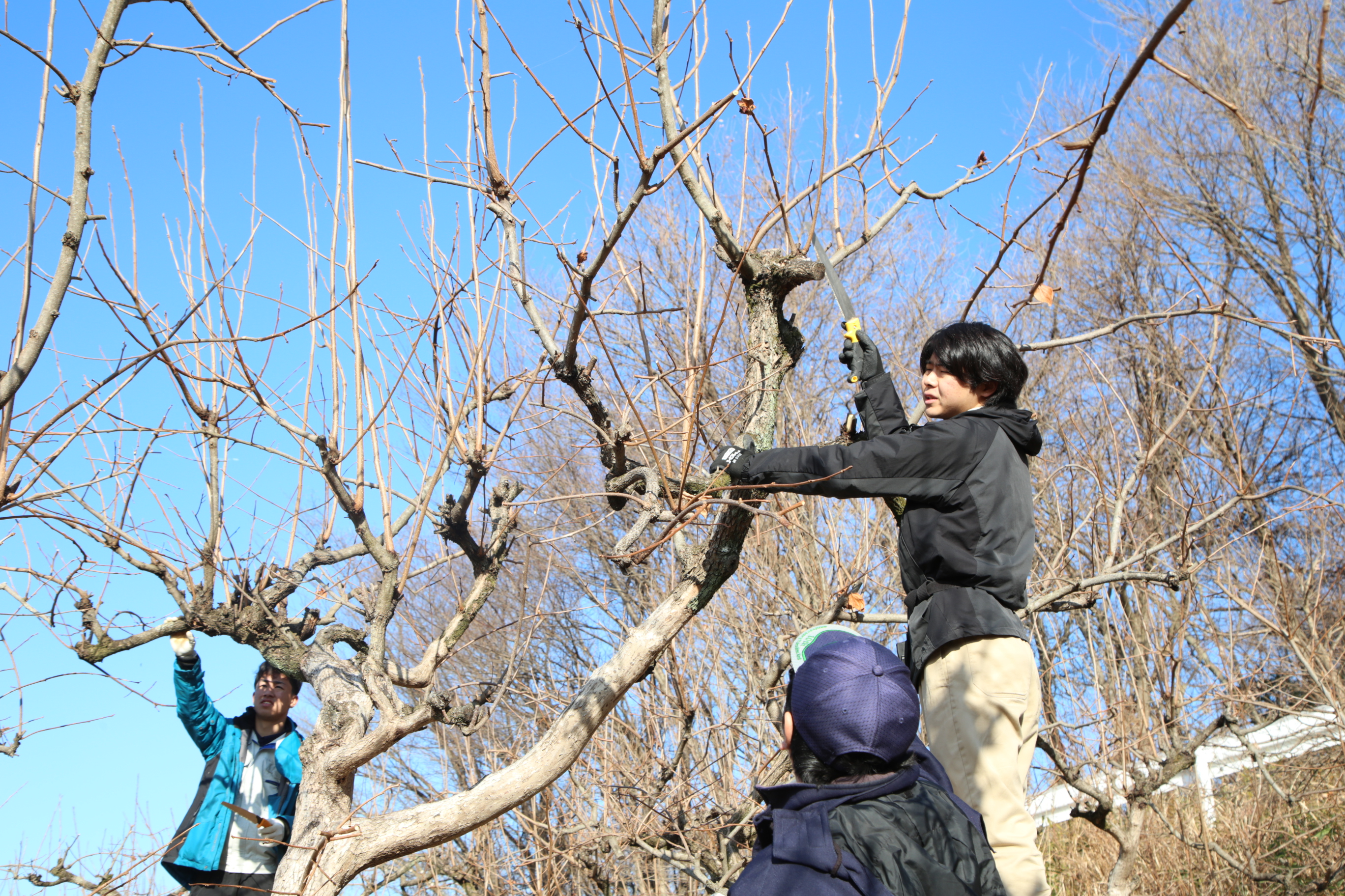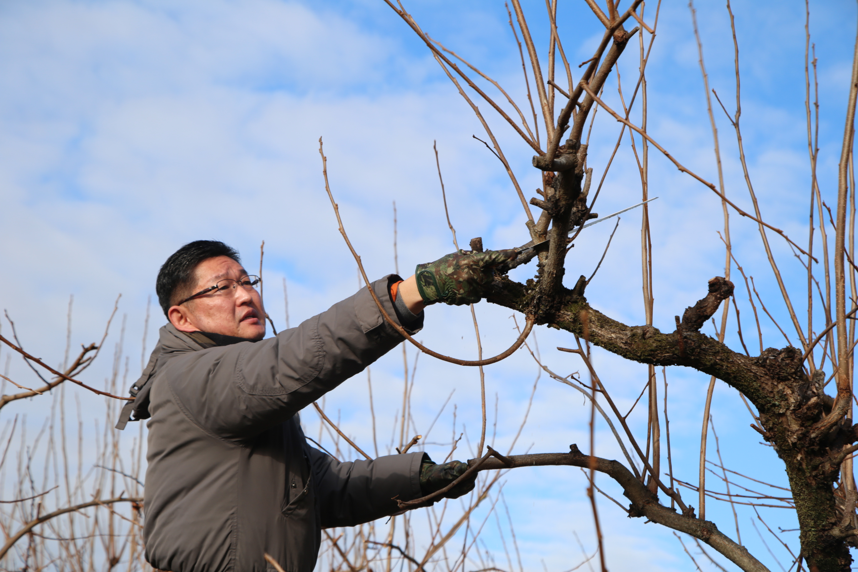 今回の研修では、遅延開心形を基本樹形とし、遠藤正弘営農指導員トレーナーの指導のもと、営農指導員5人が実践的に整枝・剪定作業に取り組みました。