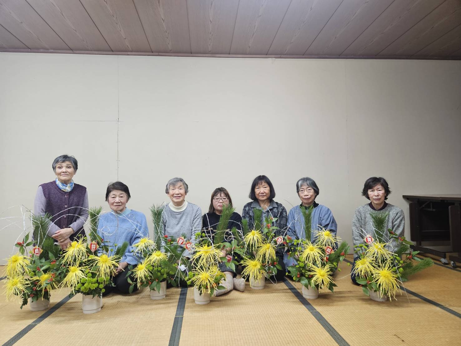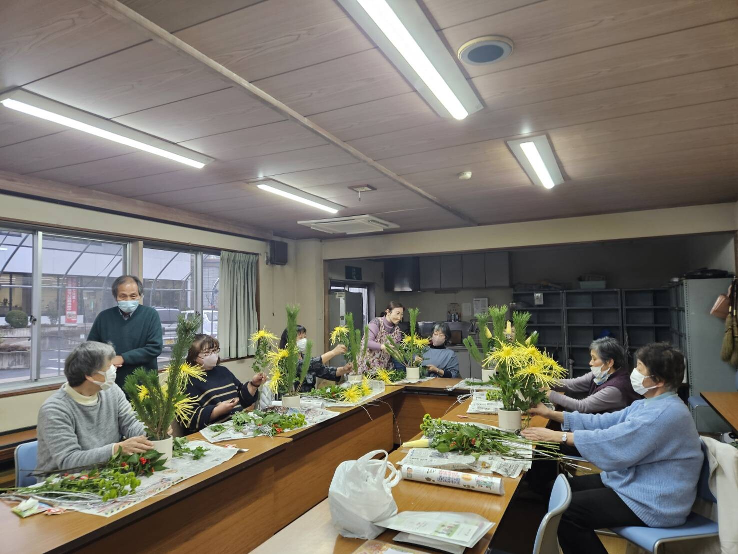 当JA女性部桑折総合支部は25日、桑折町でお正月用のフラワーアレンジメント教室を開きました。霊山町の花の店伊東から講師を招き、部員9人が参加しました。松や糸菊、南天などお正月らしい色とりどりの花材を使い、新年への願いを込めてアレンジメントを楽しみました。参加者は「良い新年が迎えられそう」と話しました。