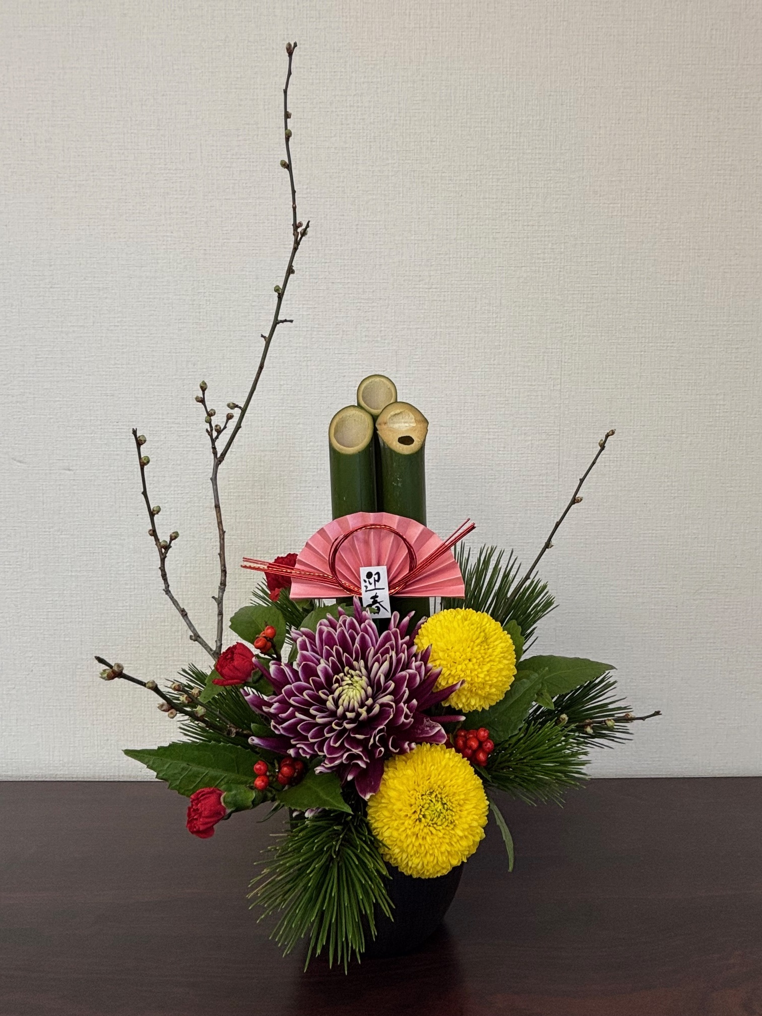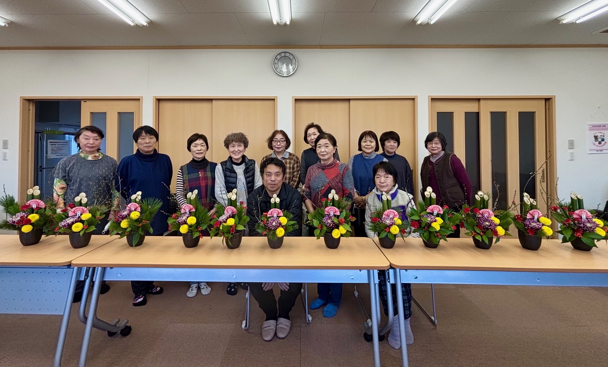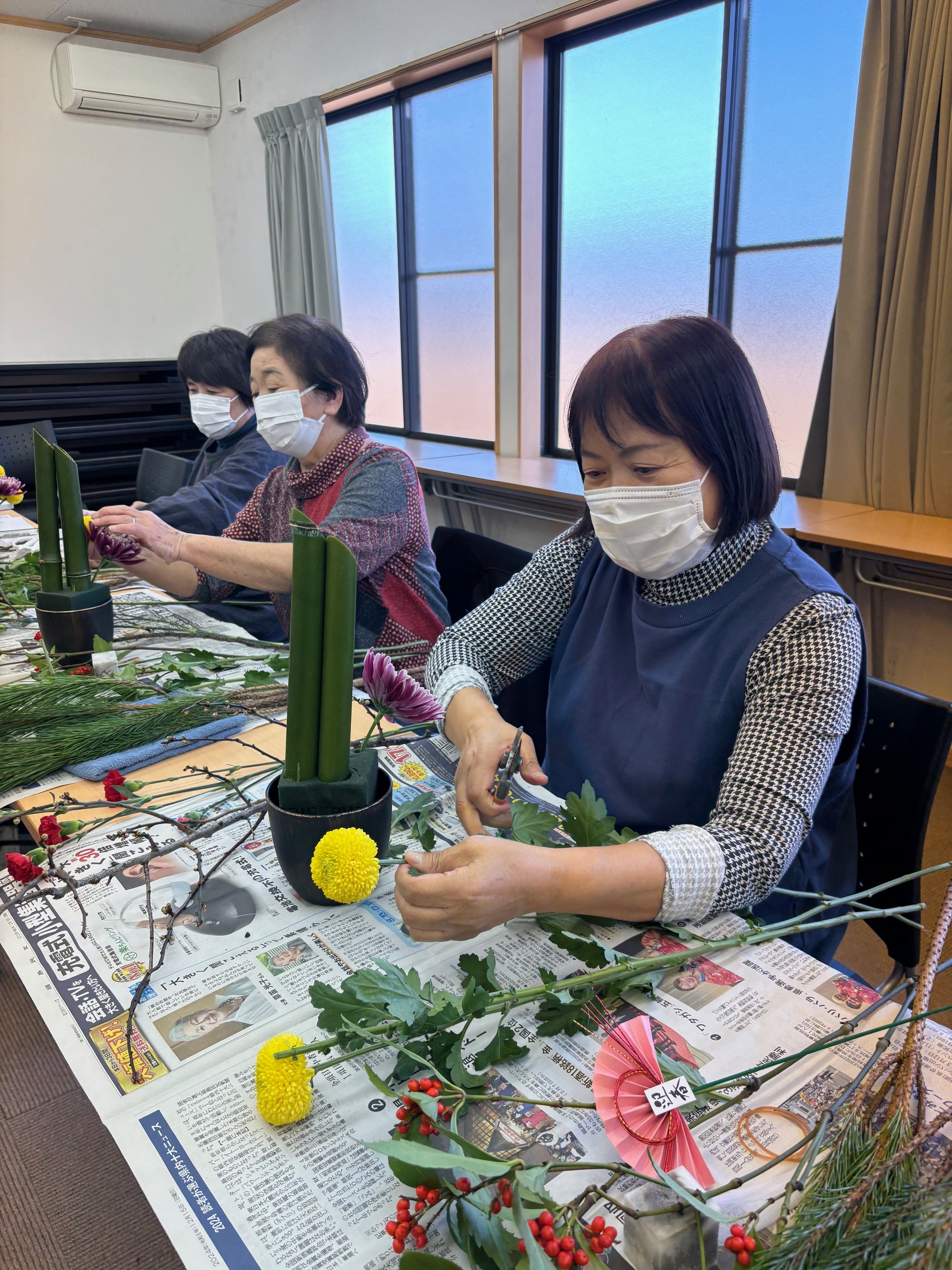 二本松の生花店「花のチカミ」の近見豪人さんを講師に迎え、部員11人が思い思いのミニ門松を作りました。加藤明美支部長は「良いお正月が向かえられるよう素敵な作品を作りましょう」とあいさつしました。参加者は門松を作りながら、松竹梅が縁起が良いといわれている理由や使用したマム(菊)の栽培方法を学びました。