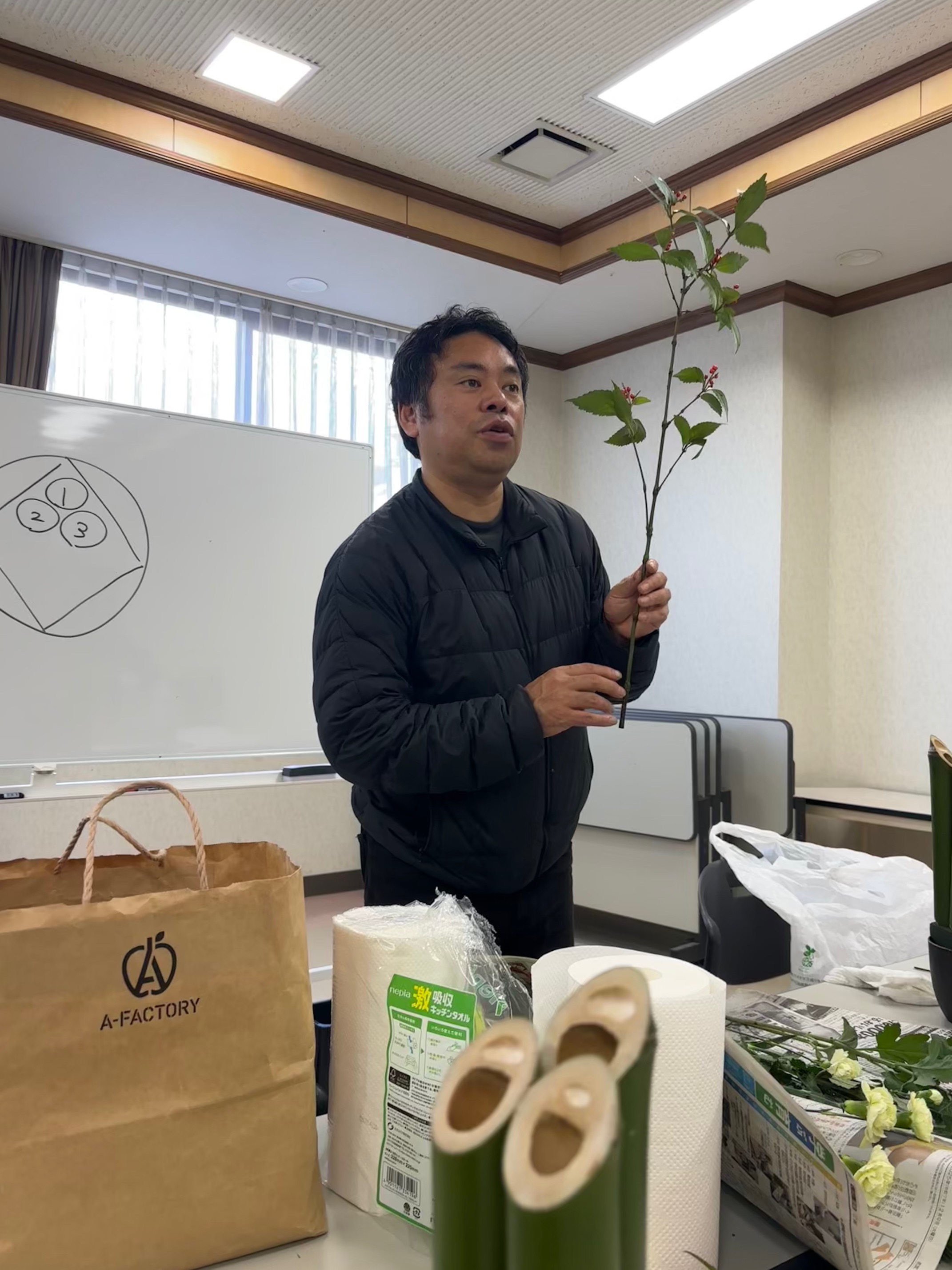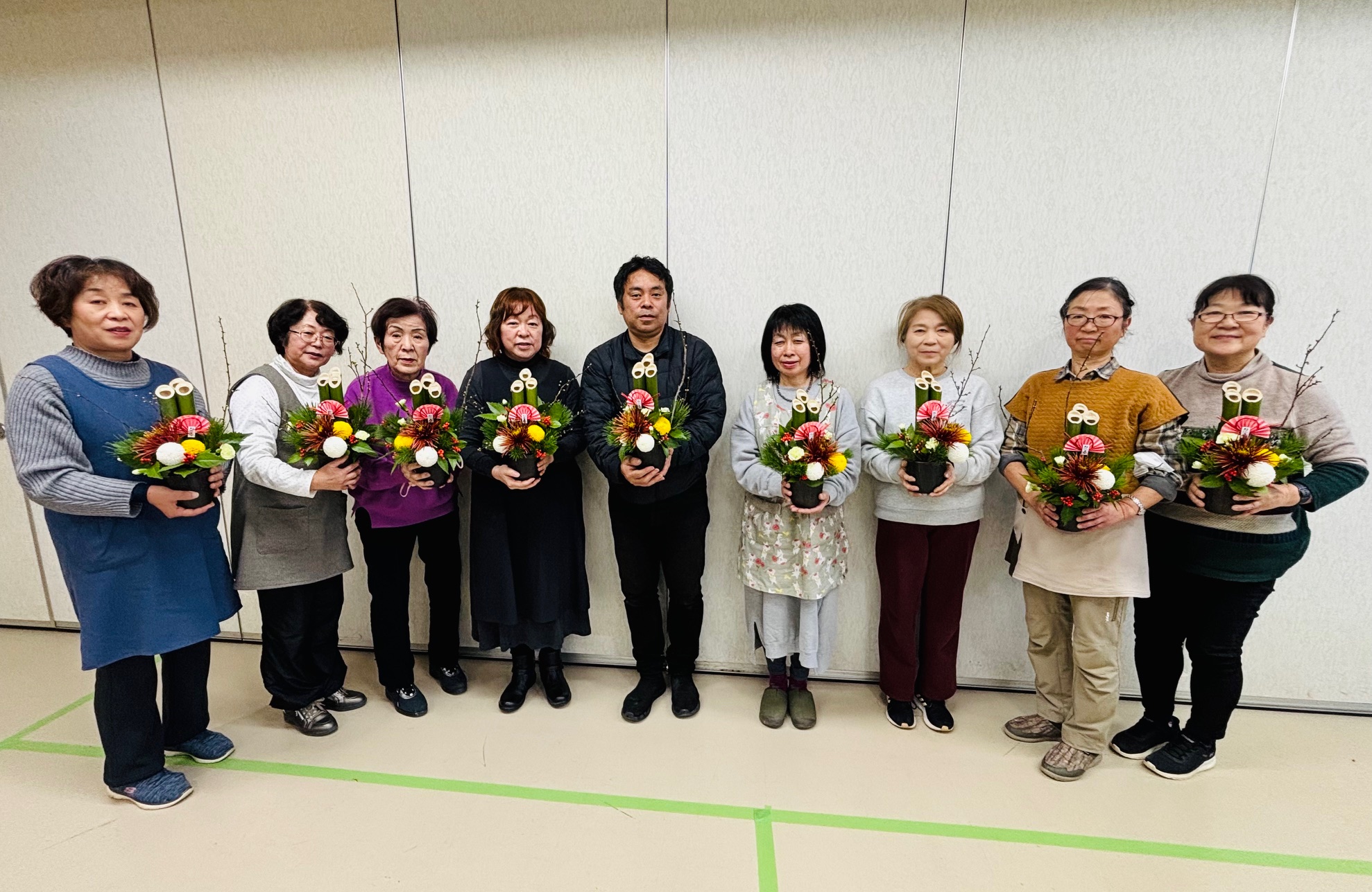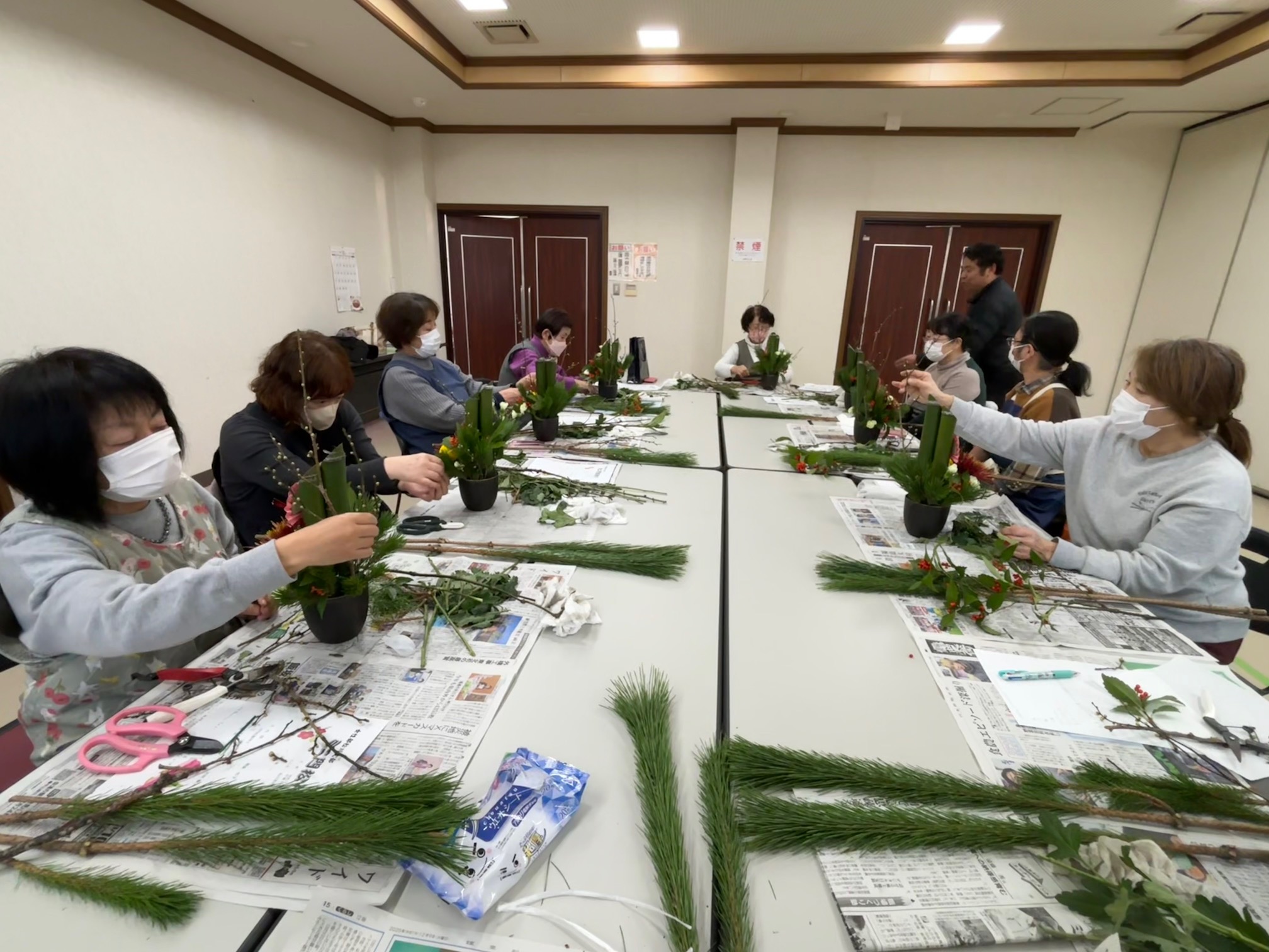 当JA女性部松川支部は22日、花のチカミの近見豪人さんを講師に招きミニ門松を作りました。松竹梅やディスバットマム、千両やカーネーションを花材として使い制作。松川支部では「笑い竹を使いたい」という要望もあり、作品に取り入れました。参加者は、松は神様の依代で、その後は鏡餅に鎮座し木槌でたたいて割った餅のかけらをお年玉としてこどもに配り無病息災を願ったことなどを学びました。近見さんのアドバイスも踏まえながら、オリジナルの門松を完成させました。参加した部員は「かわいらしいサイズで玄関に飾るのにぴったり。これで神様も来てくれる」と笑顔を見せました。