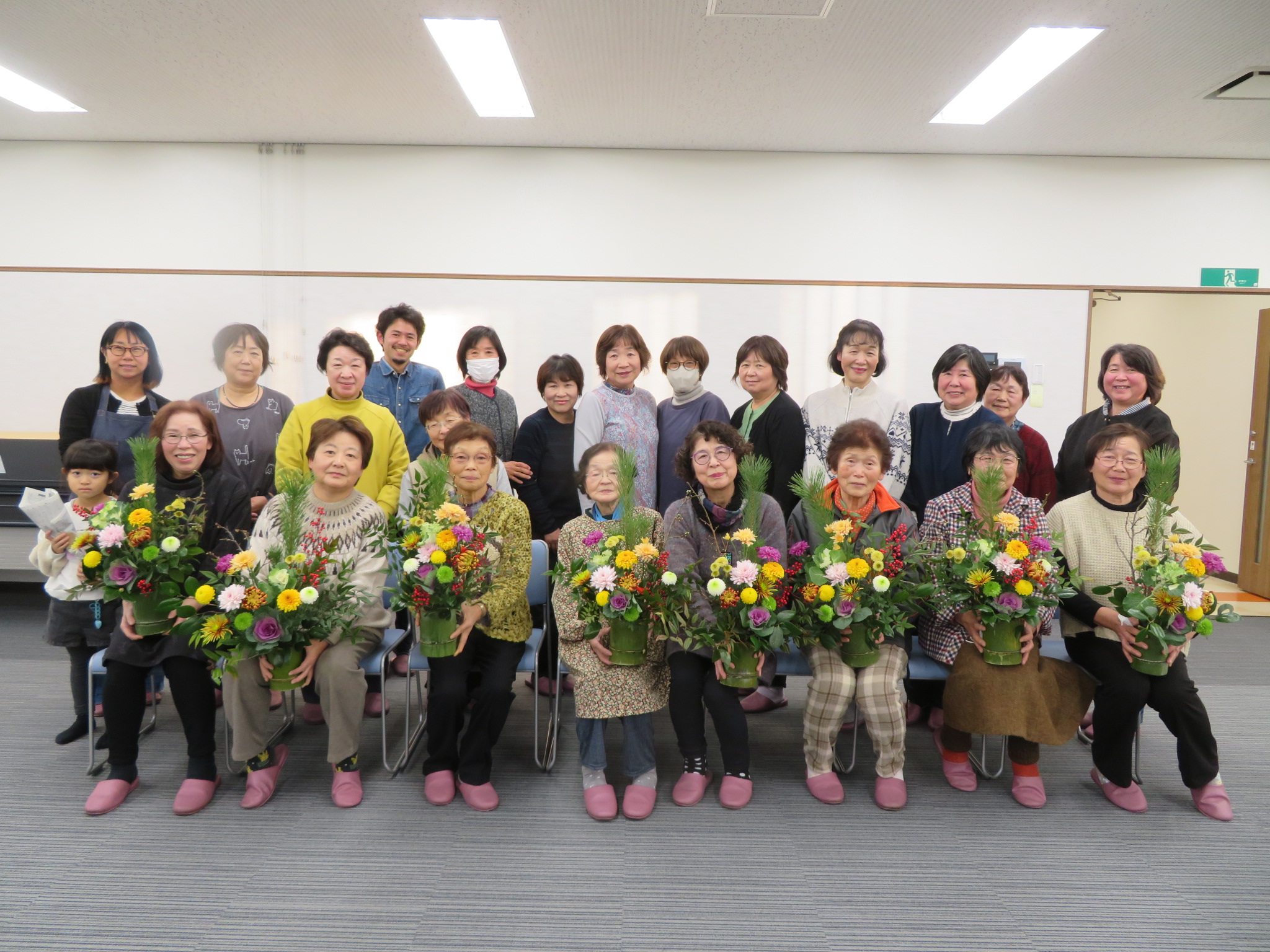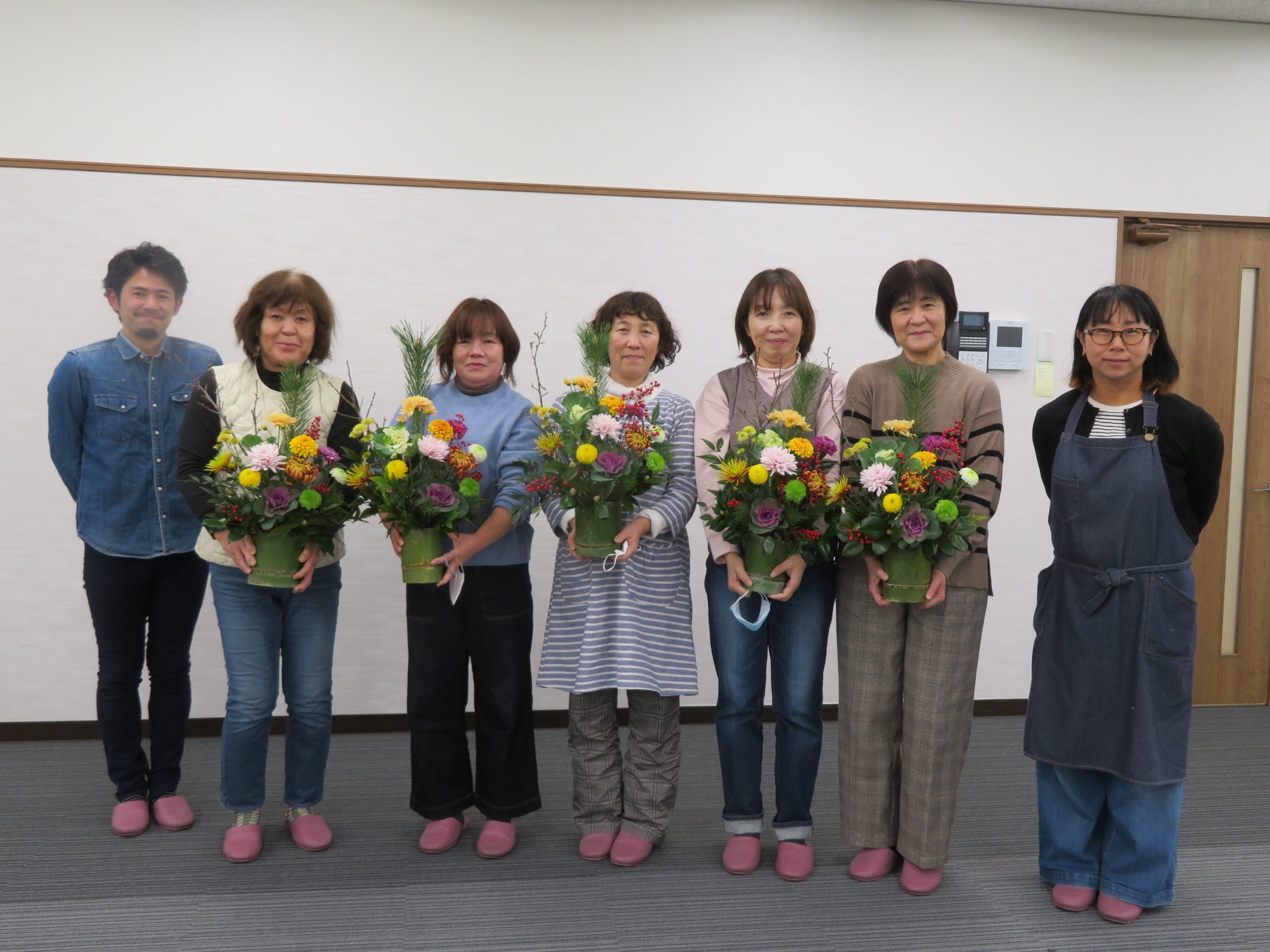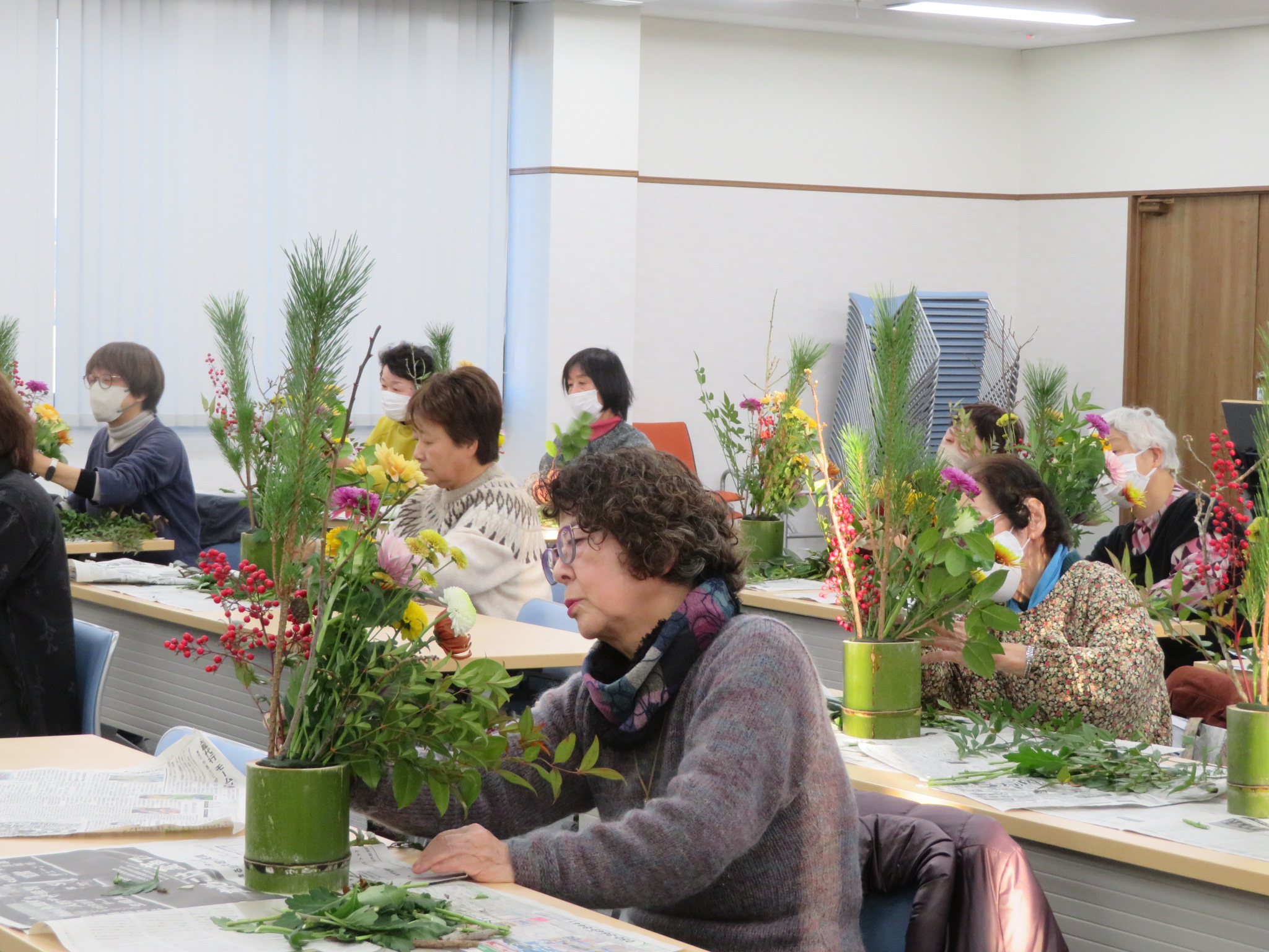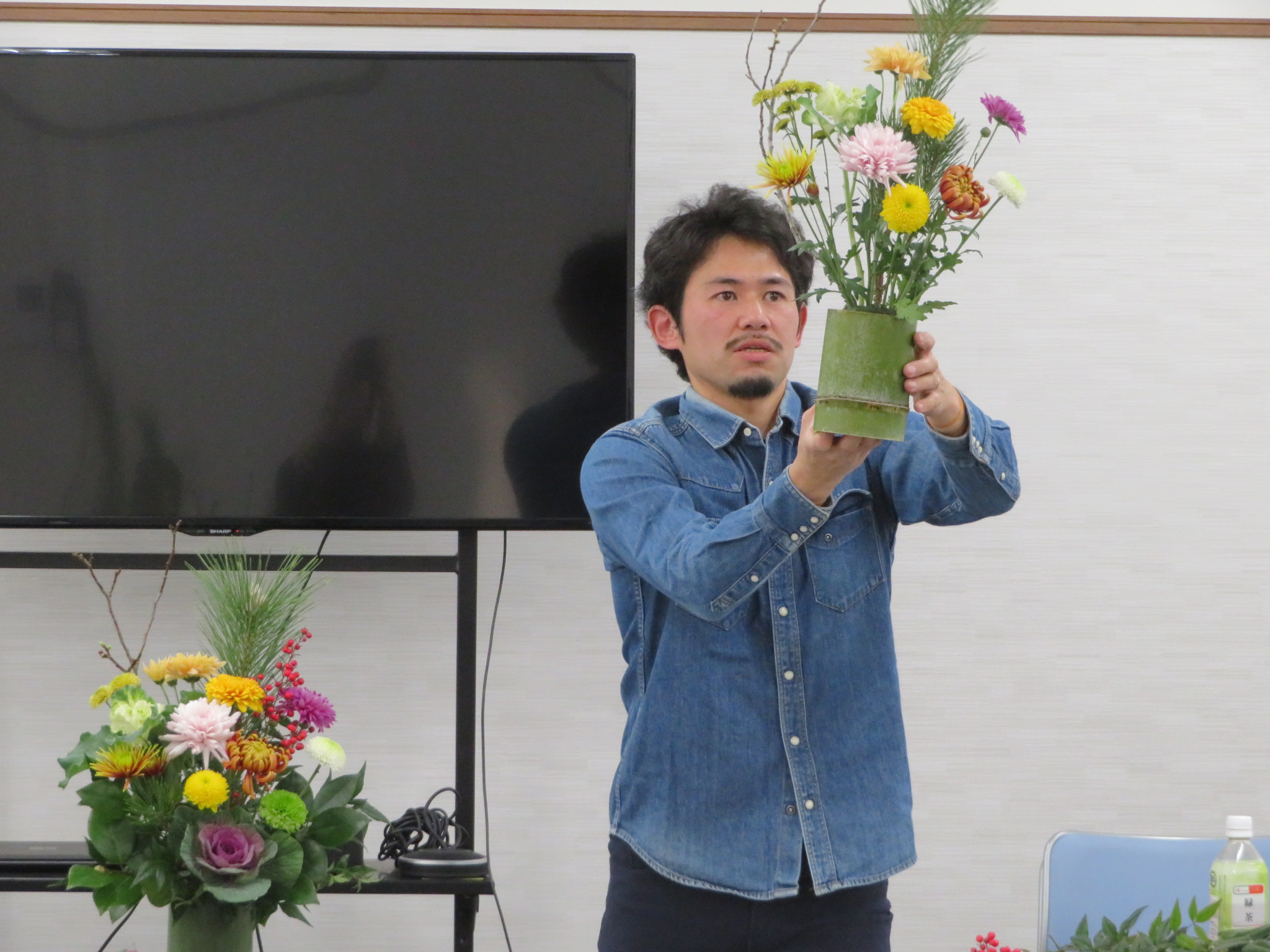 女性部員39名が参加し、講師に二本松市の武藤園芸を迎えて、竹筒の花器を使い松や梅、菊などお正月らしい花材で個性豊かなアレンジメントを作成しました。