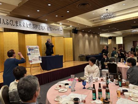 当JA伊達地区本部は15日、福島市のウエディングエルティで伊達地区女性部初笑いパーティーを開き部員やJA役職員103人が出席しました。同地区三浦順子部長とJA石上一成地区役員代表があいさつ。三浦部長は「何事にも情熱をもって笑顔で活動していこう」と呼びかけました。