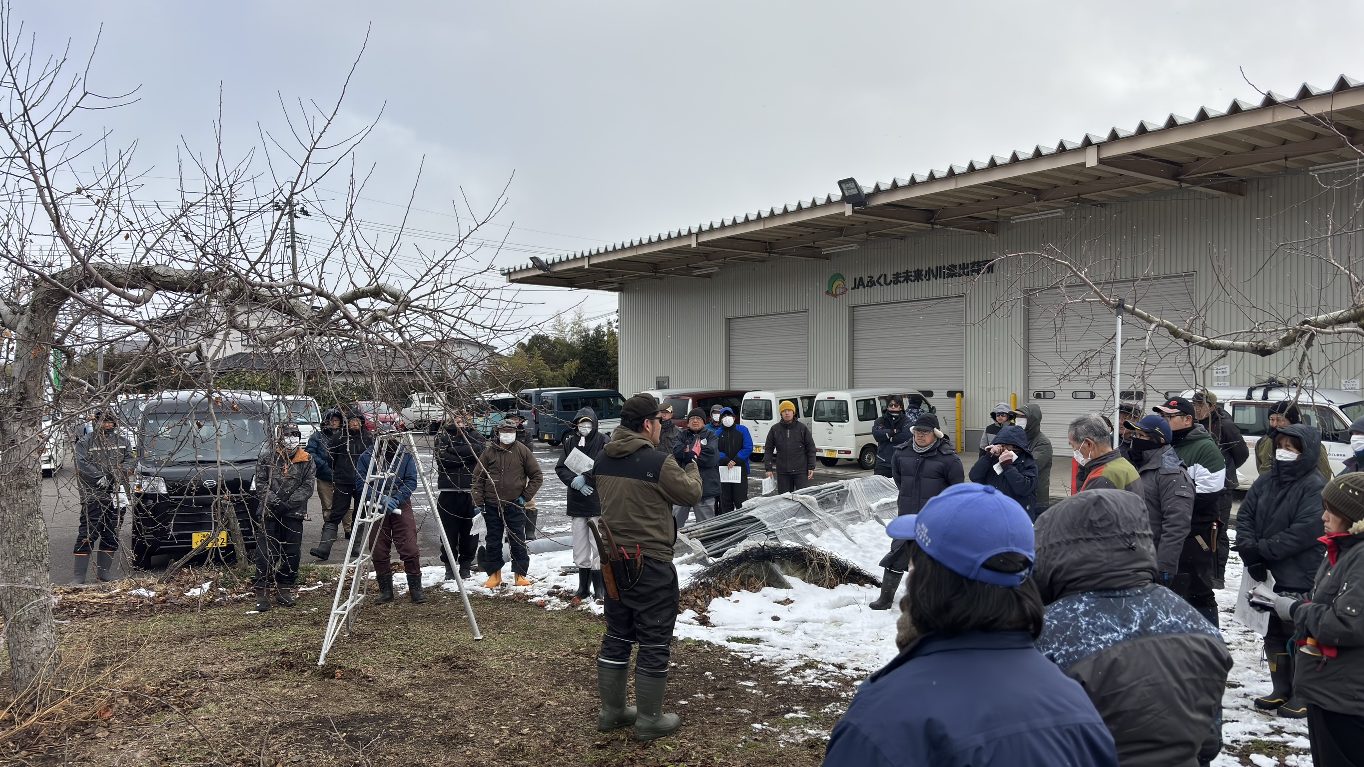 当JA福島地区本部は15日、就農5年以下のリンゴ栽培に新たに取り組む生産者を対象とした剪定指導会を初めて開催し、60人が参加しました。同地区では近年、新たにリンゴ栽培を始める生産者が増加しており、生産者からの要望を受けて今回初めて新規栽培者向けの講習会を実施しました。