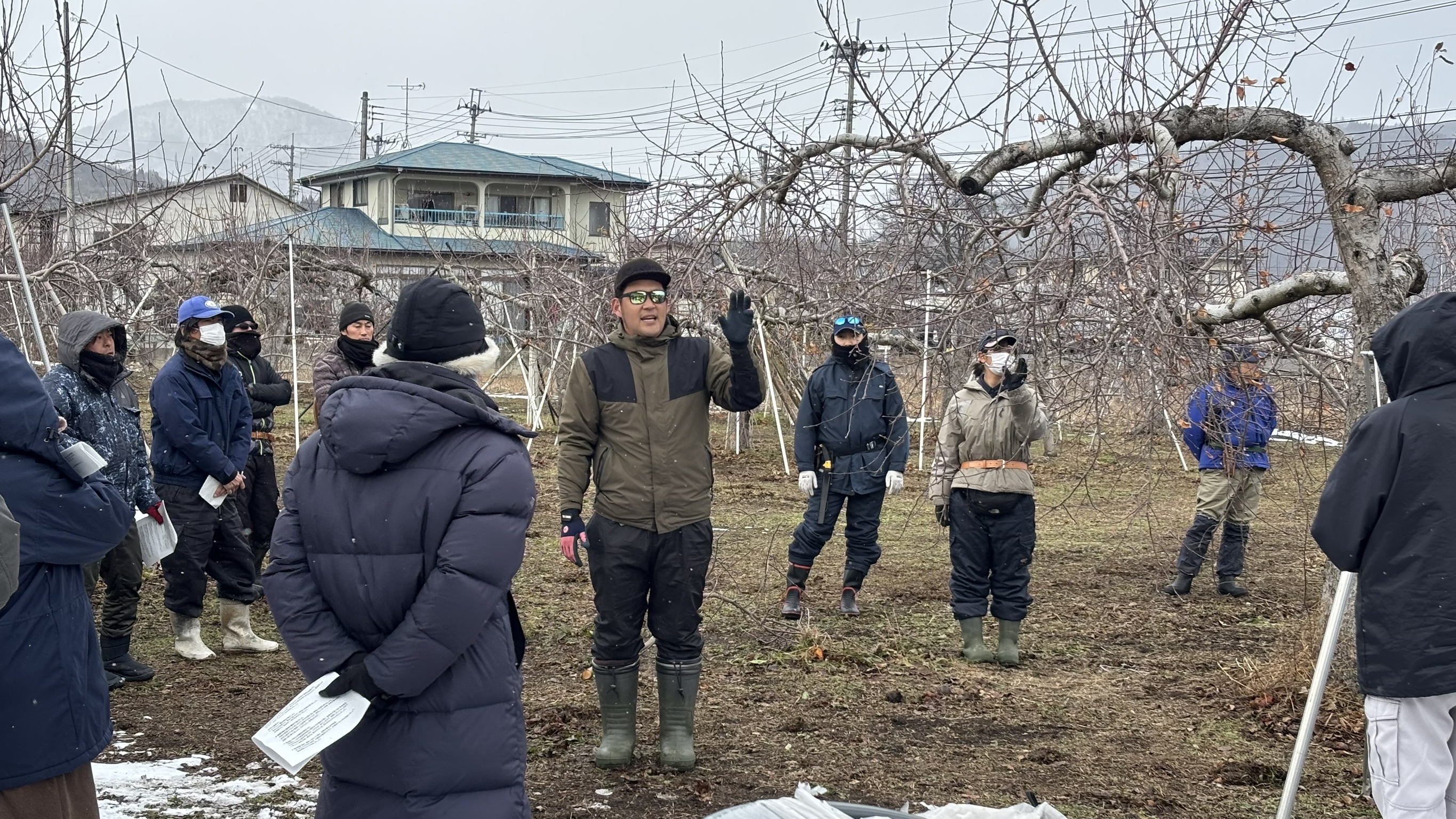 指導会では、JA飯坂営農センターの営農指導係佐藤健児さんが講師を務め、剪定する枝の見極め方や高品質なリンゴを育てるためのポイントについて、実演を交えて説明しました。佐藤さんは「剪定は今後の生育に大きく影響する。分からないことは積極的に質問し、実践に生かしてほしい」と呼びかけ、参加者は真剣な表情で耳を傾けていました。JAでは今後も新規栽培者向けの研修会を継続して開催する予定です。