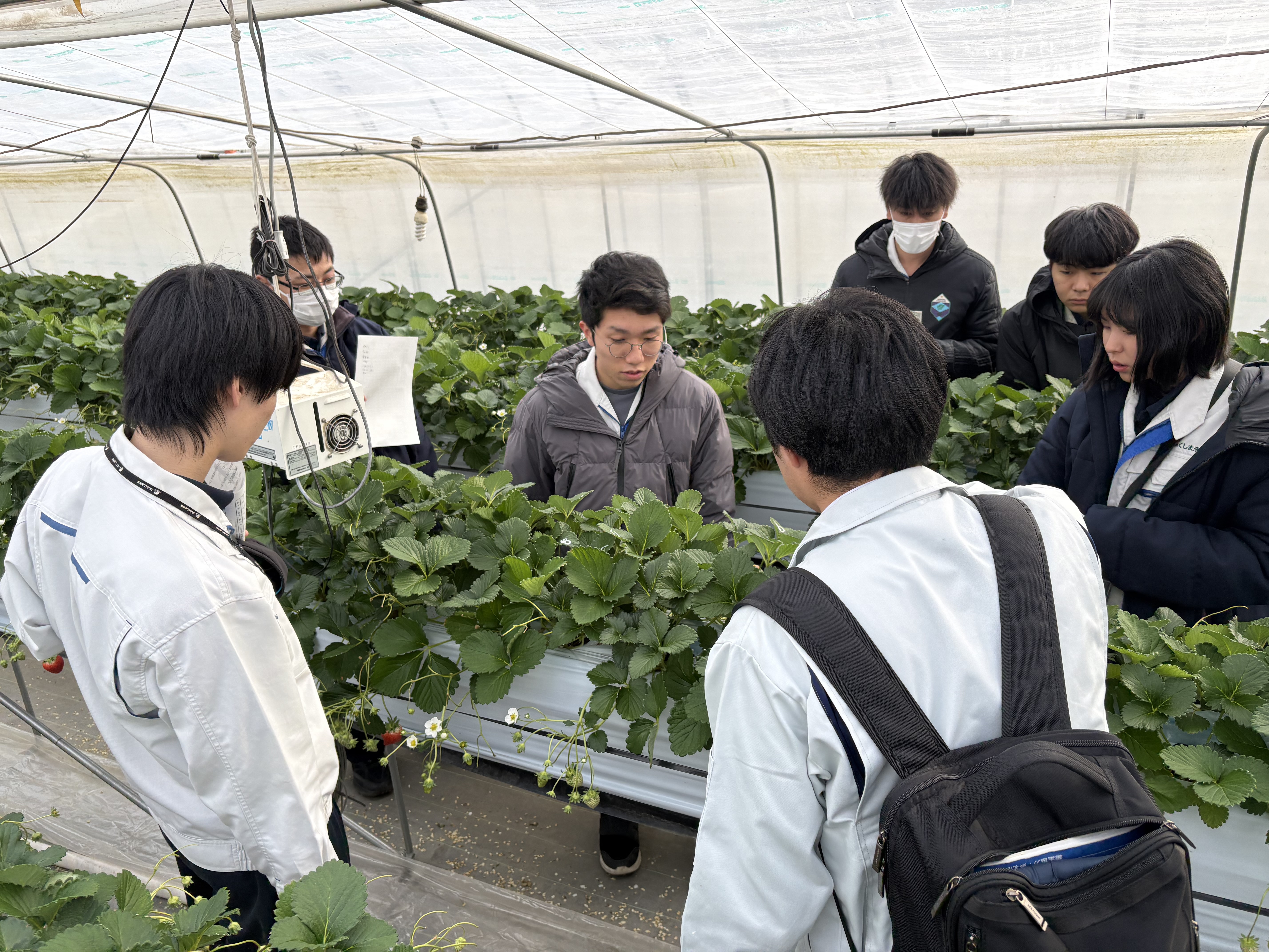 研修では、福島県県北農林事務所の担当者が生育調査の方法や、計測データから分かることについて説明。参加者は実際に圃場で調査を体験し、イチゴの成長や管理のポイントを学びました。