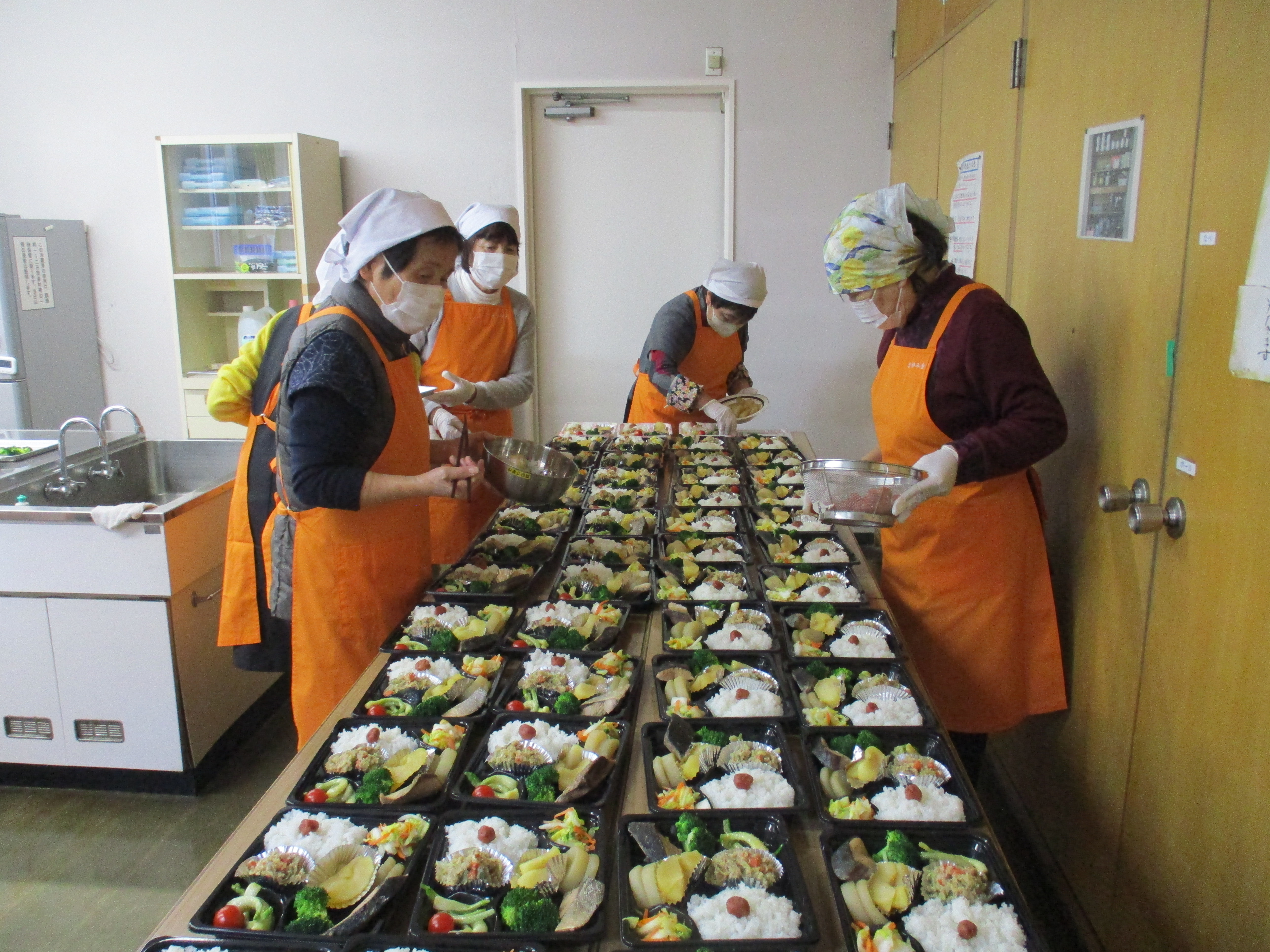 当日は会員12人が参加。地元の旬の食材を使い、ぶり大根やおから炒り、白菜漬け、浅葱の酢味噌和え、りんごのコンポートなど、栄養バランスに配慮した多彩なメニューを調理した。手作りの温かみが伝わる弁当は、地域の高齢者に毎年好評だ。